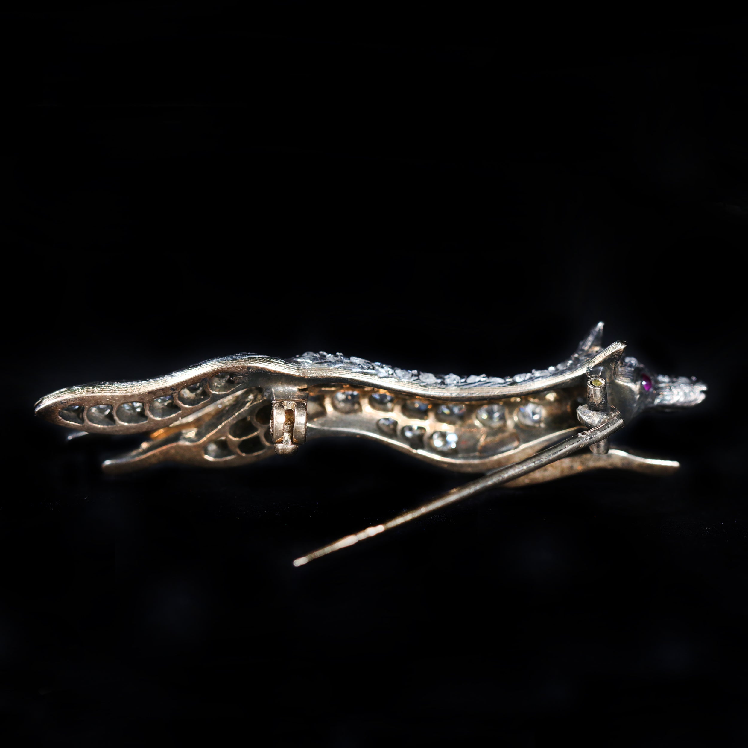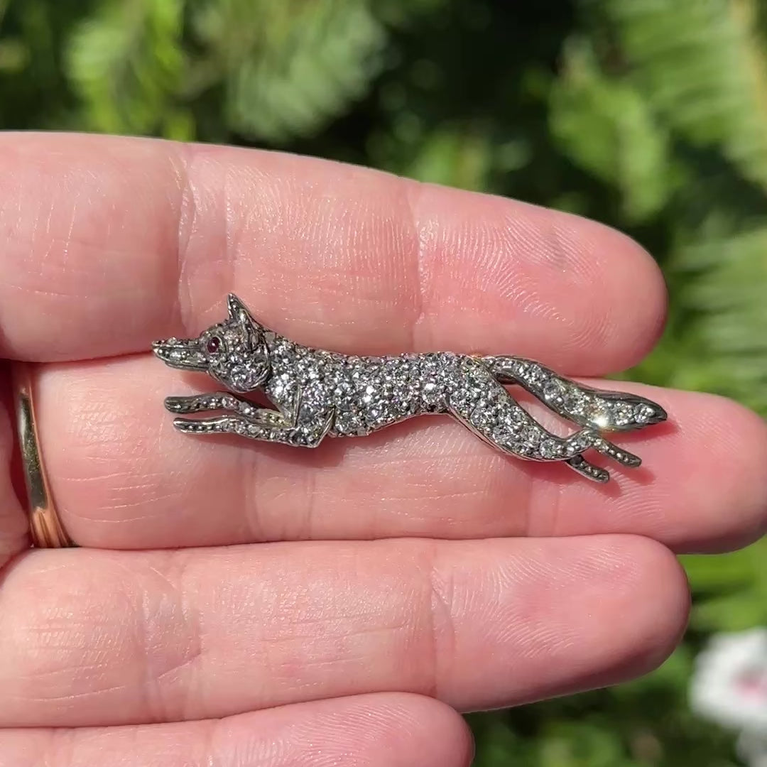 Capturing the Edwardian era’s love of elegant hunting motifs, where the fox symbolized wit, agility, and perseverance, this exquisite brooch depicts a leaping fox mid-chase. Its sleek form is pavé set with seventy-seven Old European cut, single cut, and rose cut diamonds, each stone arranged to subtly convey a sense of movement. Two vivid ruby cabochons form the fox’s watchful eyes, a subtle yet striking detail. Crafted in silver over yellow gold, this jewel reflects the artistry and naturalistic beauty so treasured in Edwardian design.