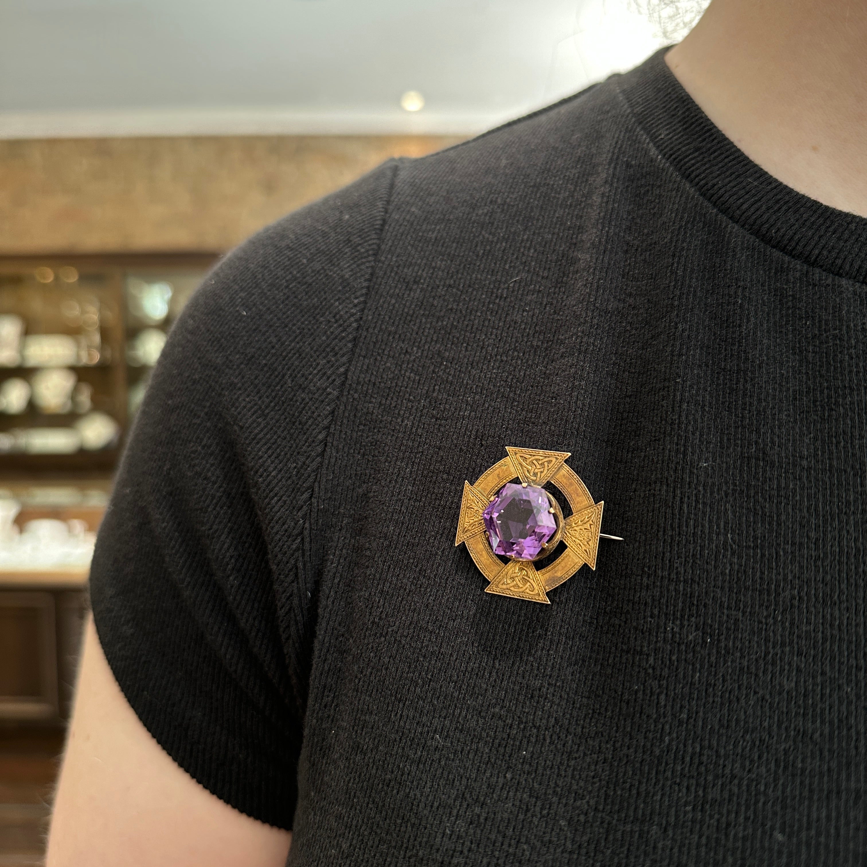 Scottish Victorian 14K yellow gold and amethyst brooch. This Victorian-era 14K yellow gold brooch is a striking piece of Scottish craftsmanship, made by "A.M" jewelers in Inverness, as indicated by the hallmarks. At its center rests a richly hued hexagon-cut amethyst, framed by a bold cross-motif mounting that reflects both Victorian design and traditional Celtic symbolism. Intricate Celtic knot engravings and decorative detailing cover the gold surface, adding texture, depth, and cultural significance. A beautifully made and meaningful piece, this brooch is a wearable tribute to Scottish heritage and 19th-century artistry.