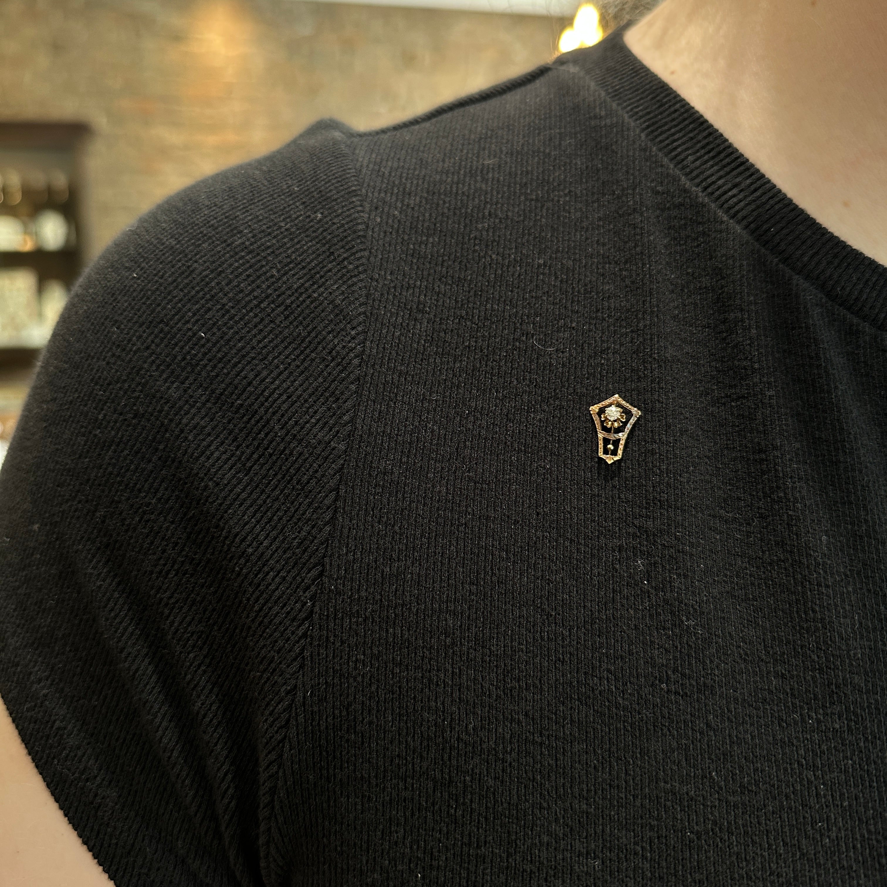 Victorian 14K yellow gold and diamond stick pin. A charming example of Victorian refinement, this yellow gold stick pin showcases a twinkling Old Mine cut diamond in a classic buttercup setting. The shield-shaped top is finished with delicate engraving and airy openwork, giving it a light, elegant feel. Beautiful on its own or converted to a pendant upon request, it’s a timeless piece with plenty of antique charm.
