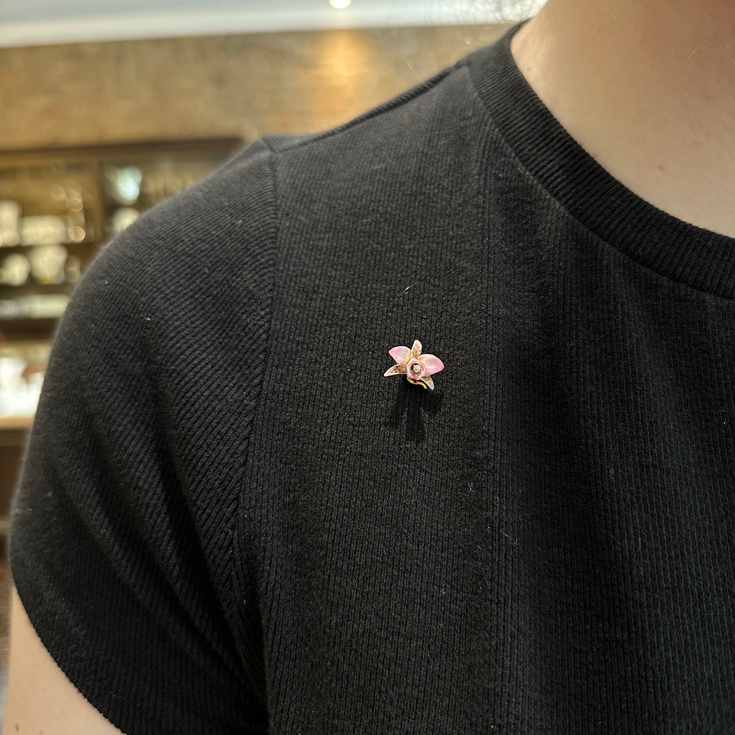 Victorian 14K yellow gold, diamond, and enamel stick pin. Dating to the early 1900s, this stick pin features a beautifully enameled orchid in delicate shades of pink and yellow. The petals are painted with remarkable detail, capturing the lifelike softness and depth characteristic of fine turn-of-the-century enamel work. At the flower’s center rests an Old Mine cut diamond, adding a subtle sparkle to the organic form.