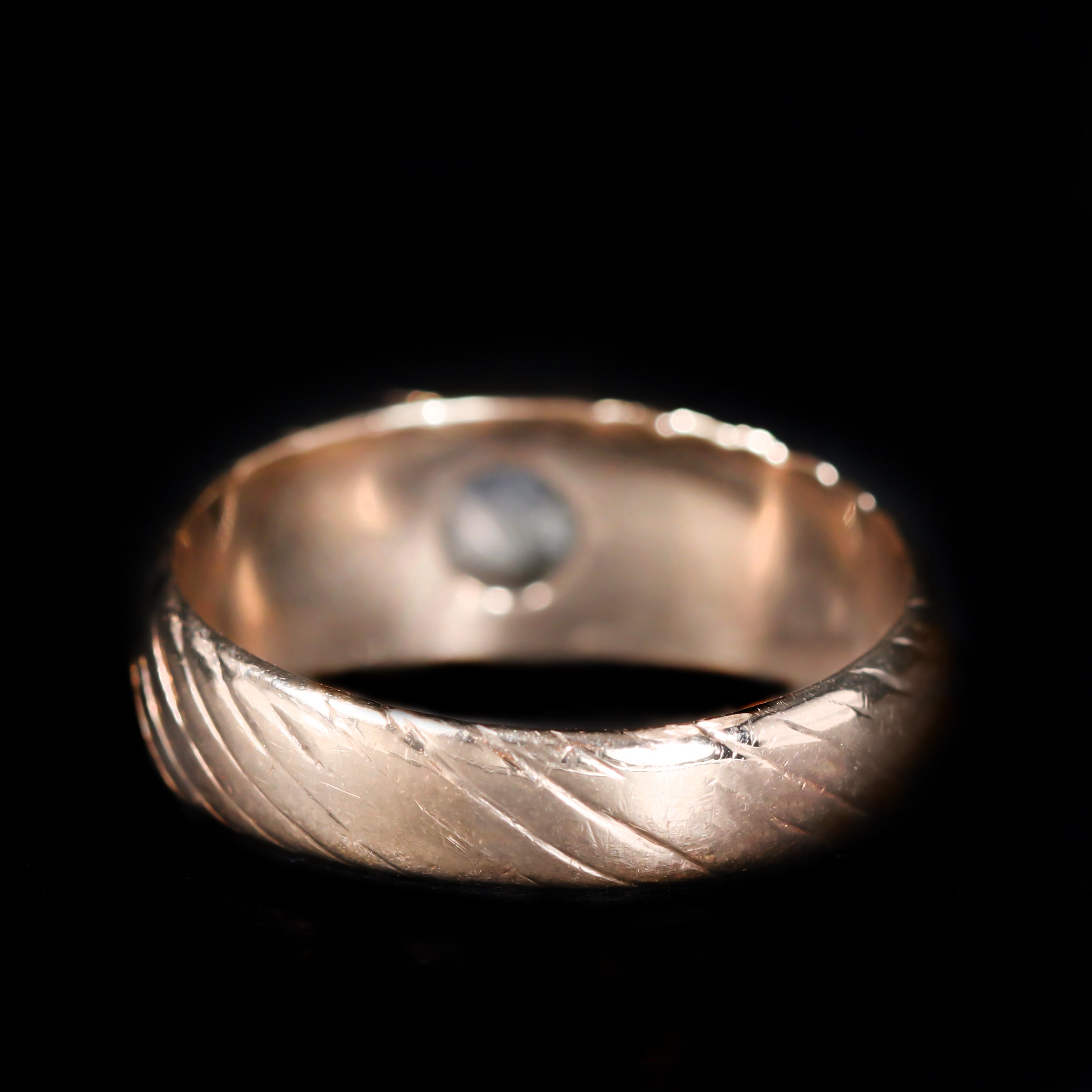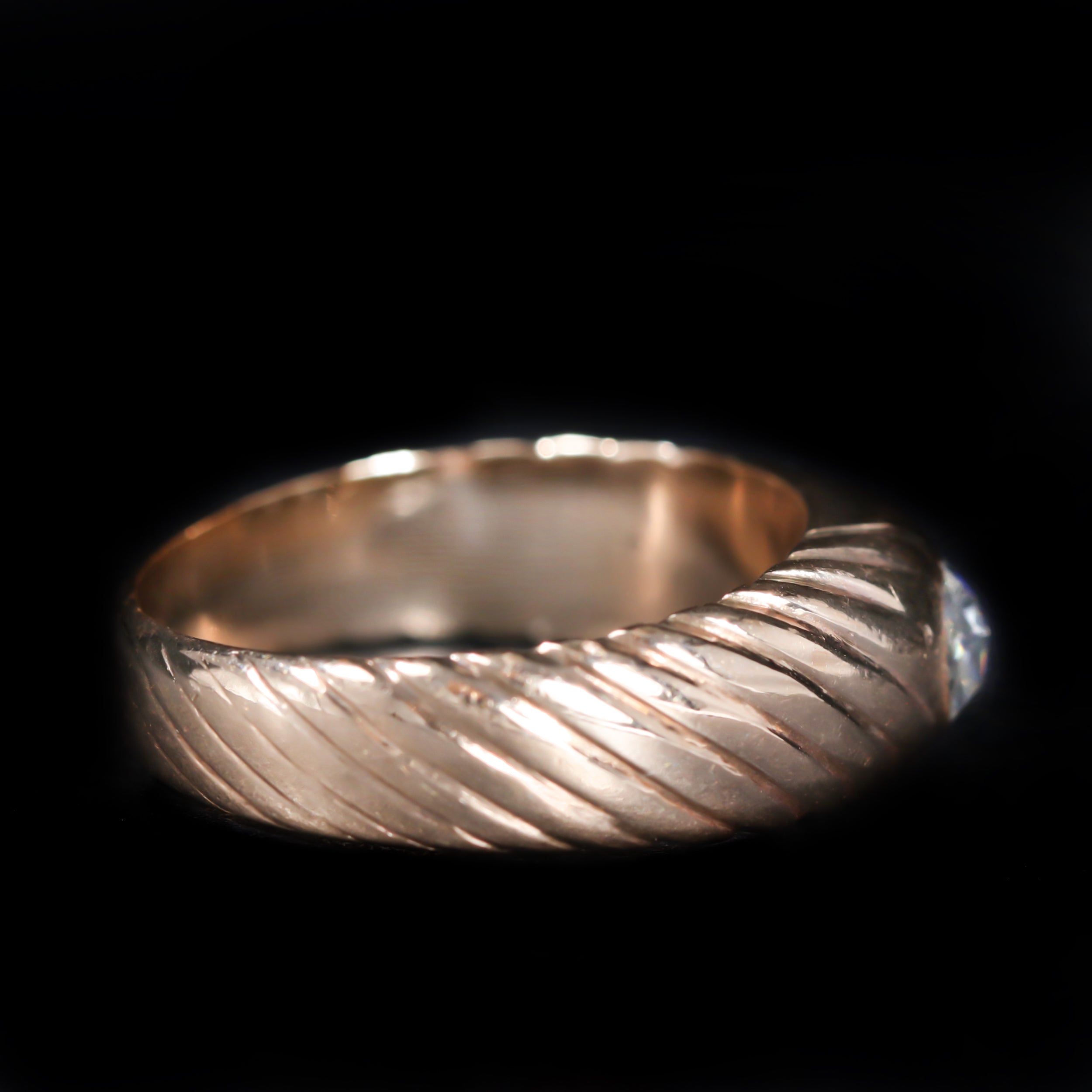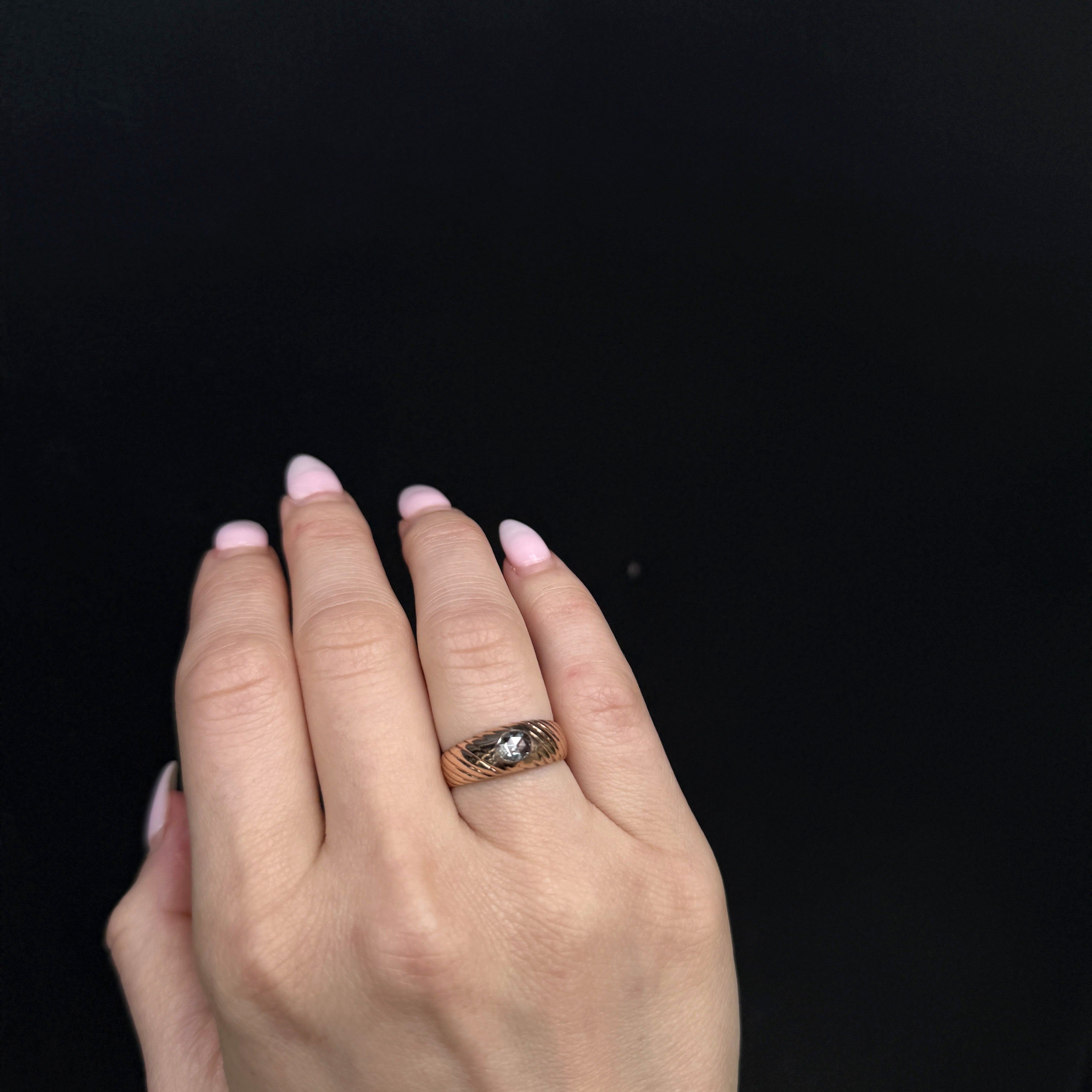 Victorian 14K yellow gold rose cut diamond ring. At the center of this Victorian-era ring is a charming 0.25 carat rose cut diamond, set flush into the band for a sleek, understated profile. The diamond’s gentle shimmer is beautifully complemented by bold diagonal fluting in warm gold, creating a timeless design with a strong yet romantic presence. Whether worn as a unique engagement ring or a meaningful everyday piece, it’s a lovely blend of antique character and lasting elegance.