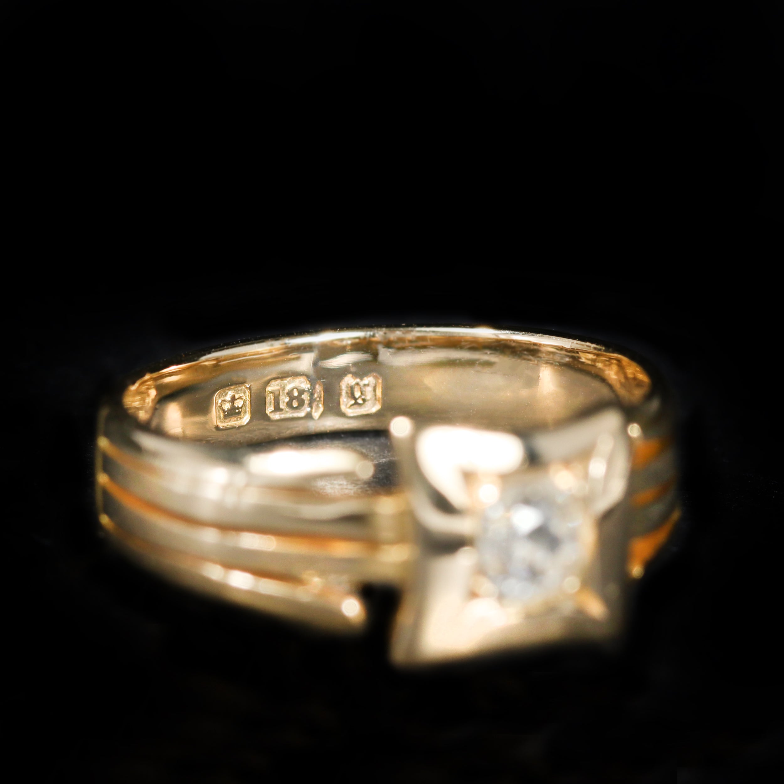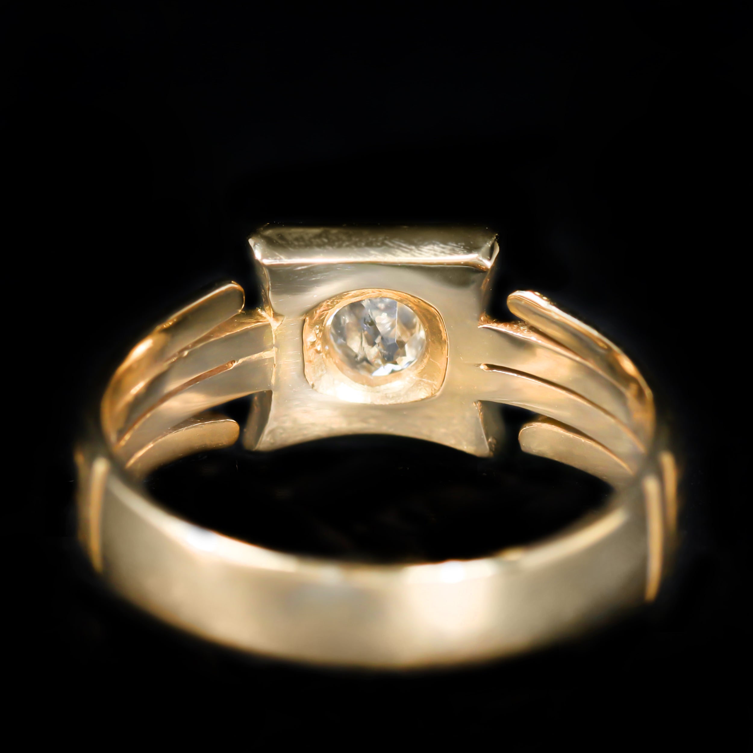 Art Deco 18K yellow gold and diamond ring. Dating to circa 1922, this 18K yellow gold ring is a striking example of early 20th-century British craftsmanship, hallmarked with the English crown and a date letter “g” confirming its London origin. Though the assay office mark was lost during a past resizing, the surviving hallmark verifies its 1922 production. At the center rests a 0.38 carat Old Mine cut diamond, set within a polished square-shaped gold frame with concave sides—a bold yet balanced Art Deco-influenced silhouette. The shank adds even more visual interest, featuring four distinct gold rows; the outer two extend from the centerpiece in an openwork design, giving the ring a structured, architectural elegance.