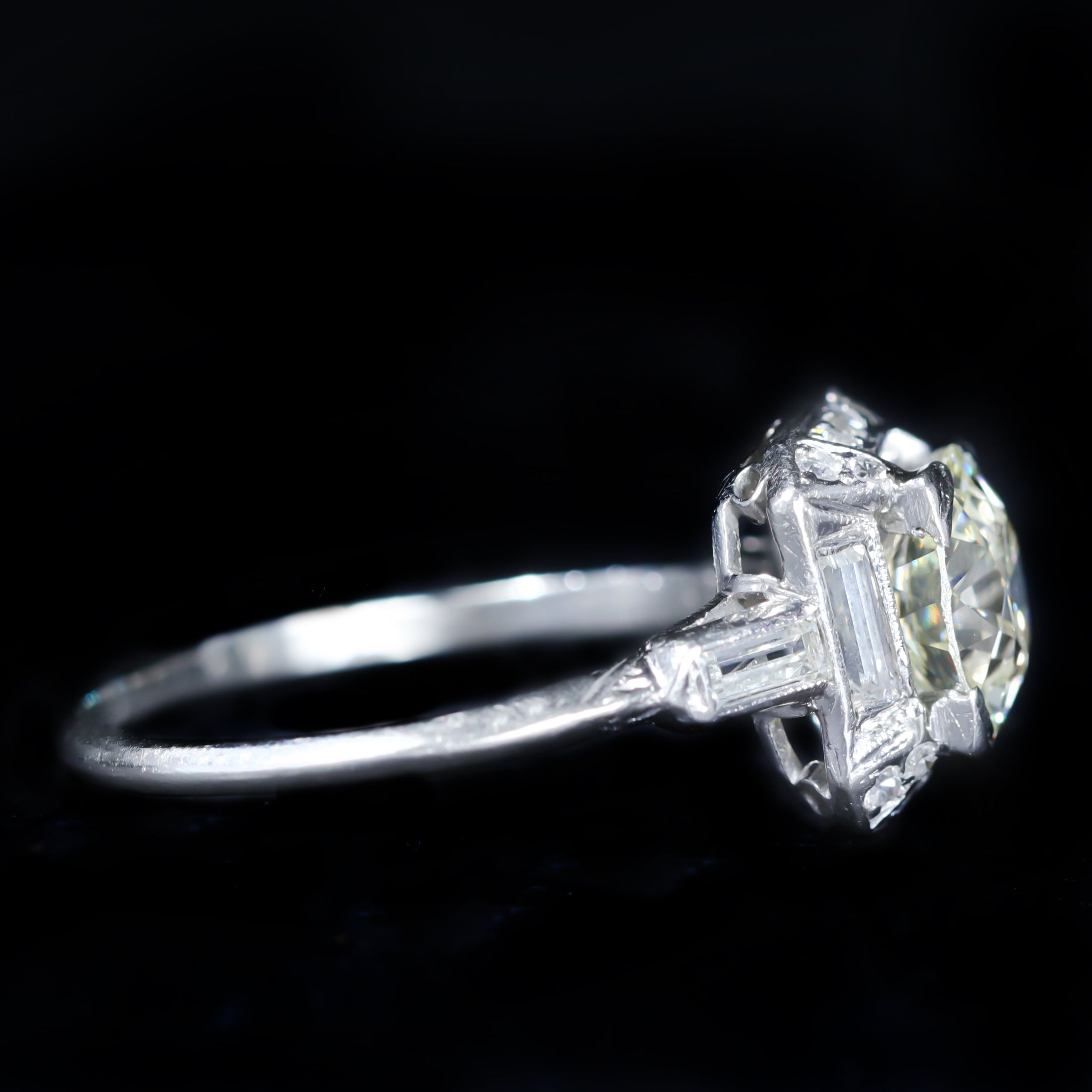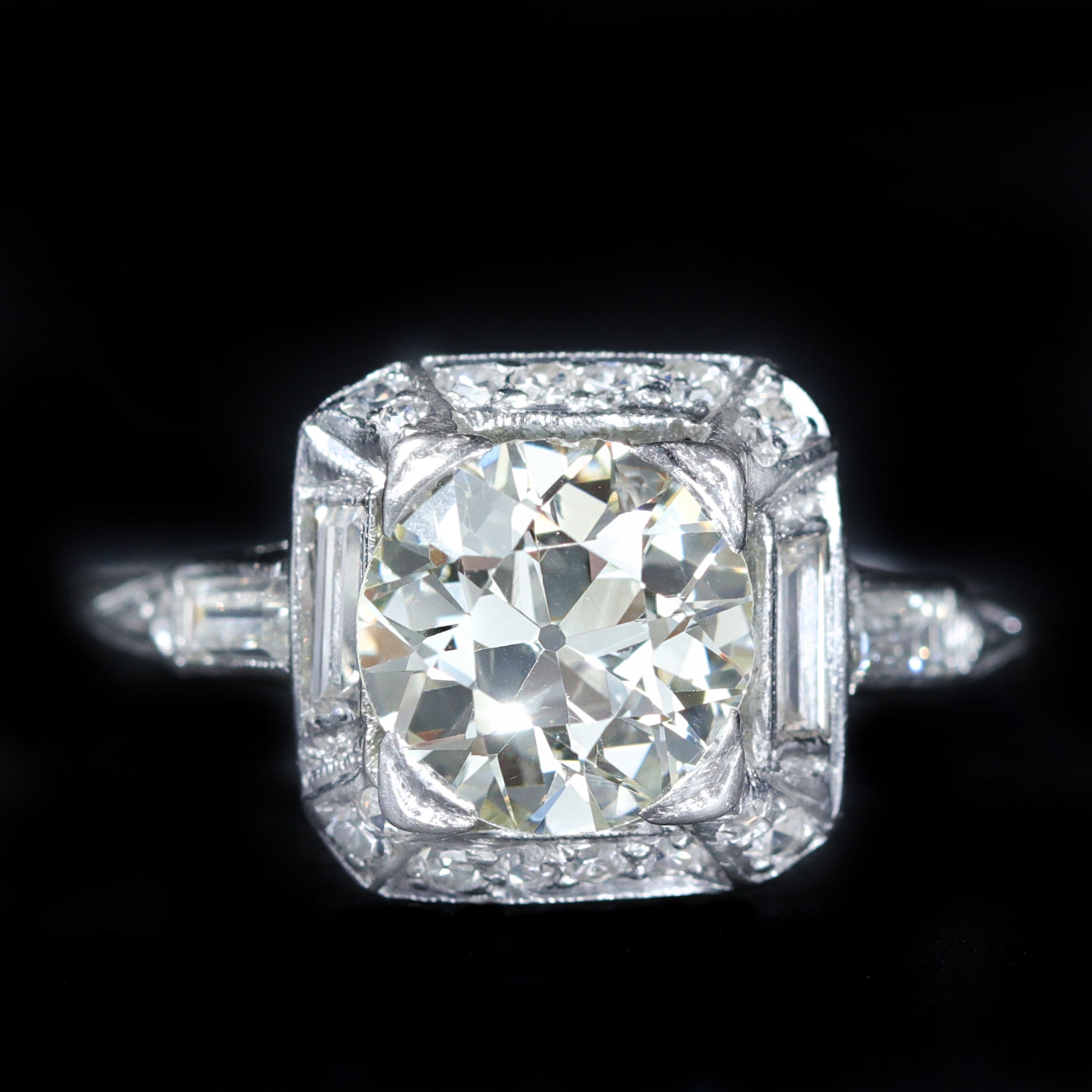 Art Deco platinum and diamond ring. A luminous Old European cut diamond centers this Art Deco engagement ring, offering a soft, romantic sparkle prized in early 20th century diamonds. The diamond rests within a square platinum setting accented by baguette and single cut diamonds, creating crisp contrast and strong geometric balance. Fine detailing throughout reflects the precision and elegance that defined the Art Deco era. Dating to the 1920s–1930s, this ring is a refined antique heirloom with enduring presence.