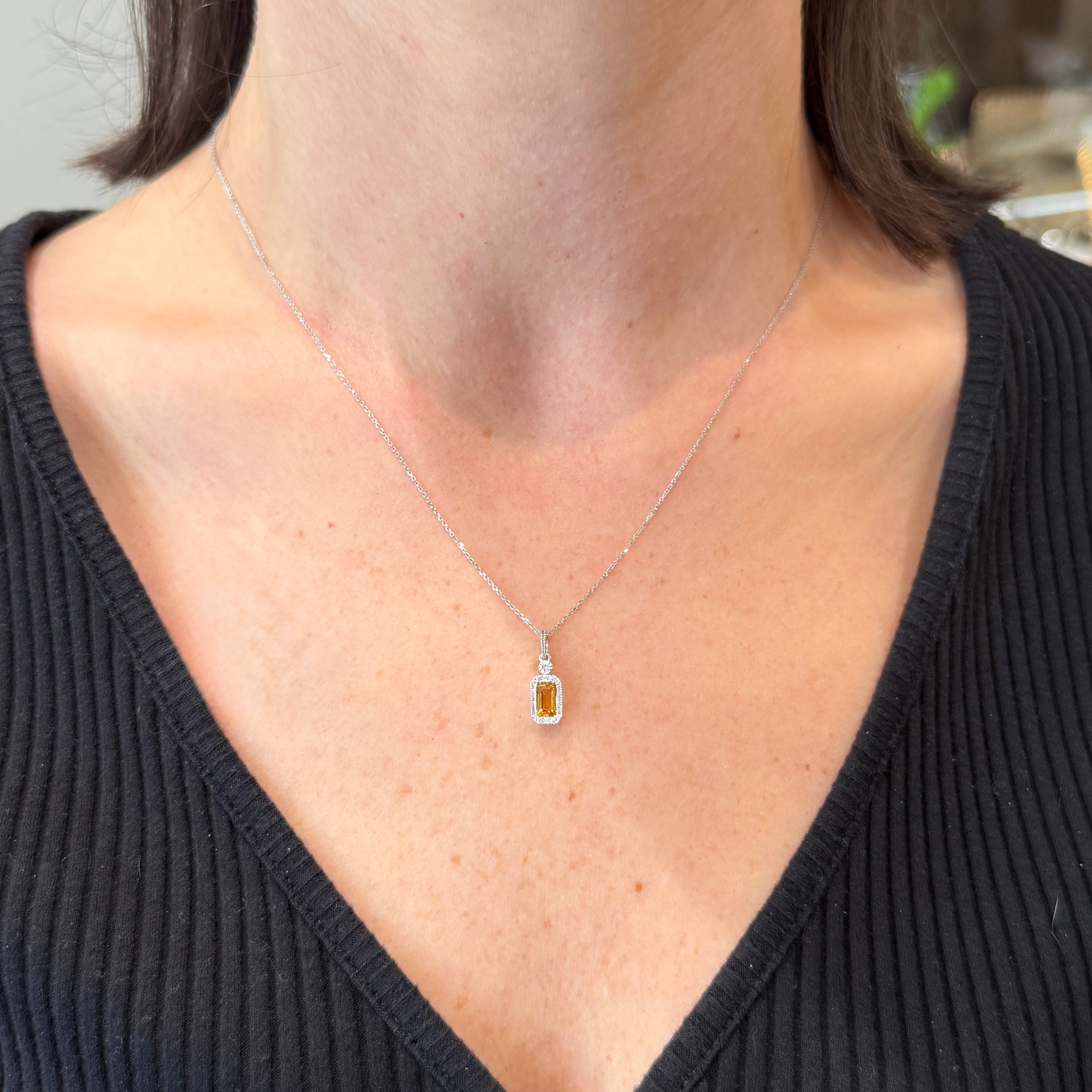 14K white gold, citrine, and diamond necklace. This 14K white gold pendant features an emerald cut citrine, its golden hues framed by a halo of round brilliant cut diamonds. The pendant is suspended from a diamond-set bail and hangs gracefully from an 18-inch cable chain with a spring ring clasp.