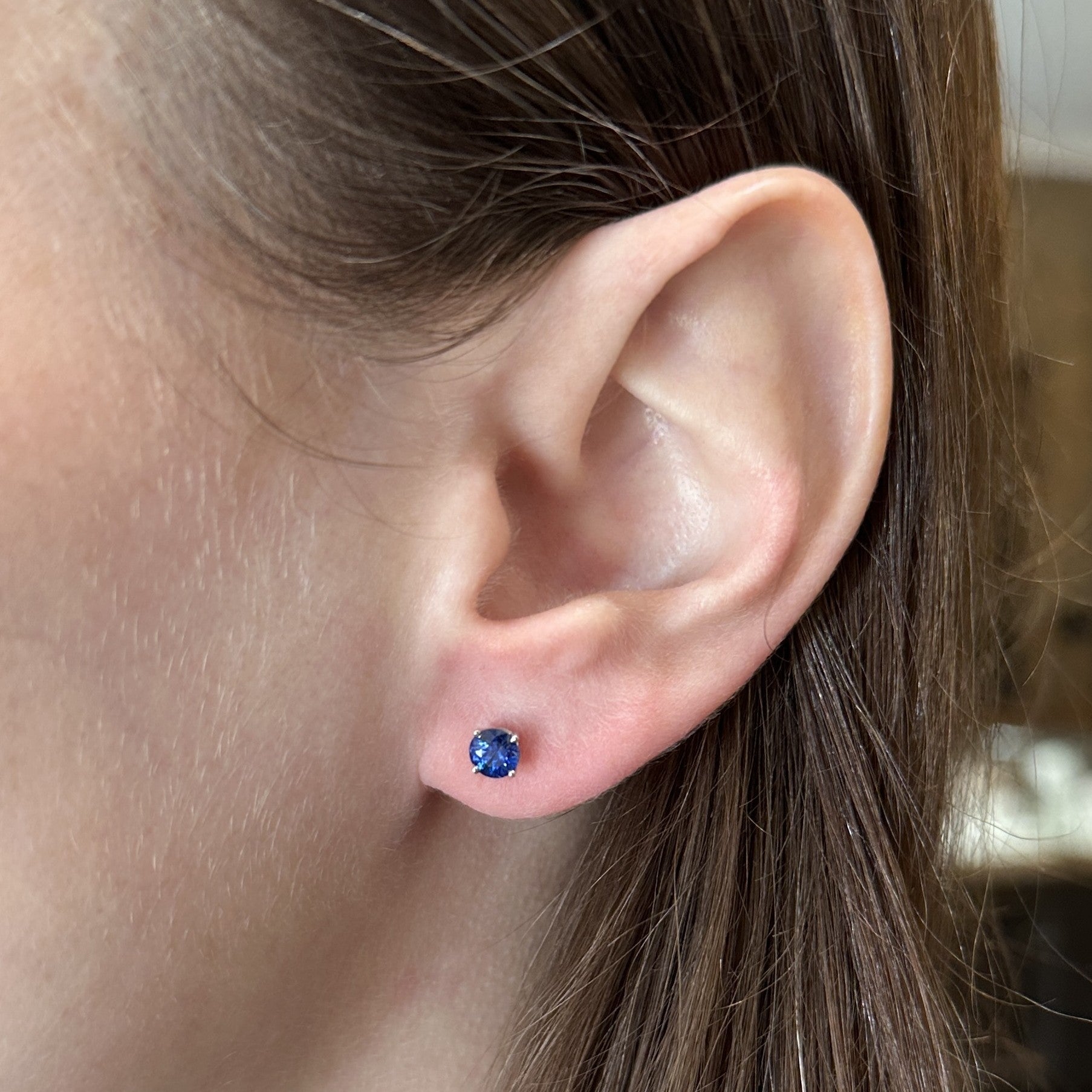14K white gold and sapphire earrings. These beautiful blue studs feature two round sapphires, each gem prong-set to showcase its rich blue hues. The earrings are secured with classic friction back closures. A timeless design, these studs offer an elegant touch of color suitable for everyday wear.