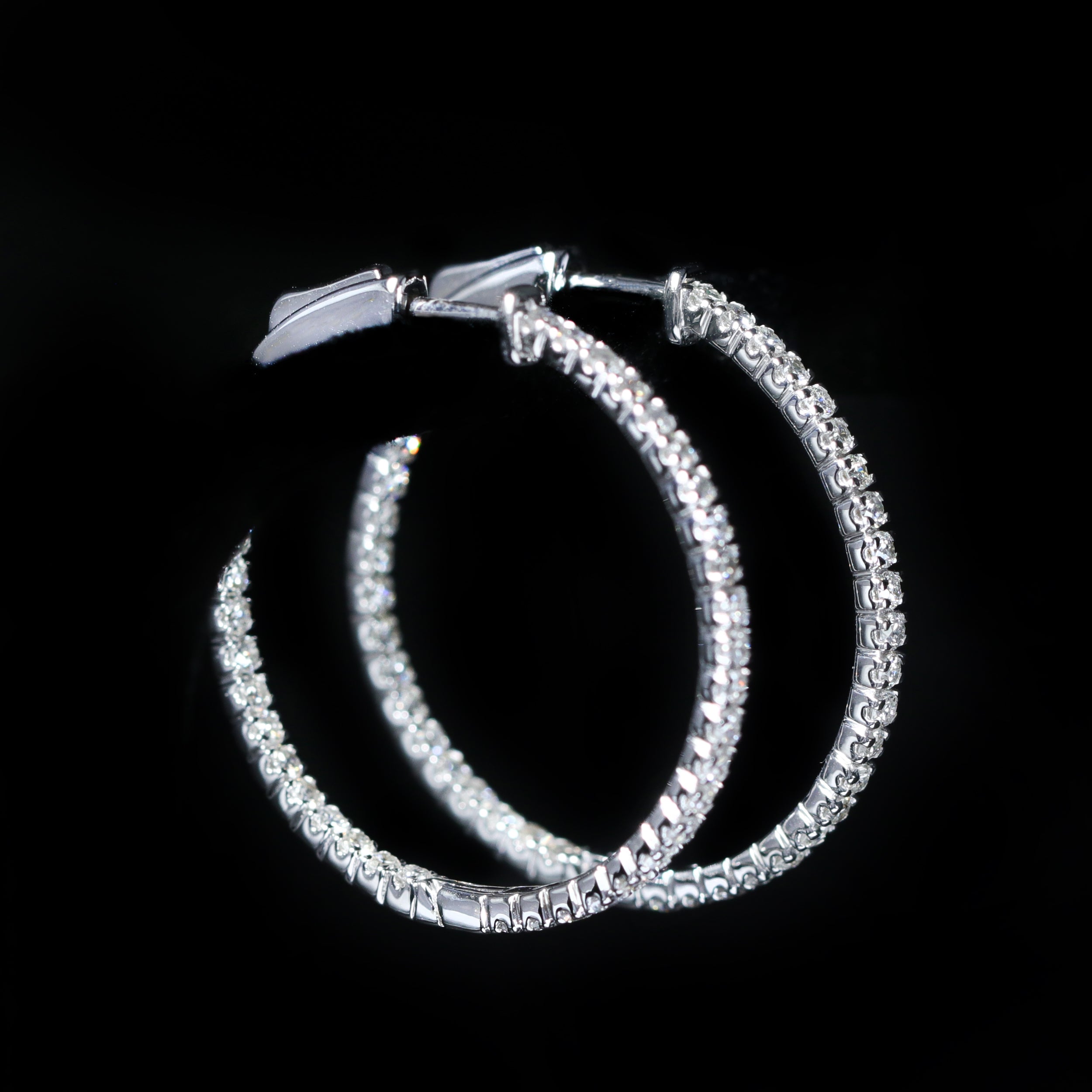 14K white gold and diamond hoop earrings. These 14K white gold hoop earrings are set with 1.62 carats of round brilliant cut diamonds in a classic inside-out design. Diamonds sparkle along the front of each hoop as well as the inward-facing edge, ensuring brilliance from every angle. Secured with posts and hinged backs, they combine ease of wear with radiant style - a versatile pair that brings refined sparkle to any occasion.