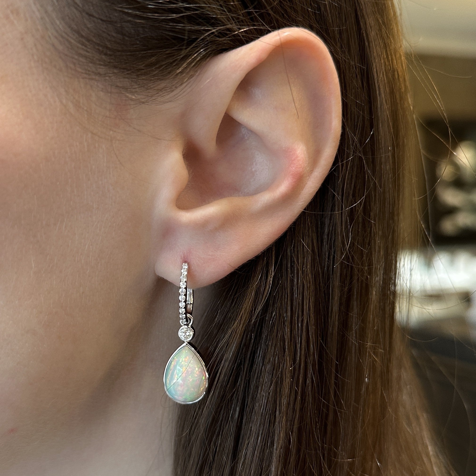 14K white gold, opal, and diamond earrings. A pair of luminous opals bring a kaleidoscope of color to these dangle earrings. The pear-shaped cabochons display a light body tone alive with flashes of blue, green, yellow, orange, and pink - an enchanting play of color that shifts with every movement. Each opal suspends from a bezel-set diamond, dangling beneath a petite diamond hoop.