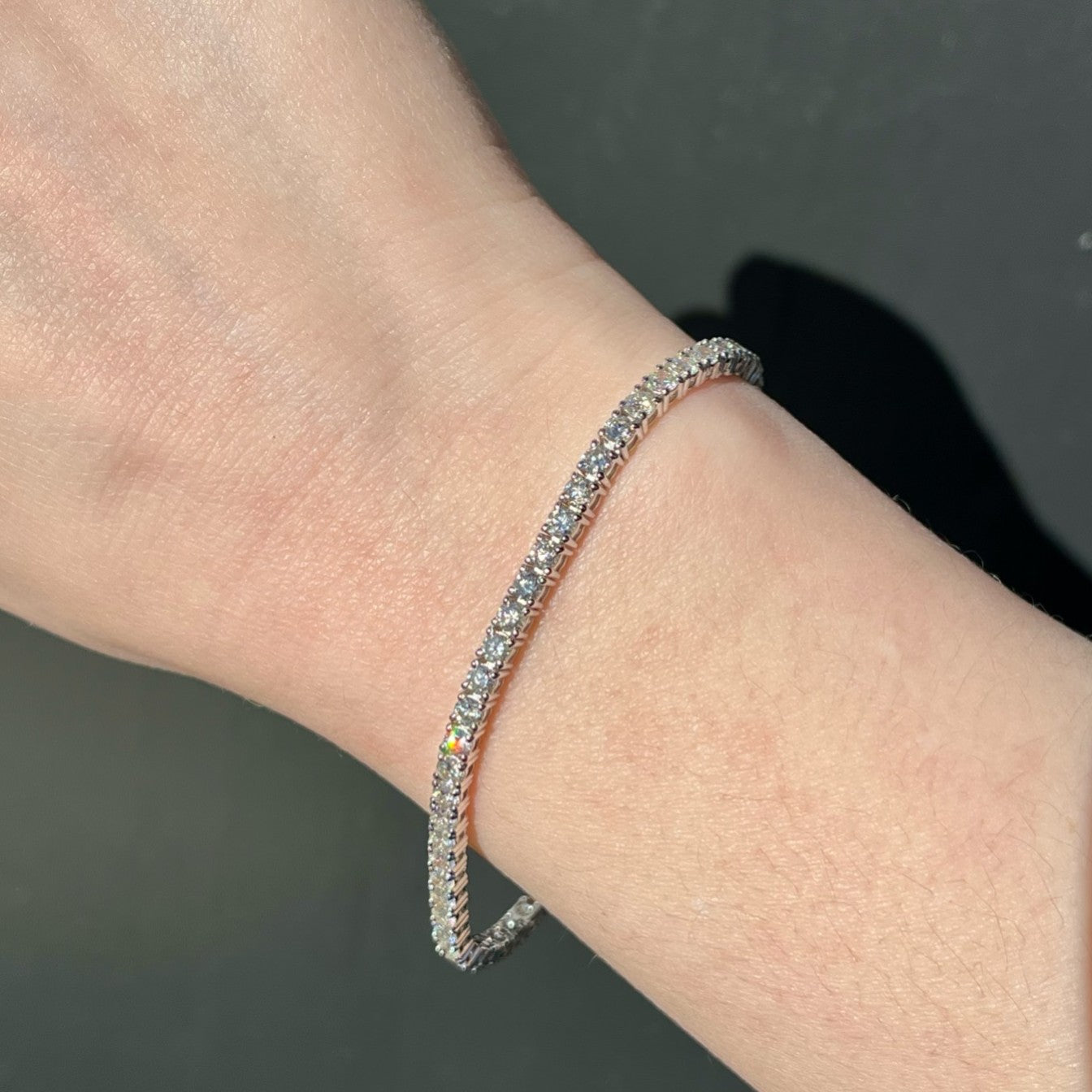 14K white gold and diamond bracelet. A true classic, this tennis bracelet features 58 round brilliant cut diamonds, each held securely in four-prong settings to create an unbroken line of light around the wrist. Measuring 7 inches in length, it offers a comfortable, flexible fit with a timeless silhouette that transitions from day to evening.