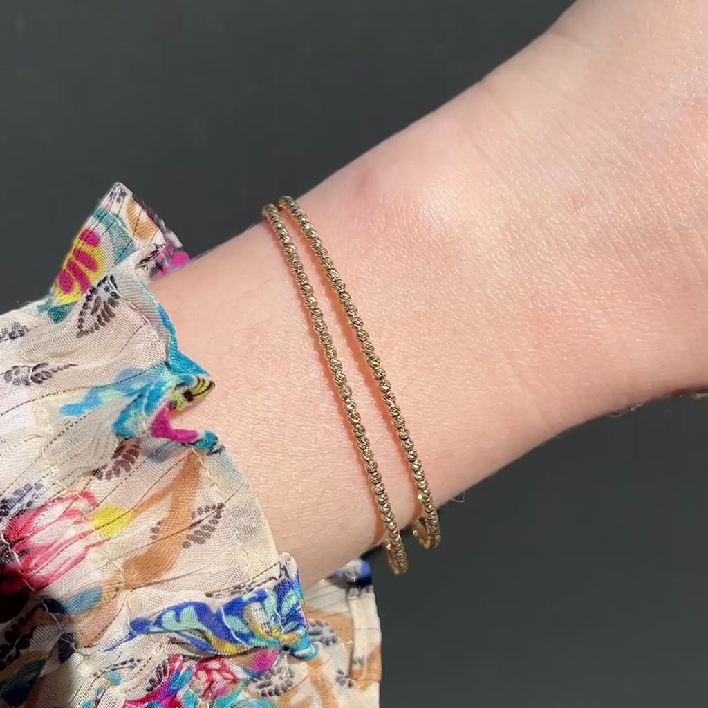 14K yellow gold bangle bracelet. This 14K yellow gold bracelet features a series of diamond-cut beads, each textured to catch light with a shimmering effect. Designed as a flexible bangle, it drapes comfortably around a 7-inch wrist and secures with a lobster clasp. Subtle yet eye-catching, it's a versatile piece that adds golden sparkle to your everyday wrist stack.