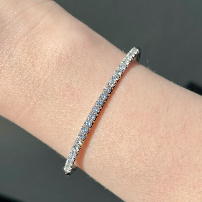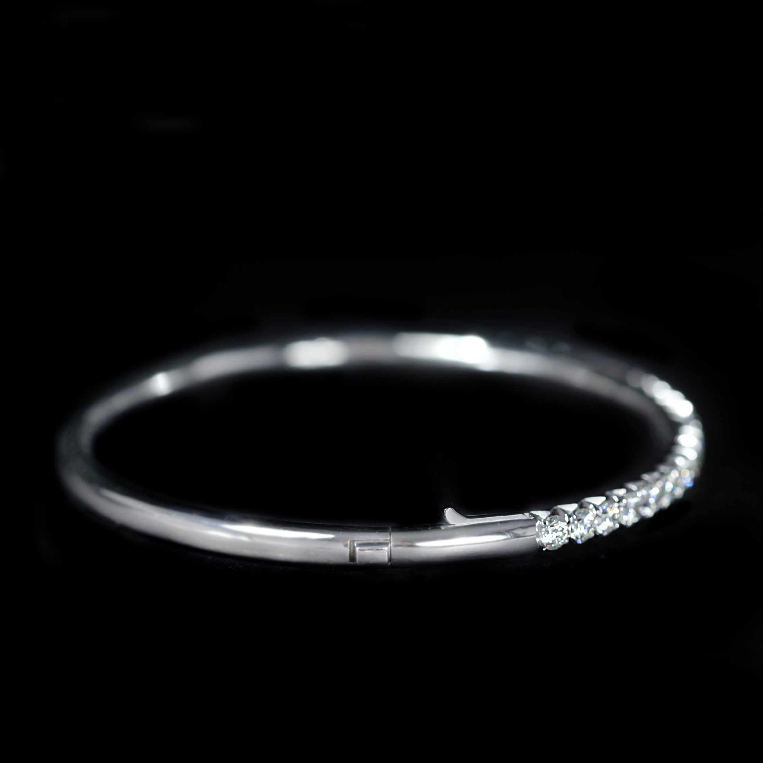 Platinum and diamond bracelet. This platinum hinged bangle bracelet features approximately 1.96 carats of round brilliant cut diamonds, set across the top half for a graceful arc of light. Each diamond is meticulously placed to maximize brilliance and balance. The sleek silhouette is secured with a tongue closure and safety latch for comfort and peace of mind.