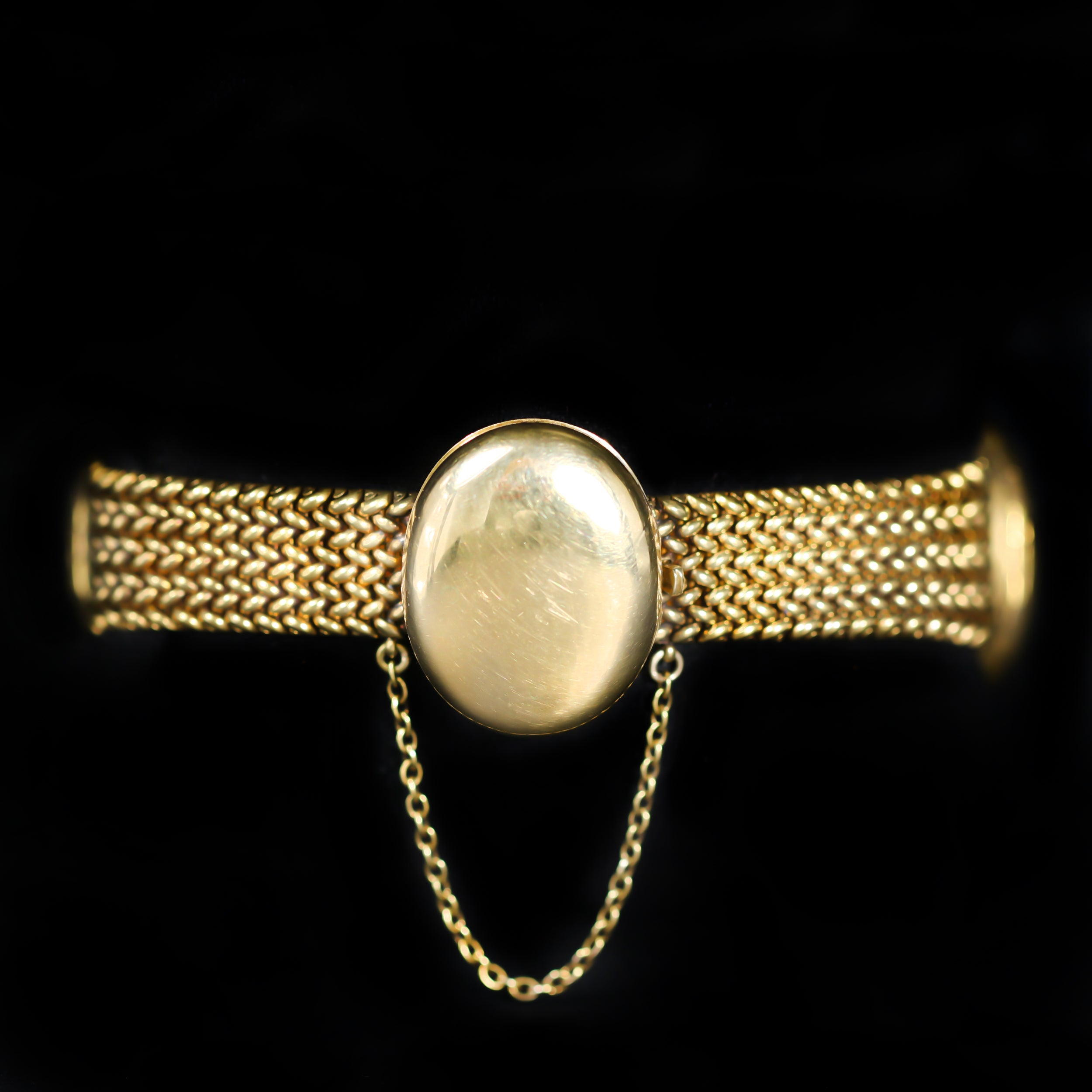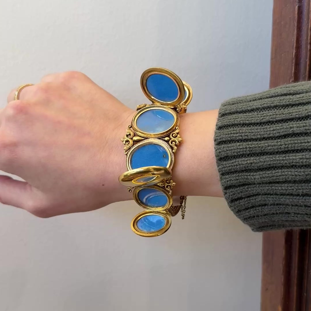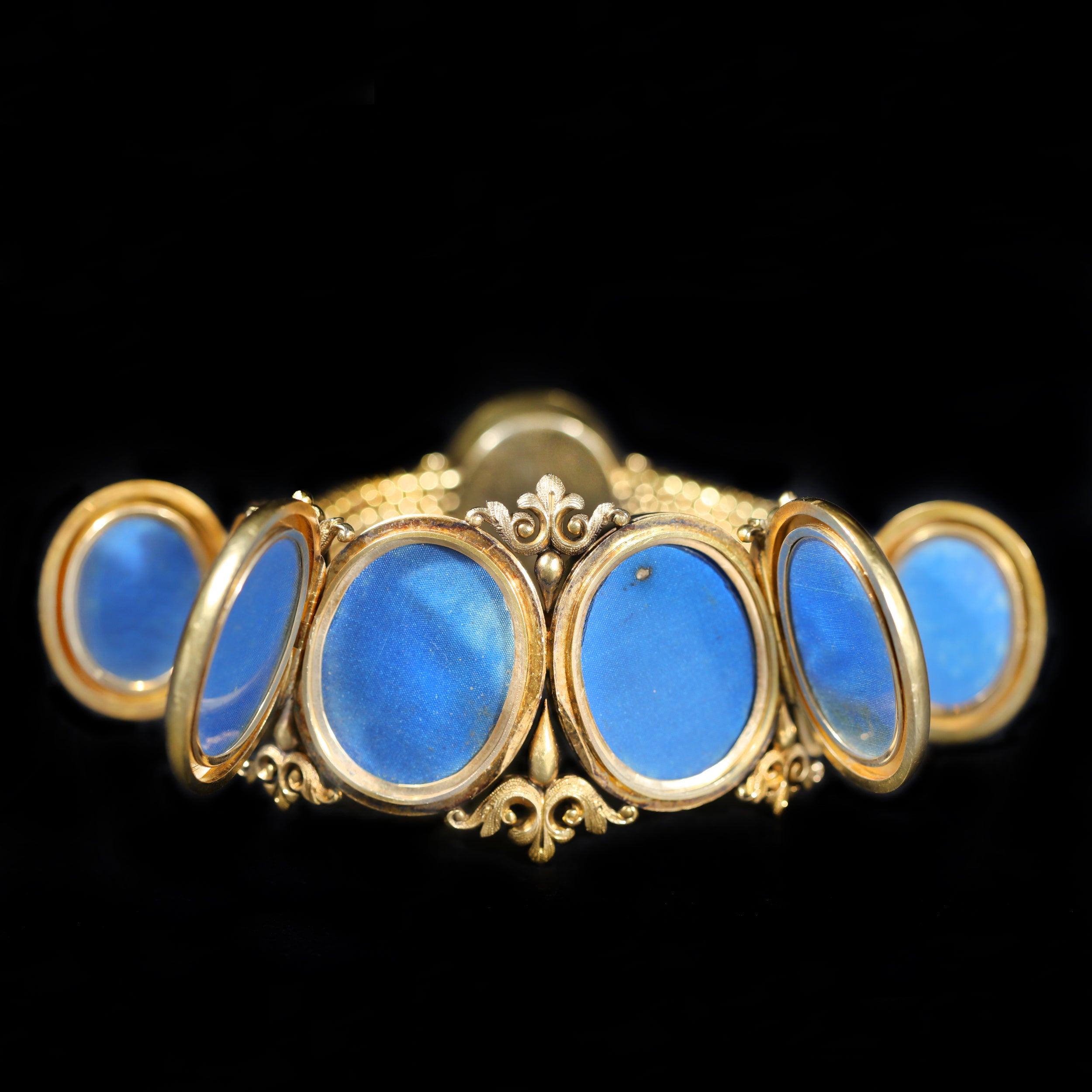Victorian 14K yellow gold locket bracelet. A true rarity among antique jewels, this locket bracelet is hallmarked by the London Assay Office with the Leo zodiac import mark. The piece likely originated in the mid-to-late 1800s and was imported into England decades later—a journey that adds to its remarkable story. The substantial gold bracelet features four large oval lockets across the top, each opening to reveal two compartments for portraits or treasured mementos. An additional hidden locket forms the clasp, cleverly concealing yet another two compartments. Locket bracelets were popular in the Victorian period, but to find one of this caliber—with multiple compartments, fine detailing, and such a commanding presence—is extraordinarily rare. Both a work of art and a vessel for personal history, this bracelet is a museum-worthy example of sentimental jewelry at its finest.