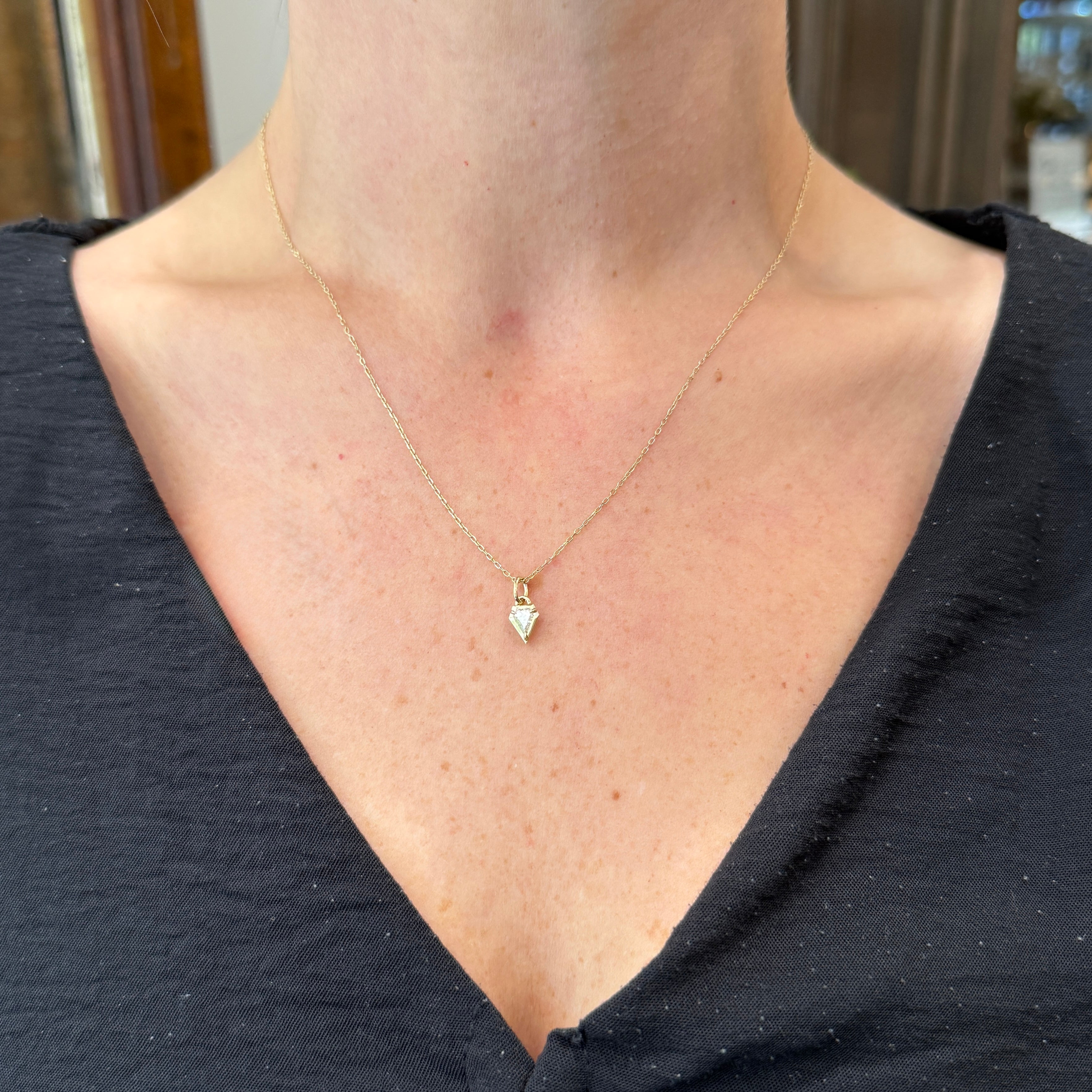 14K yellow gold and diamond pendant. A beautiful kite cut diamond is set in a classic prong collet setting, catching and reflecting the light with striking brilliance. The warm tone of the yellow gold contrasts gently with the bright and sparkling diamond, creating this playful piece that's perfect worn alone or layered. Chain sold separately.
