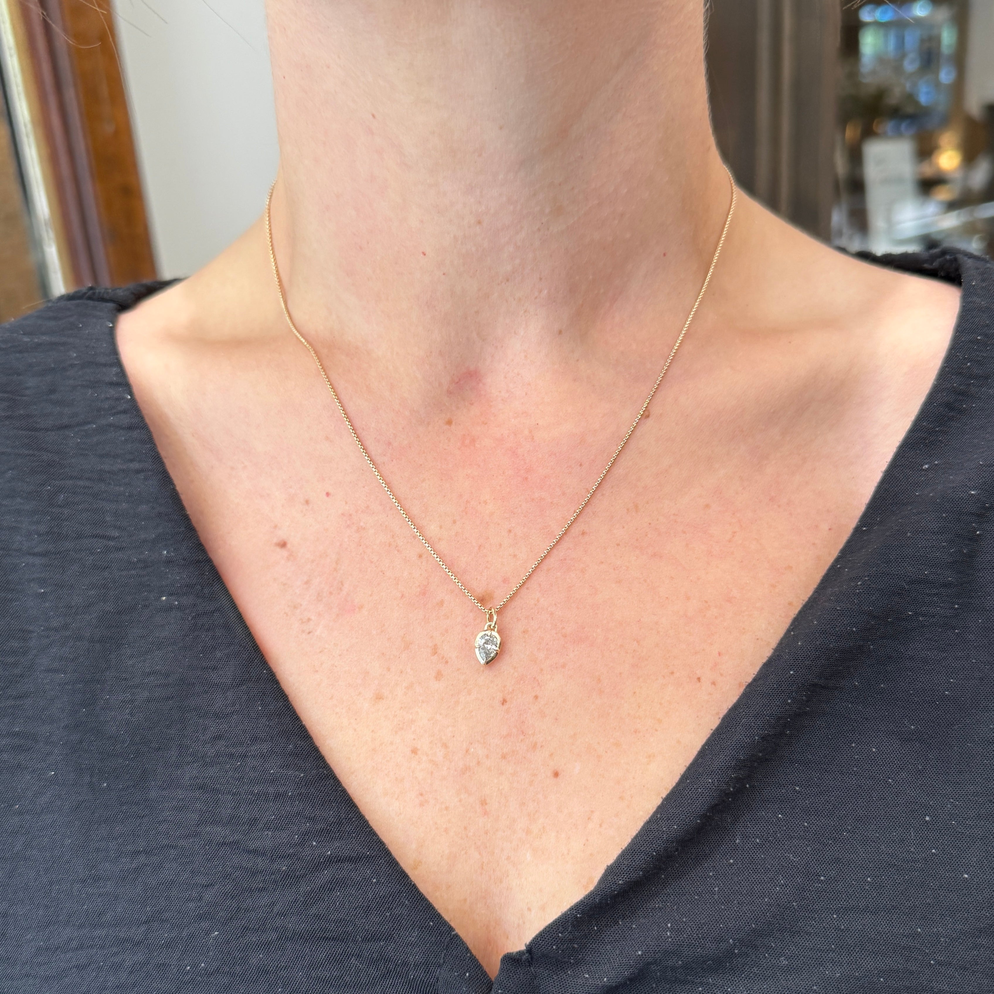 14K yellow gold and diamond pendant. A beautiful pear cut diamond is set in a classic prong collet setting, catching and reflecting the light with striking brilliance. The warm tone of the yellow gold contrasts gently with the bright and sparkling diamond, creating this romantic piece that's perfect worn alone or layered. Chain sold separately.