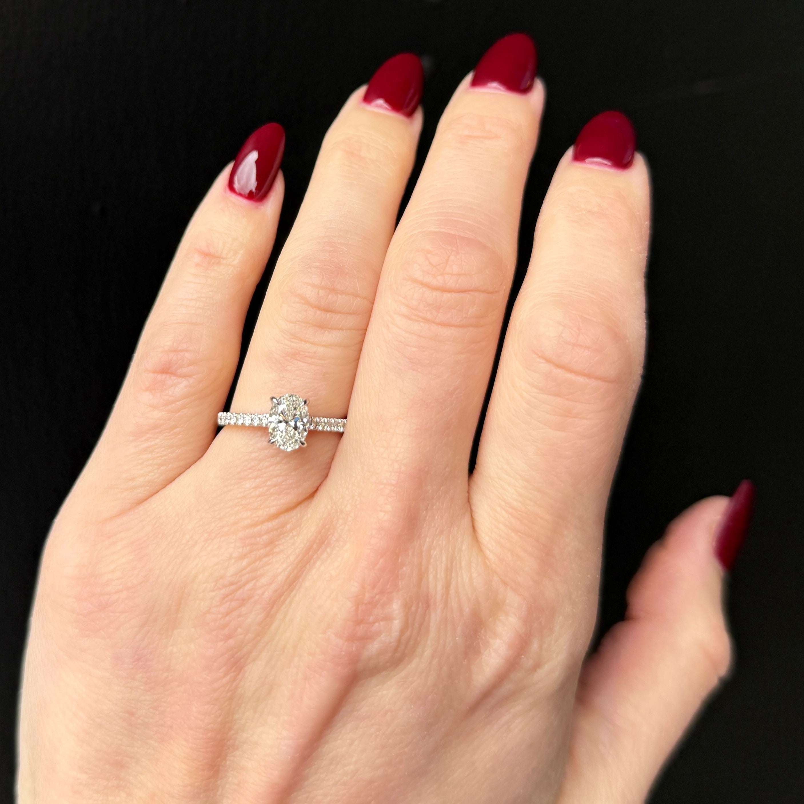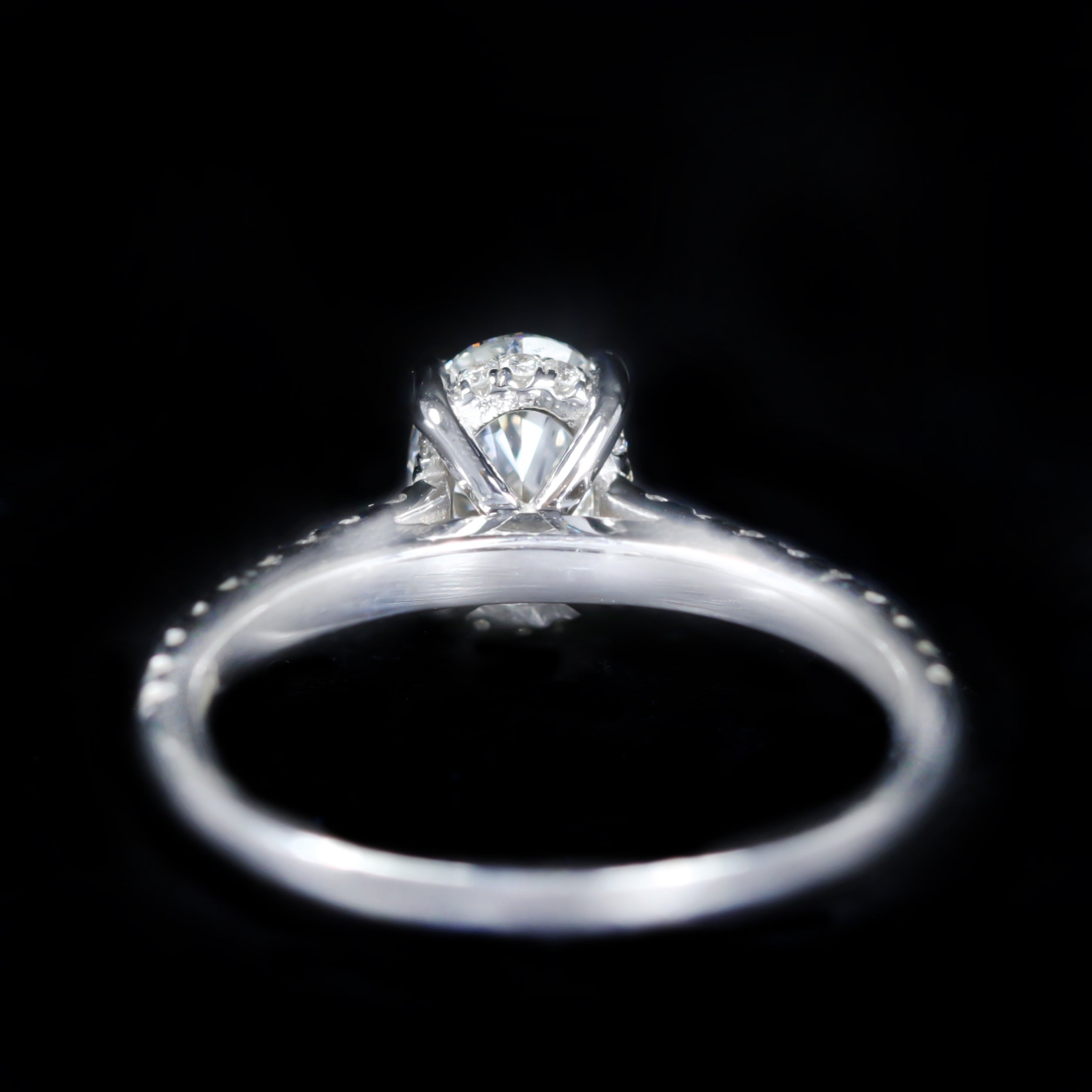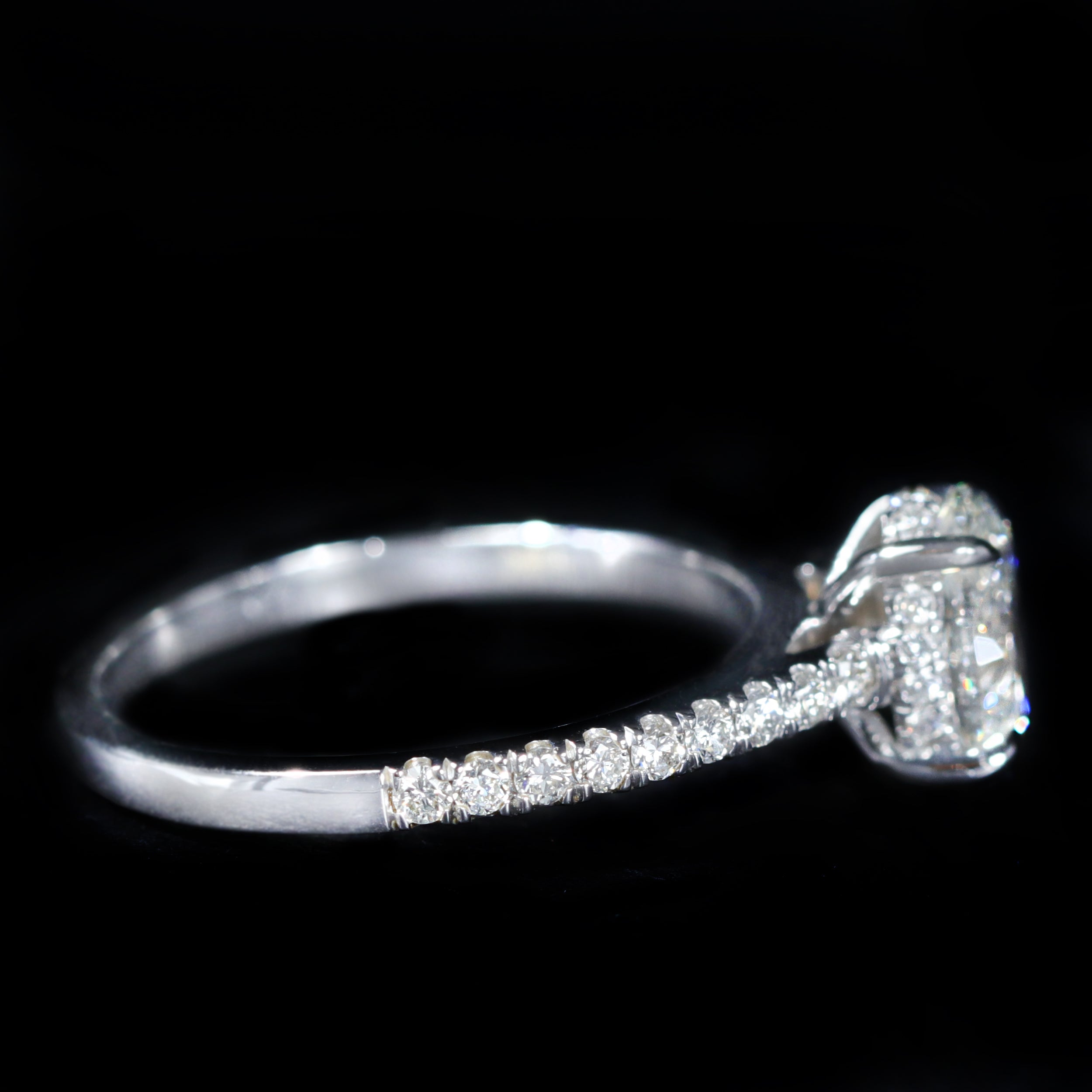 14K white gold and diamond ring. A 1.03 carat oval-cut diamond, accompanied by a GIA report, serves as the focal point of this engagement ring, offering a soft brilliance and an elegant, elongated silhouette. The center stone is complemented by a slender diamond-set shank that flows effortlessly toward the setting. Beneath the oval, a hidden halo of diamonds adds a soft, intimate glow. Elegant and finely balanced, the design feels timeless while allowing the beauty of the diamond to speak for itself.