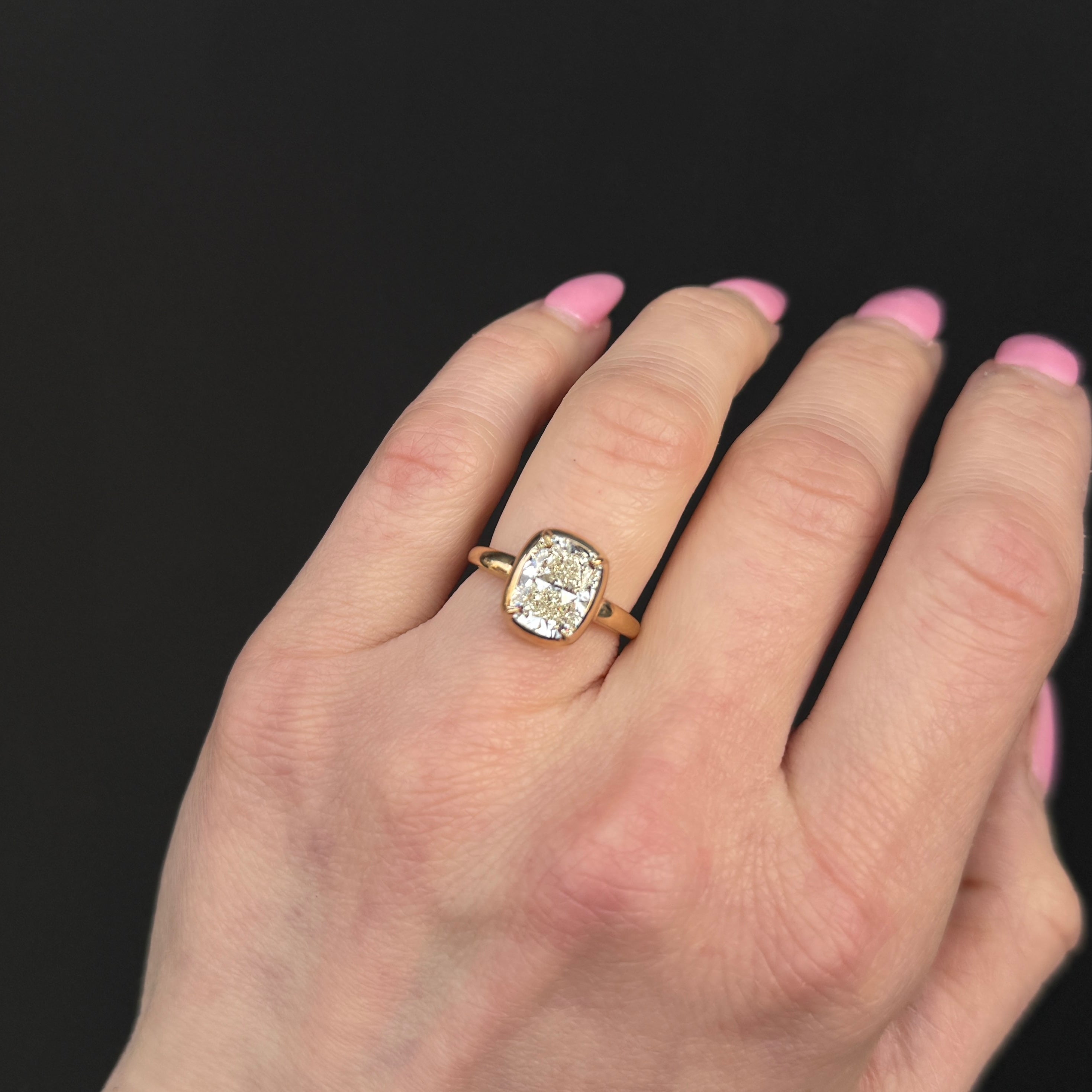 18K yellow gold and diamond ring. An elongated 3.02 carat cushion-cut diamond takes center stage in this 18K yellow gold engagement ring. Set in four prongs, the mounting follows the soft curves of the cushion shape, giving the ring a bold, sculpted presence. The warm tone of the gold complements the diamond’s gentle color, creating a look that feels substantial, confident, and timeless.