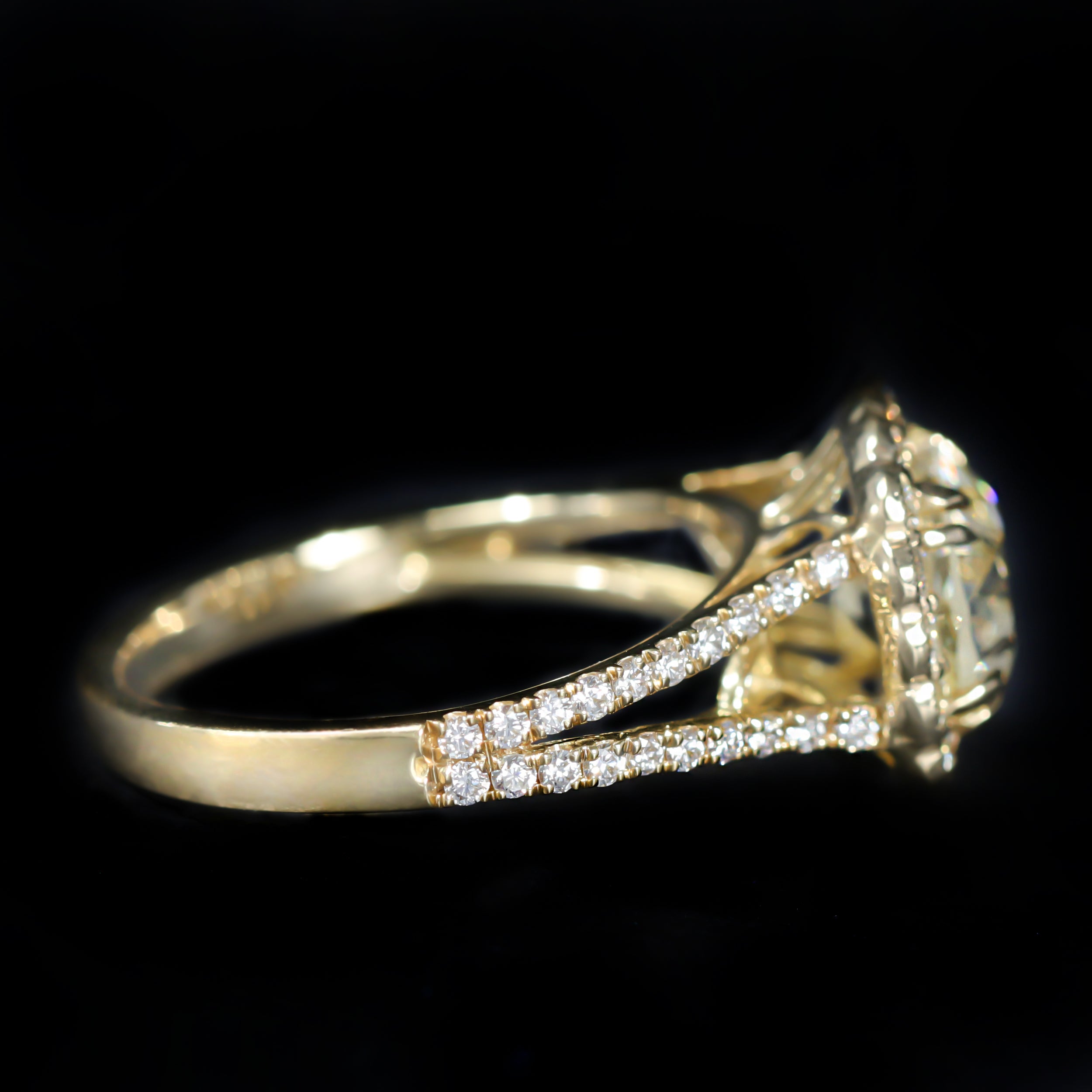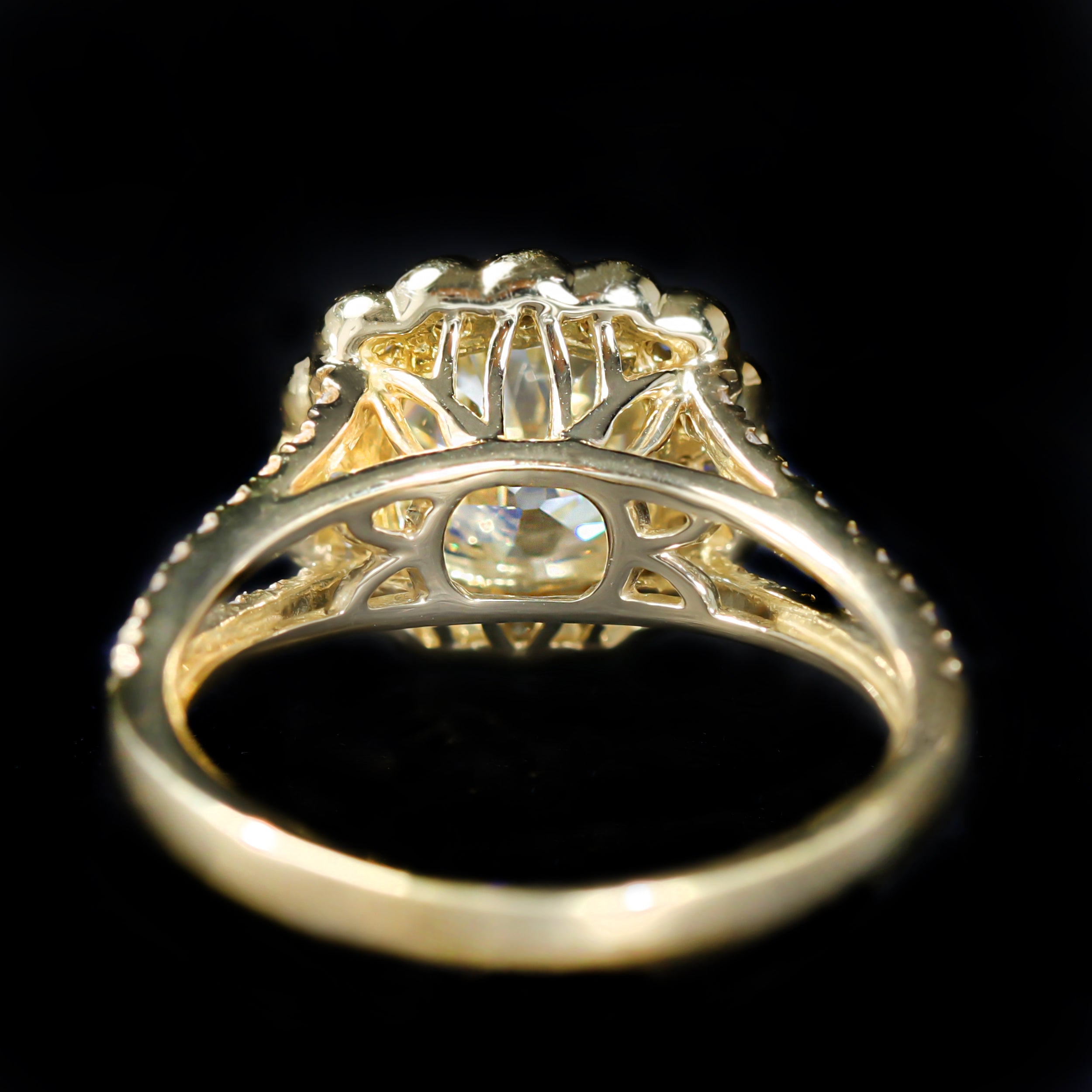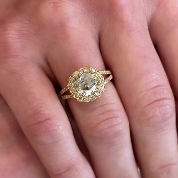 18K yellow gold and diamond ring. This 18k yellow gold ring showcases a stunning 2.00 carat Old European cut diamond at its center, set in four elegant split prongs. Surrounding the center is a scalloped halo of round brilliant cut diamonds, bordered with fine milgrain detailing. Additional diamonds line the split shank halfway down. With its blend of antique diamond charm and thoughtful design, this ring is truly timeless—an exquisite choice for a distinctive engagement or statement piece.