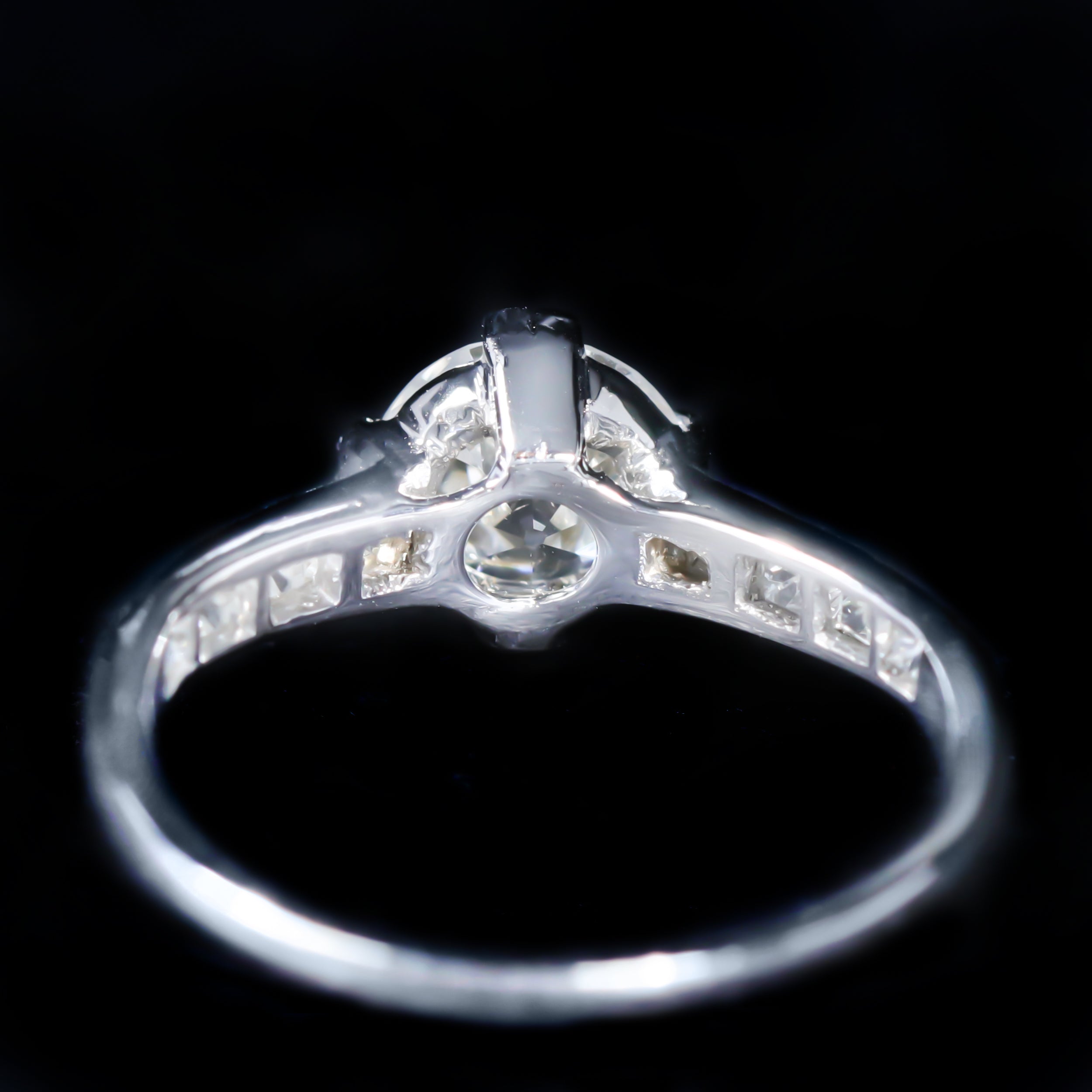 Tiffany & Co. Art Deco platinum and diamond ring. This platinum ring from Tiffany & Co. features a 0.84 carat Old European cut diamond, accompanied by a GIA Diamond Report. The center diamond is accented by eight French cut diamonds, totaling approximately 0.25 carats, set seamlessly into the band for a refined, architectural look. A sophisticated piece with subtle brilliance and historic charm—perfect as an elegant engagement ring or treasured collector’s item.