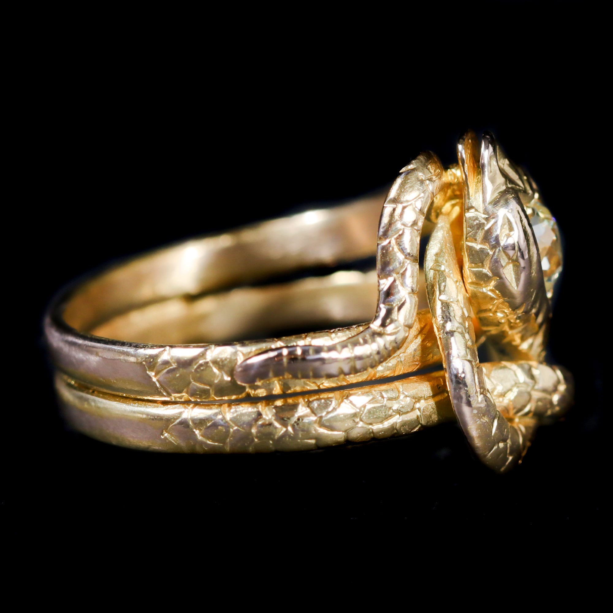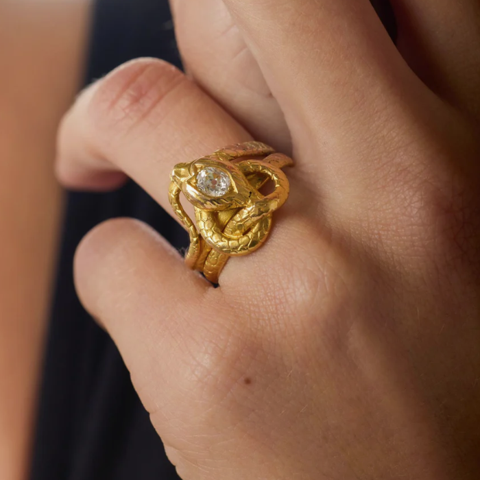 Victorian 18K yellow gold and diamond ring. A Victorian snake ring crafted in 18K yellow gold coils gracefully around the finger, the body looping into itself in an endless, fluid curve. The serpent’s head is set with an Old Mine cut diamond, adding a soft, antique sparkle, while finely engraved scales bring texture and lifelike detail to the gold. Snake motifs became especially popular in the 19th century after Queen Victoria received a serpent engagement ring from Prince Albert in 1839, symbolizing eternal love and wisdom. Romantic and symbolic, this ring carries both history and meaning in its sinuous design.