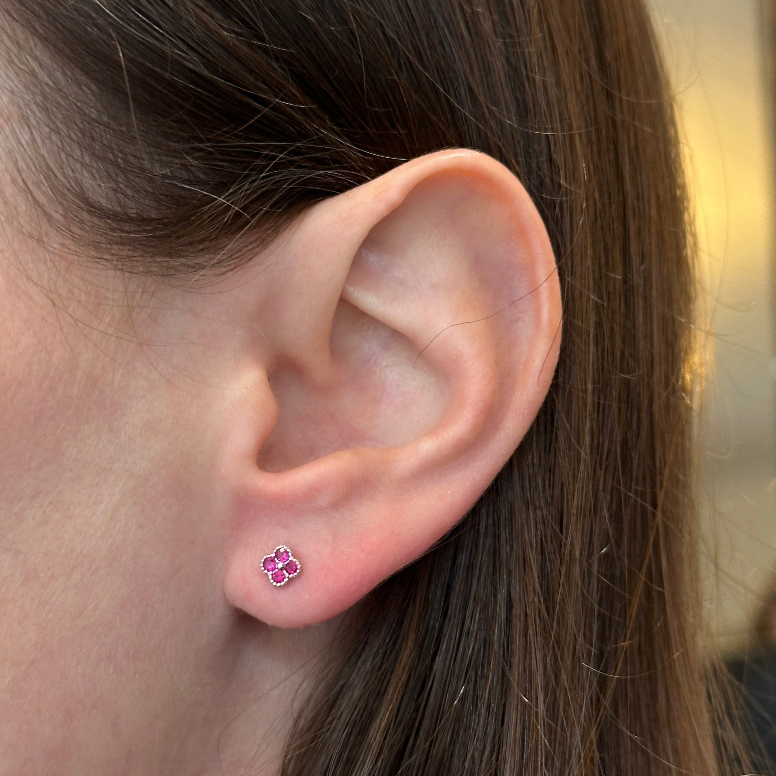 14K white gold and ruby earrings. These charming studs showcase four shimmering rubies in each ear, arranged in a classic quatrefoil design. The rubies are securely set in a luxurious 14K white gold setting, accented by a delicate milgrain border. The studs are equipped with a friction back, ensuring a secure and comfortable fit.