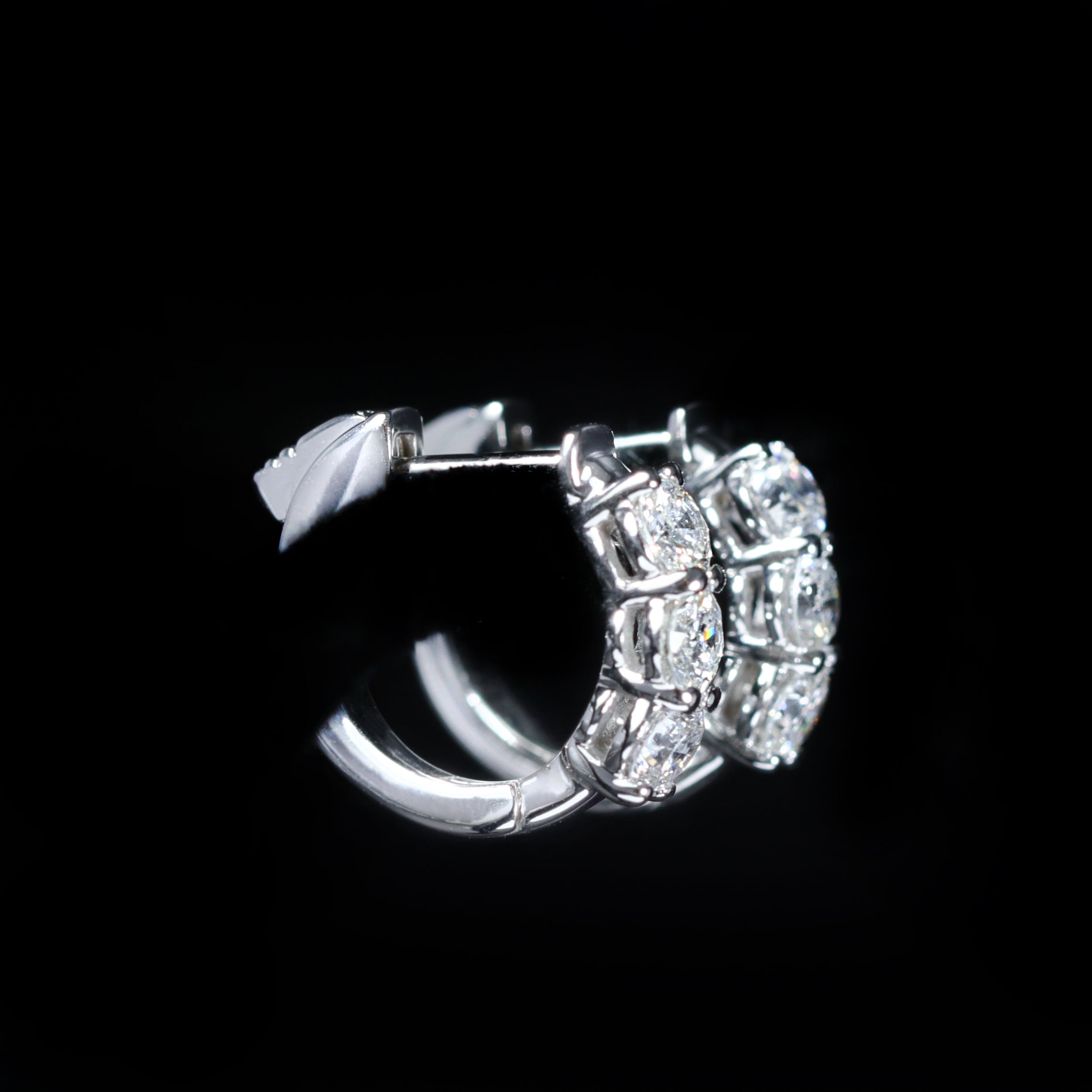 14K white gold diamond earrings. These huggie earrings are the perfect blend of timeless elegance and everyday wearability. Crafted in 14K white gold, each hoop is set with three round brilliant cut diamonds, totaling 0.98 carats. The close-fit design hugs the ear comfortably while adding just the right amount of sparkle. Whether worn on their own or paired with other favorites, these hoops are a beautiful choice for any occasion. The earrings measure approximately 1/2 inch in diameter.