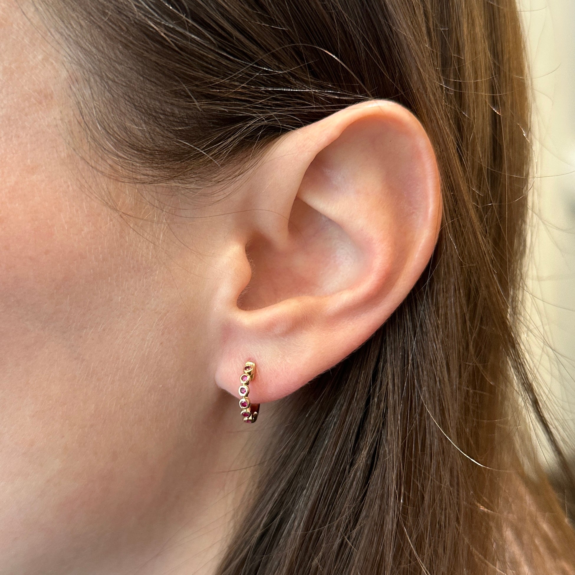 14K yellow gold and ruby earrings. These vibrant ruby huggie earrings, imbued with gorgeous red hues, contrast beautifully against their warm 14K yellow gold bezel settings. Worn solo of stacked with simple studs, this lovely pair will become a favorite in your jewelry rotation.