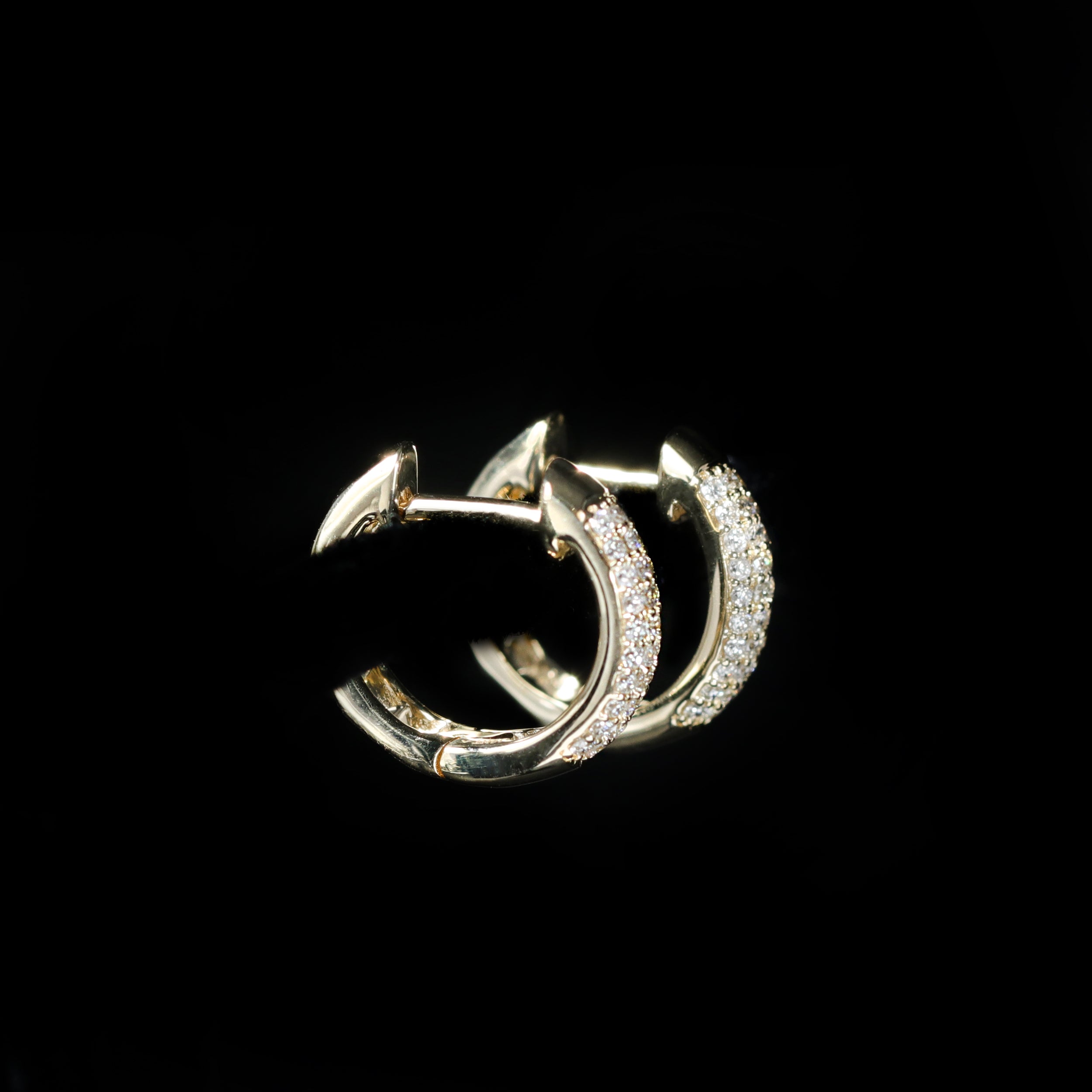 14K yellow gold diamond hoop earrings. A chic and stunning pair of hoops you can wear with everything, from day to night! Pavé set with sixty round brilliant cut diamonds, totaling 0.30 carats, these beautiful hoops glisten and gleam with every turn of the head. These earrings fasten with a post and hinge closure and measure approximately 1/2 inch long.