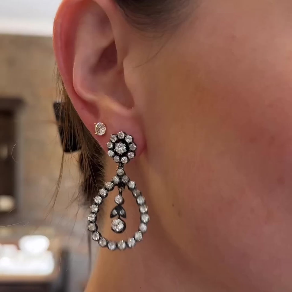 Silver-topped 18K yellow gold and diamond earrings. These silver-topped 18K yellow gold drop earrings are set with approximately 6.24 carats of antique diamonds, a mix of Old Mine and Old European cuts. Seventy diamonds in total shimmer across the open pear-shaped design, their softly faceted sparkle carrying a warm and romantic glow. Elegant in scale yet full of delicate detail, they are a striking example of period craftsmanship and enduring beauty.