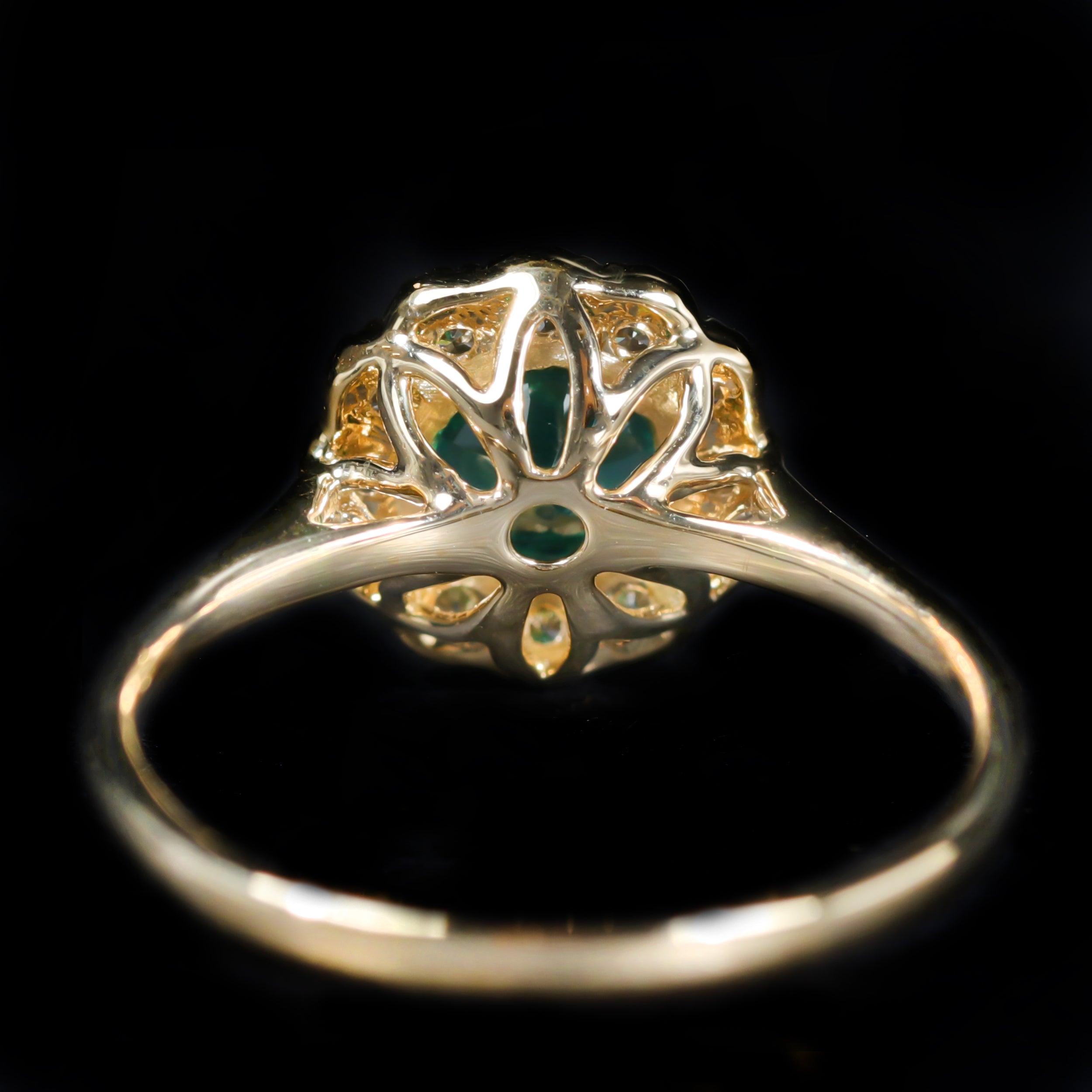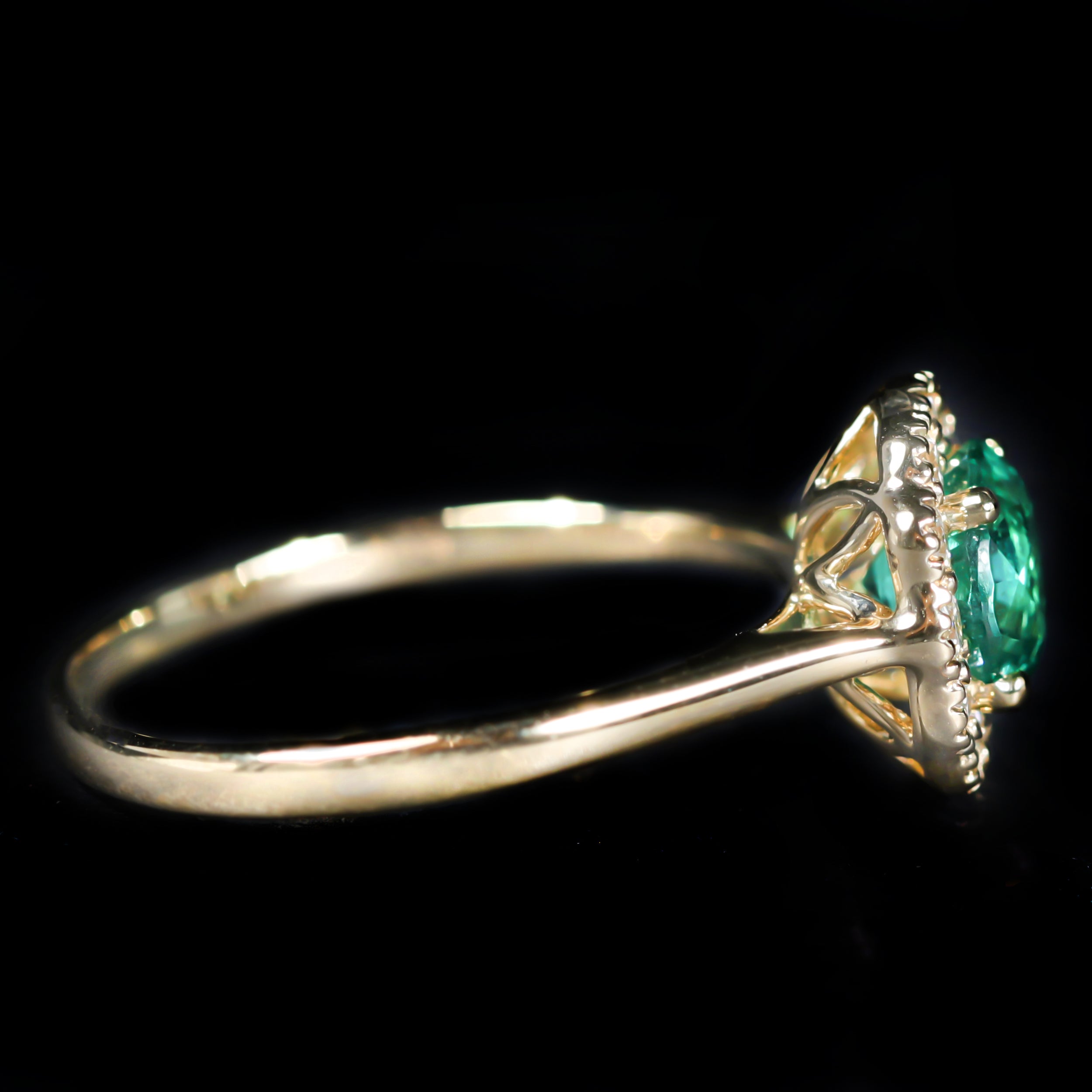 14K yellow gold, emerald, and diamond ring. A vivid round cut emerald, weighing approximately 0.87 carats, anchors this 14K yellow gold ring with a fresh, luminous green glow. The emerald is secured in four prongs and encircled by a halo of round brilliant cut diamonds, each framed by delicate milgrain edging that adds texture and vintage-inspired refinement. Graceful and beautifully balanced, this ring highlights the timeless allure of emeralds paired with classic diamond sparkle.
