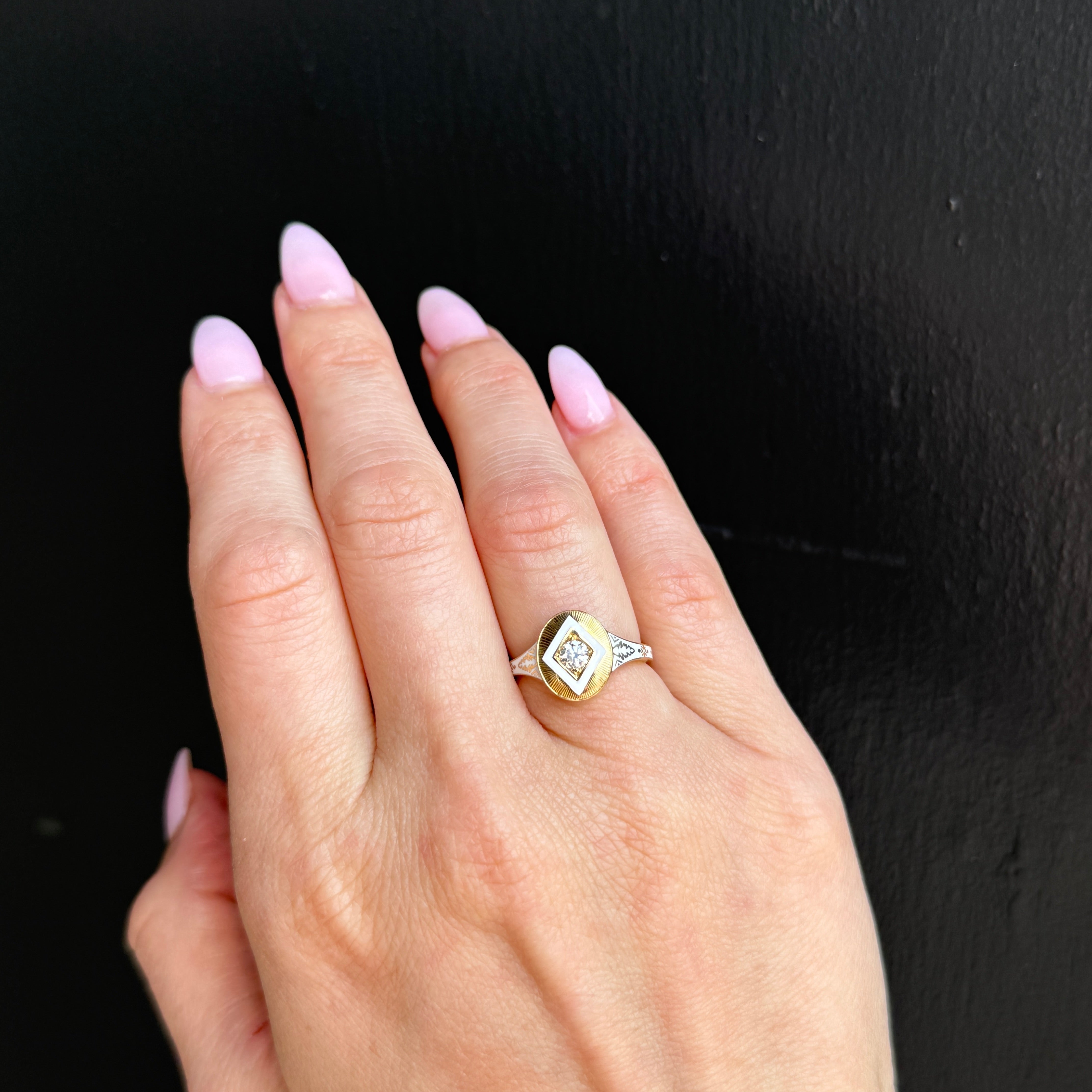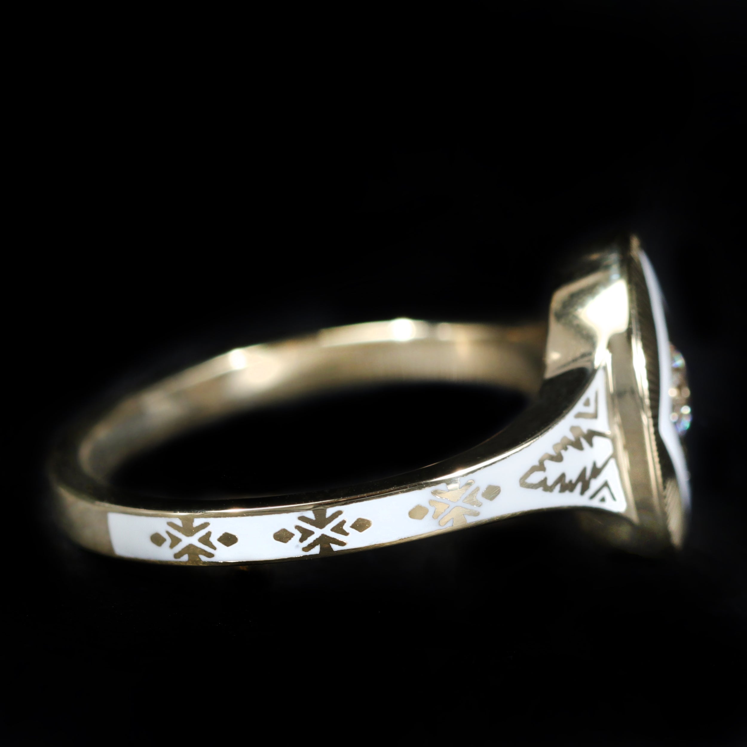 18K yellow gold, diamond, and enamel ring. An original Walton's design, this 18K yellow gold signet ring draws inspiration from 19th-century styles and Georgian enamel work. A round brilliant cut diamond sits at the center of an oval-shaped face, framed by a crisp white enamel diamond-shaped border. Rays of engraved gold radiate from the center, adding depth and movement to the design. The enamel detail lends a subtle nod to antique sentimentality, while the overall composition feels fresh and refined.