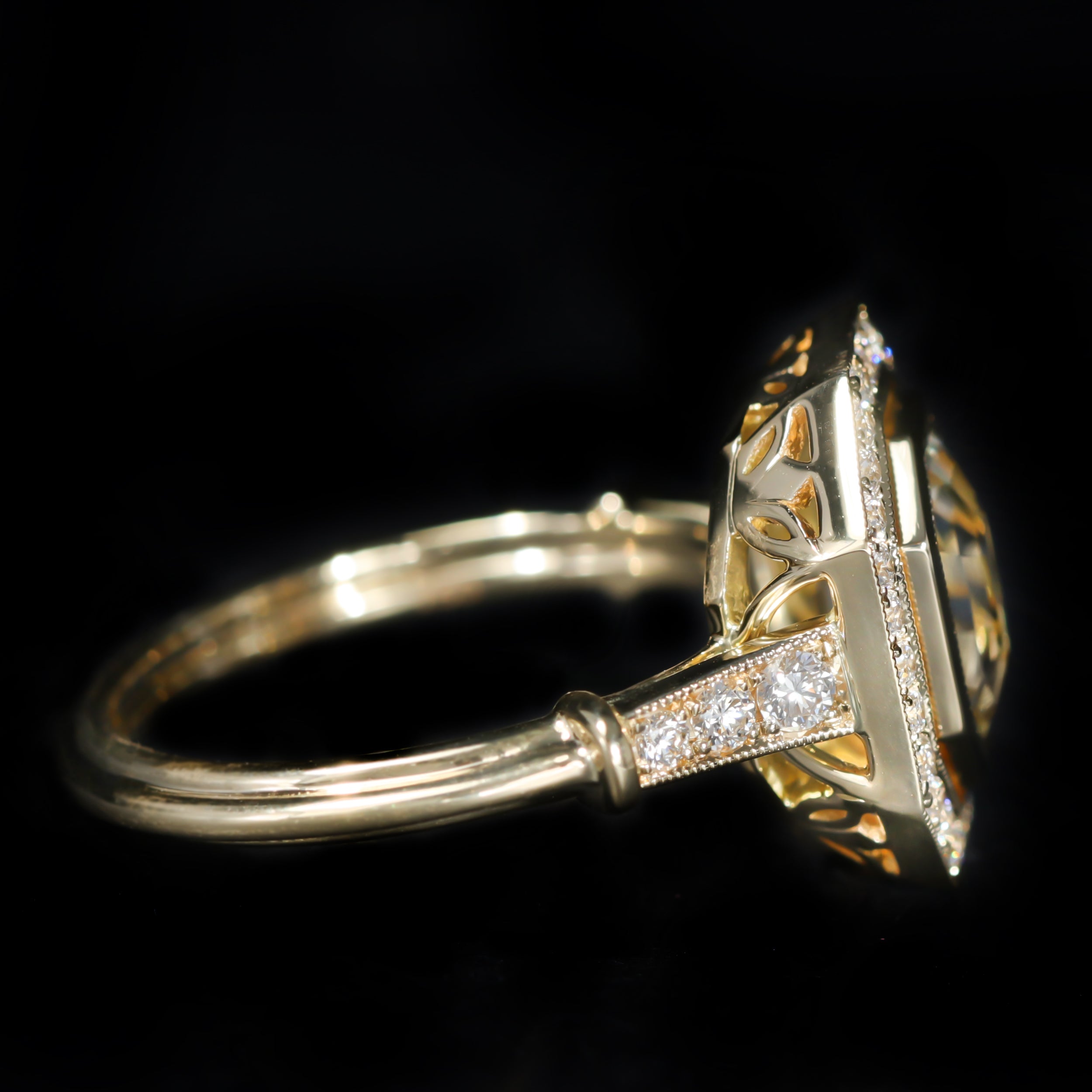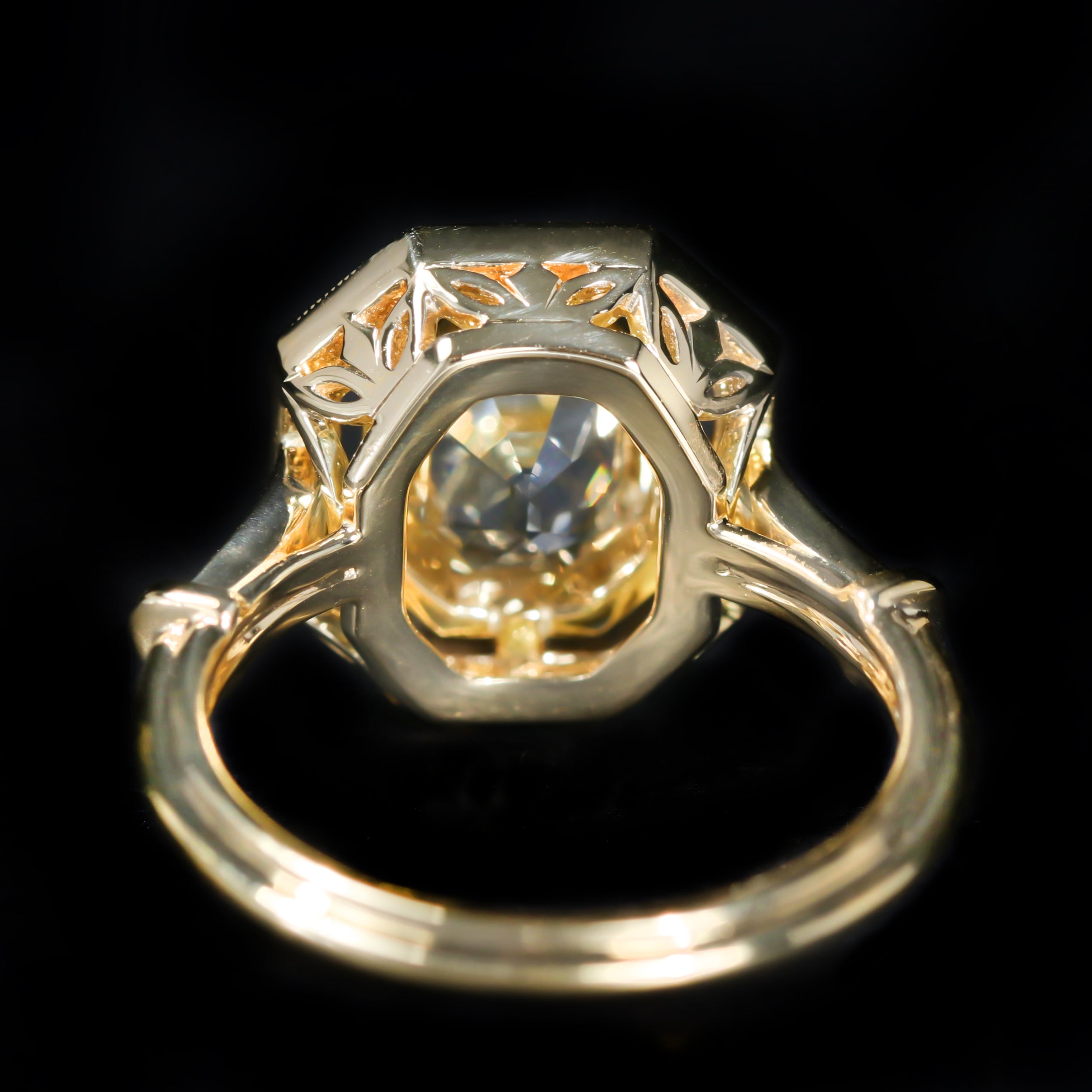 18K yellow gold, sapphire, and diamond ring. Crafted in glowing 18K yellow gold, this elegant ring centers an emerald cut sapphire. The sapphire is a soft, ethereal pale blue and yellow hue, bezel-set to highlight its clean lines. Surrounding the center is a distinctive diamond halo designed with a 'floating' effect, creating open space between the bezel and the halo to emphasize the geometric beauty of the centerpiece. Additional diamonds adorn the shoulders halfway down, all bordered in fine milgrain. Delicate filigree cutouts decorate the gallery, completing this refined and artful setting.