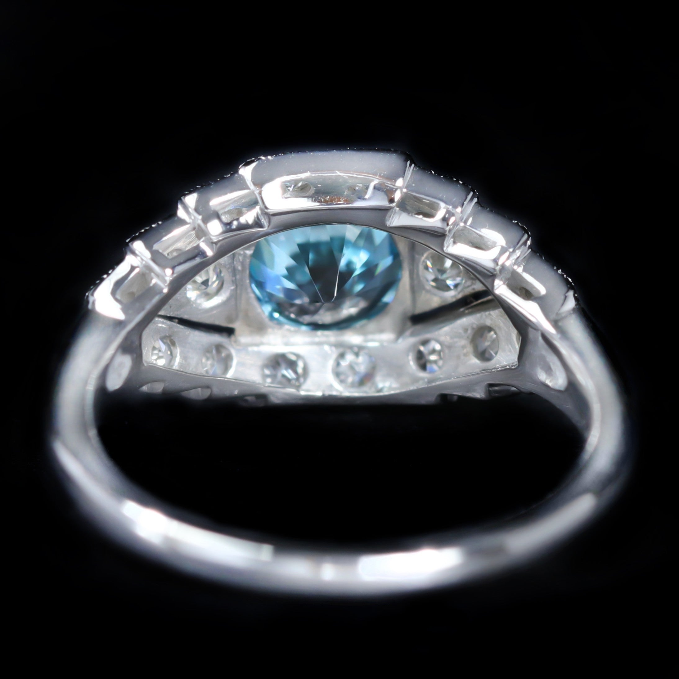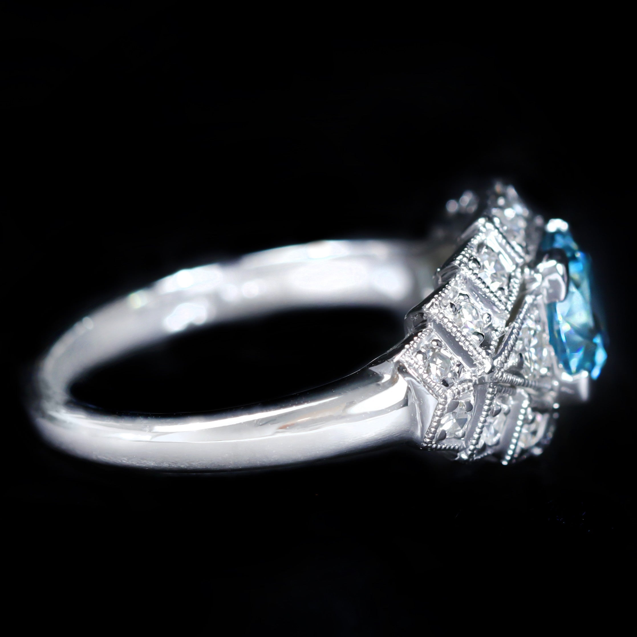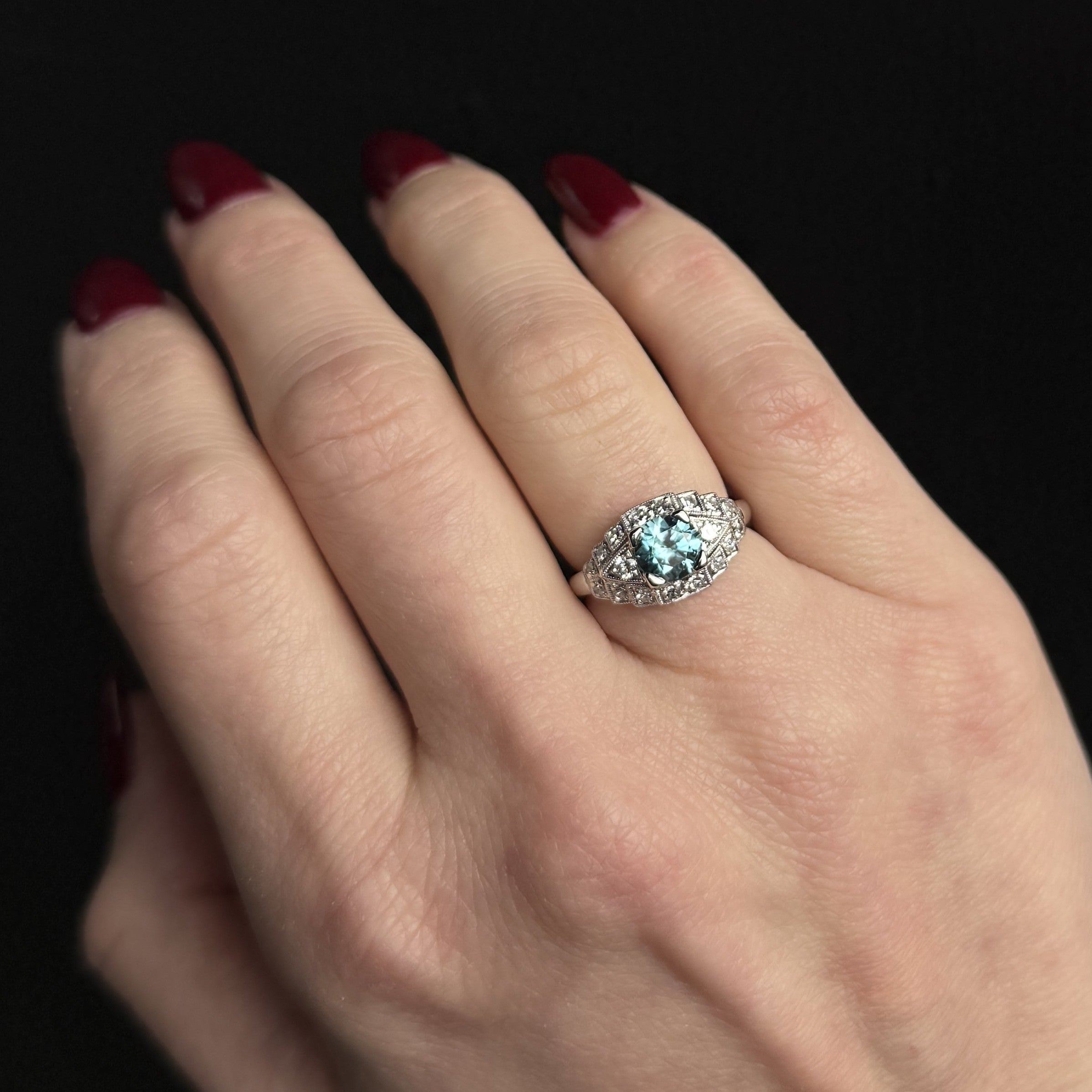 14K white gold, zircon, and diamond ring. A vivid round blue zircon anchors this 14K white gold ring in striking color and sparkle. An array of diamonds accent the centerpiece, all set within an Art Deco-inspired mounting rich with geometric detail, openwork, and fine milgrain edging.