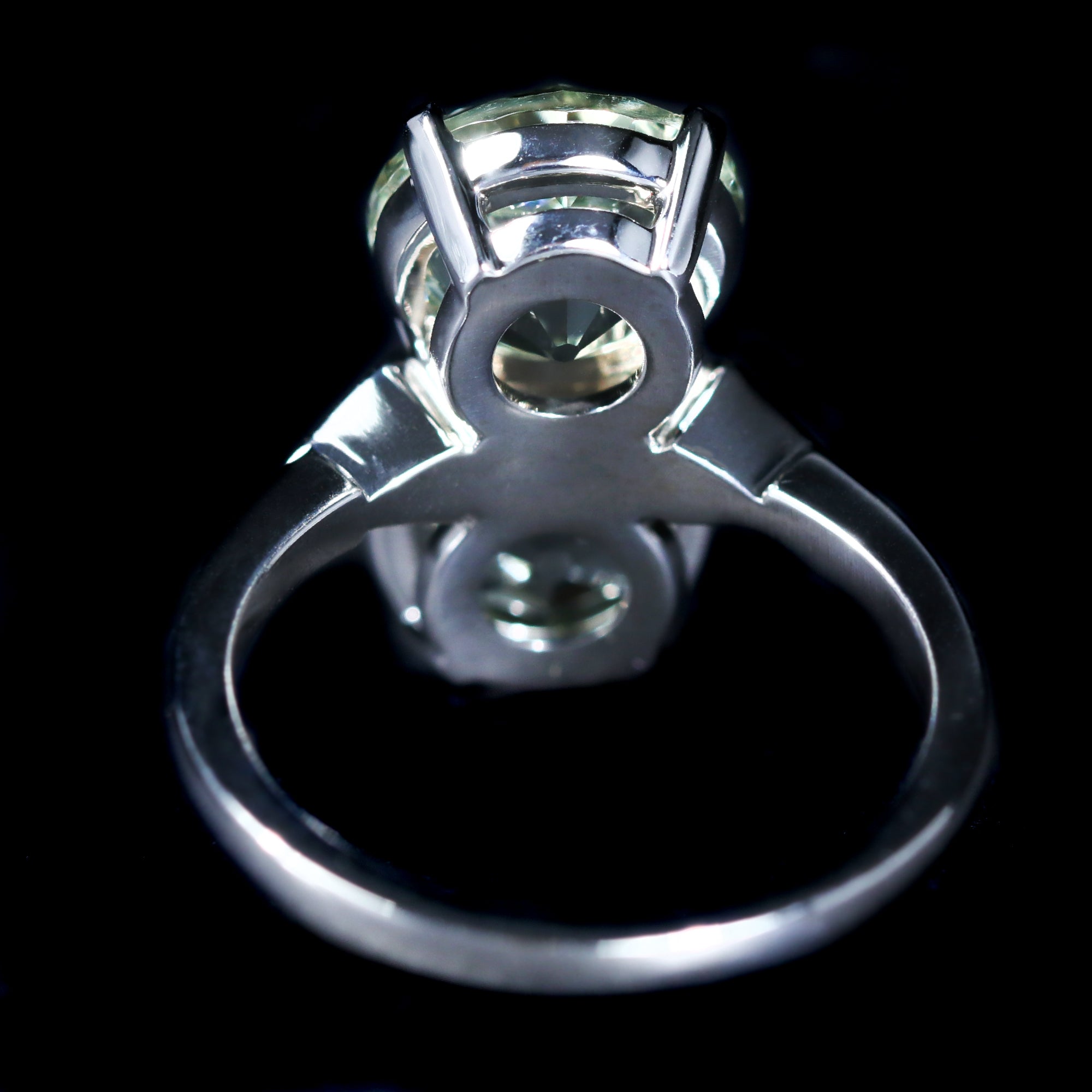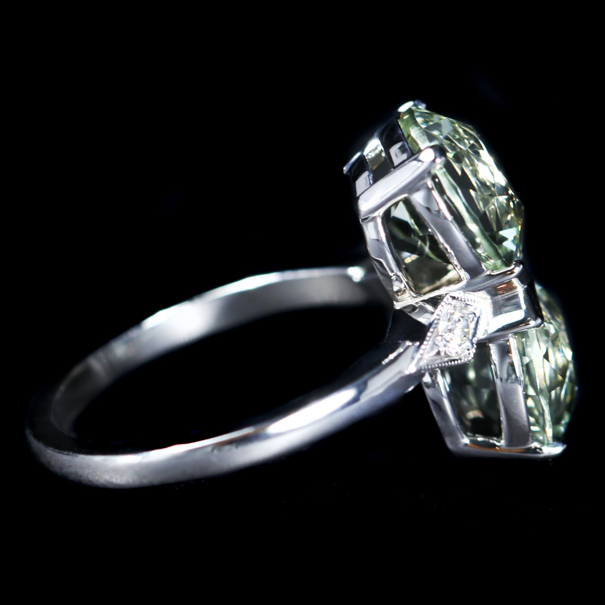 • Center Gem Details: 2 Old European Cut Prasiolites (approx. 5.19 carats total weight)