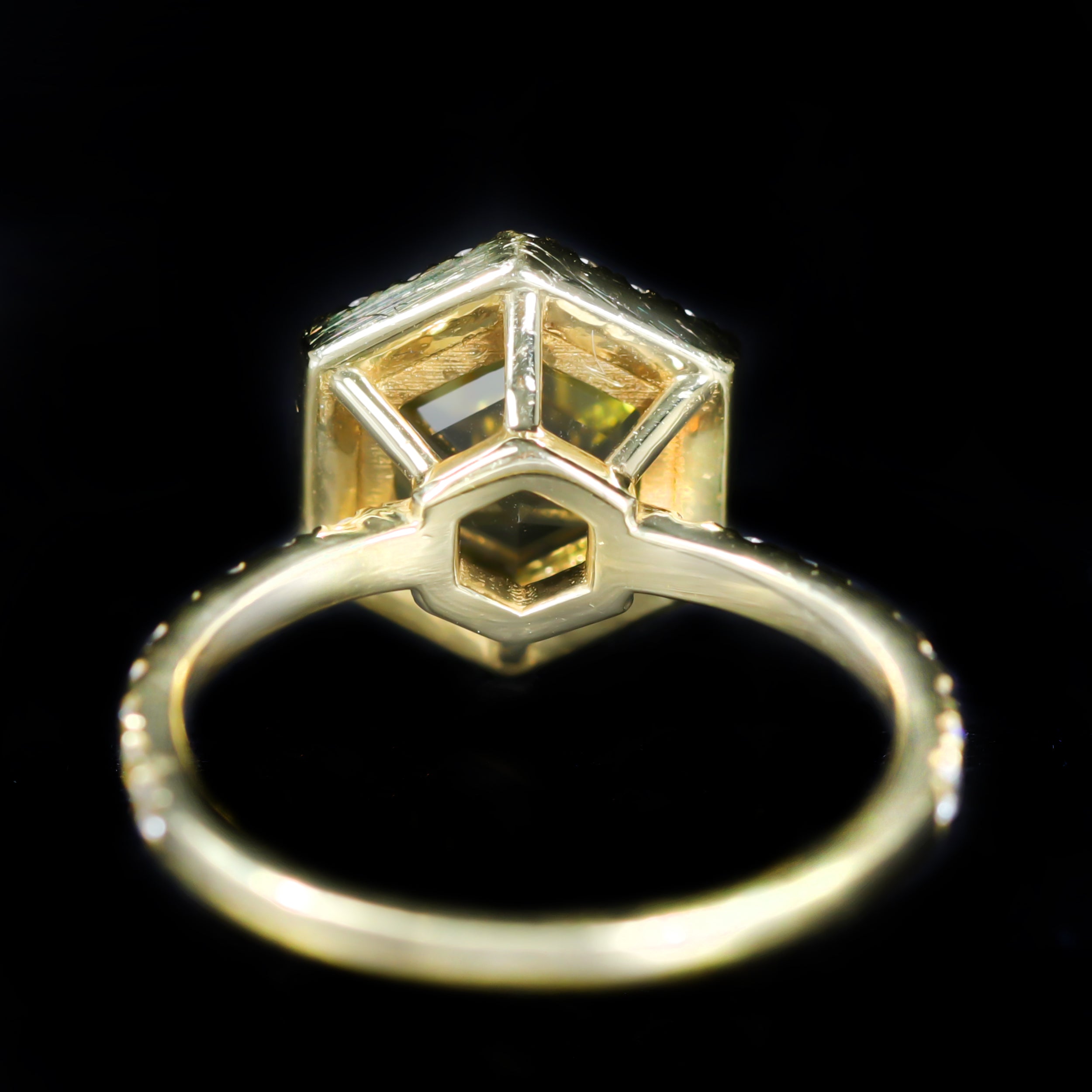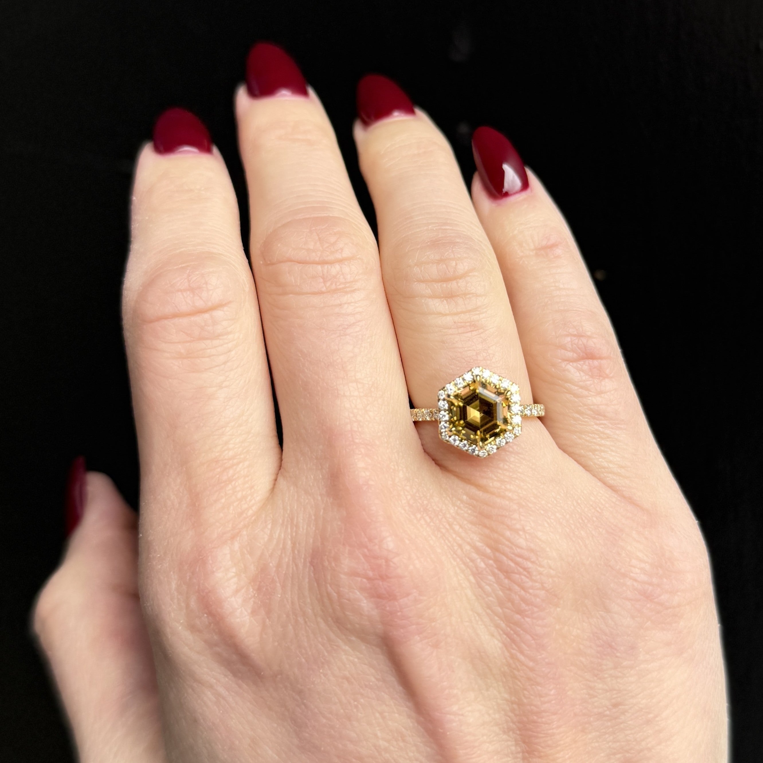 14K yellow gold, tourmaline, and diamond ring. A striking hexagon-cut tourmaline anchors this 14K yellow gold ring, its golden hues enhanced by the crisp geometry of six claw prongs. Surrounding the center gem, a halo of round brilliant cut diamonds traces the hexagonal silhouette, adding radiance and definition. Additional diamonds extend along each side of the shank, creating a continuous sparkle that elevates the design. Bold, modern lines meet warm, luminous color in this distinctive and beautifully crafted piece.
