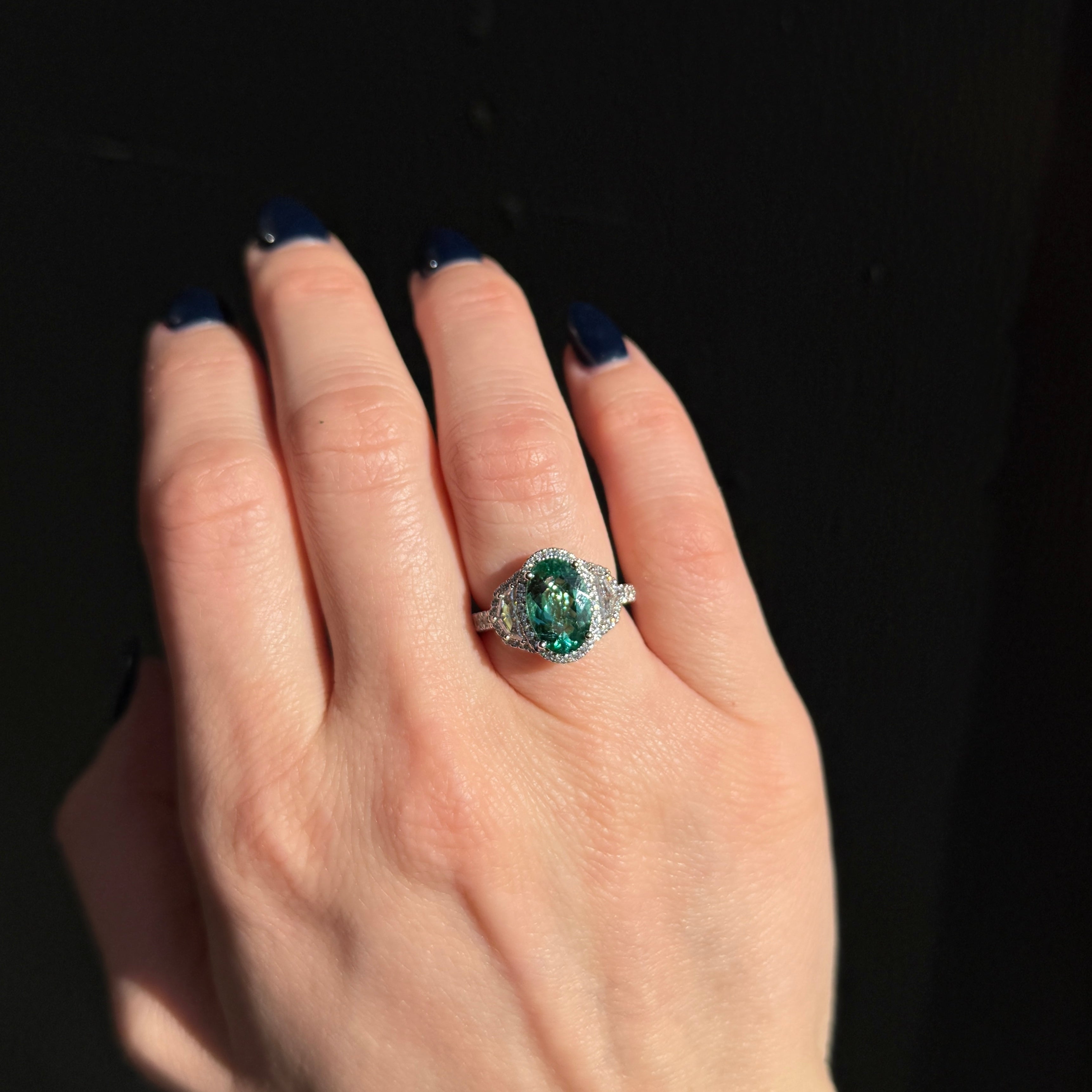 Platinum, tourmaline, and diamond ring. A breathtaking 2.45 carat Paraiba tourmaline glistens at the center of this platinum ring, its vivid neon-blue hue—so prized in the gem world—immediately commanding attention. The oval cut Paraiba is flanked by two epaulette cut diamonds, their crisp geometry enhancing the gem’s electric glow. All three gems are framed by a border of round brilliant cut diamonds. Exquisitely crafted, this ring captures the extraordinary beauty of one of the world’s rarest and most sought-after gemstones.