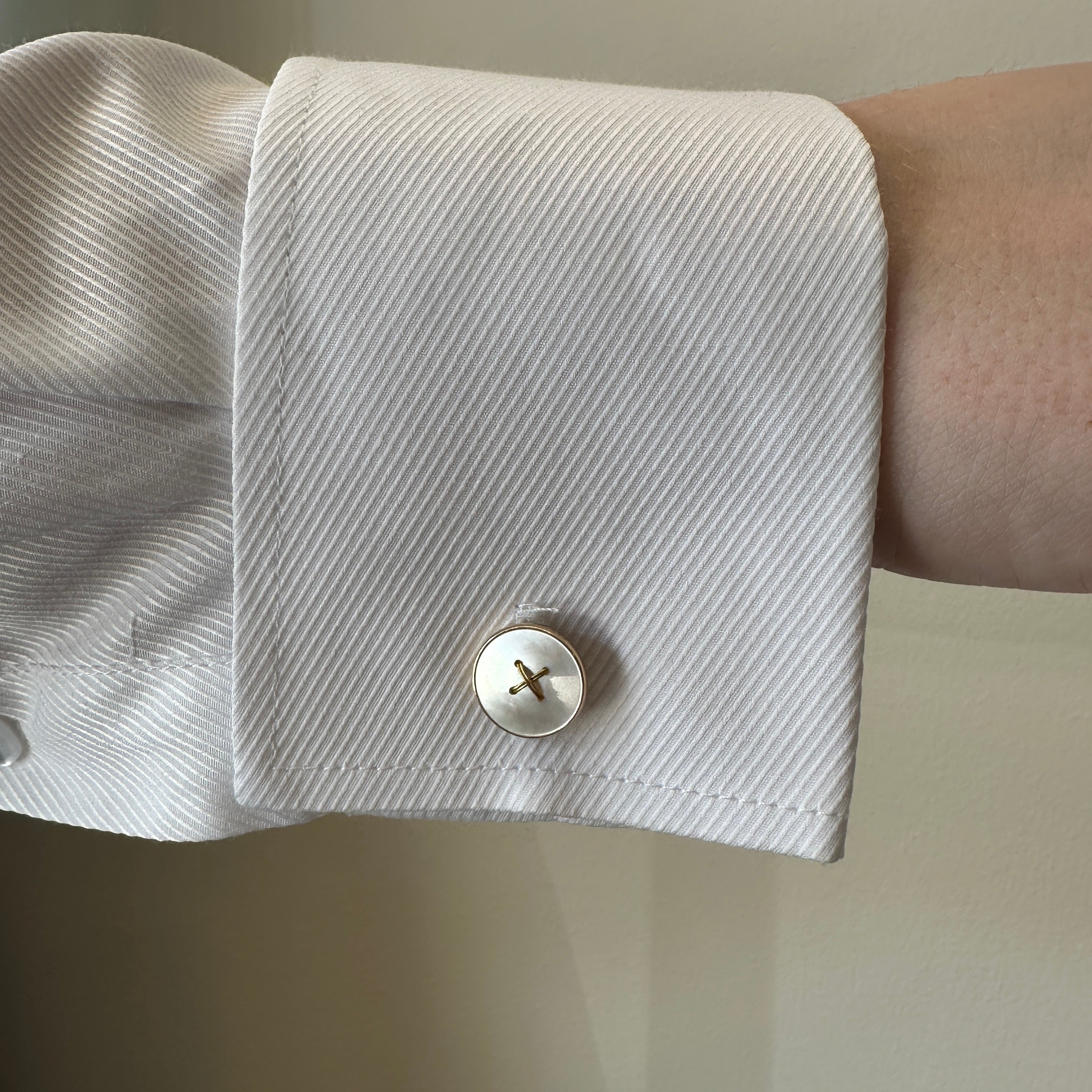 Edwardian 14K yellow gold mother of pearl suit set. This early 1900s suit set includes a pair of cufflinks and four matching button studs, all presented in their original fitted box. Each piece features a luminous disc of mother of pearl, polished to a soft sheen and set in gold, evoking the refined style of the early 20th century. Designed for formal wear, the set reflects the elegance and craftsmanship of the Edwardian era—a rare and complete ensemble that has been beautifully preserved.
