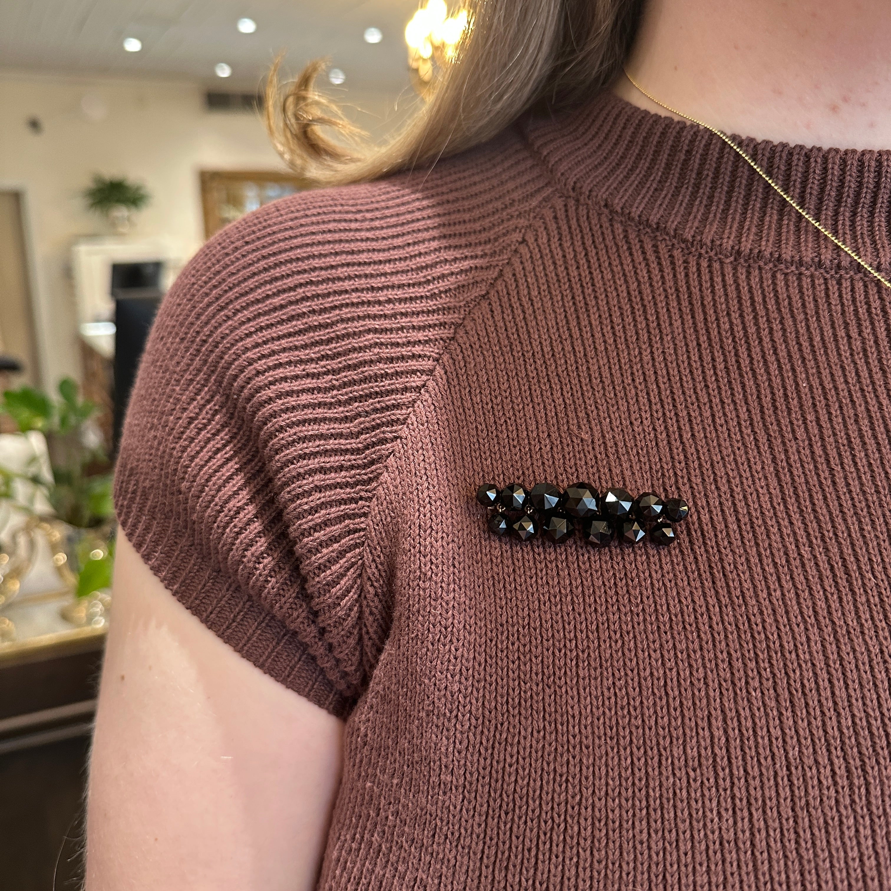 Victorian 14K yellow gold and onyx brooch. This beautiful Victorian accessory features a refined and subtly dramatic design, showcasing two rows of faceted onyx beads that gracefully taper in size. Set along a slender bar pin, the 13 onyx beads are strung in a way that allows them to move slightly, catching the light with each shift. The deep black of the onyx contrasts beautifully with the warm gold, creating a striking piece that reflects the era’s appreciation for both sentiment and style. Circa 1880–1900.