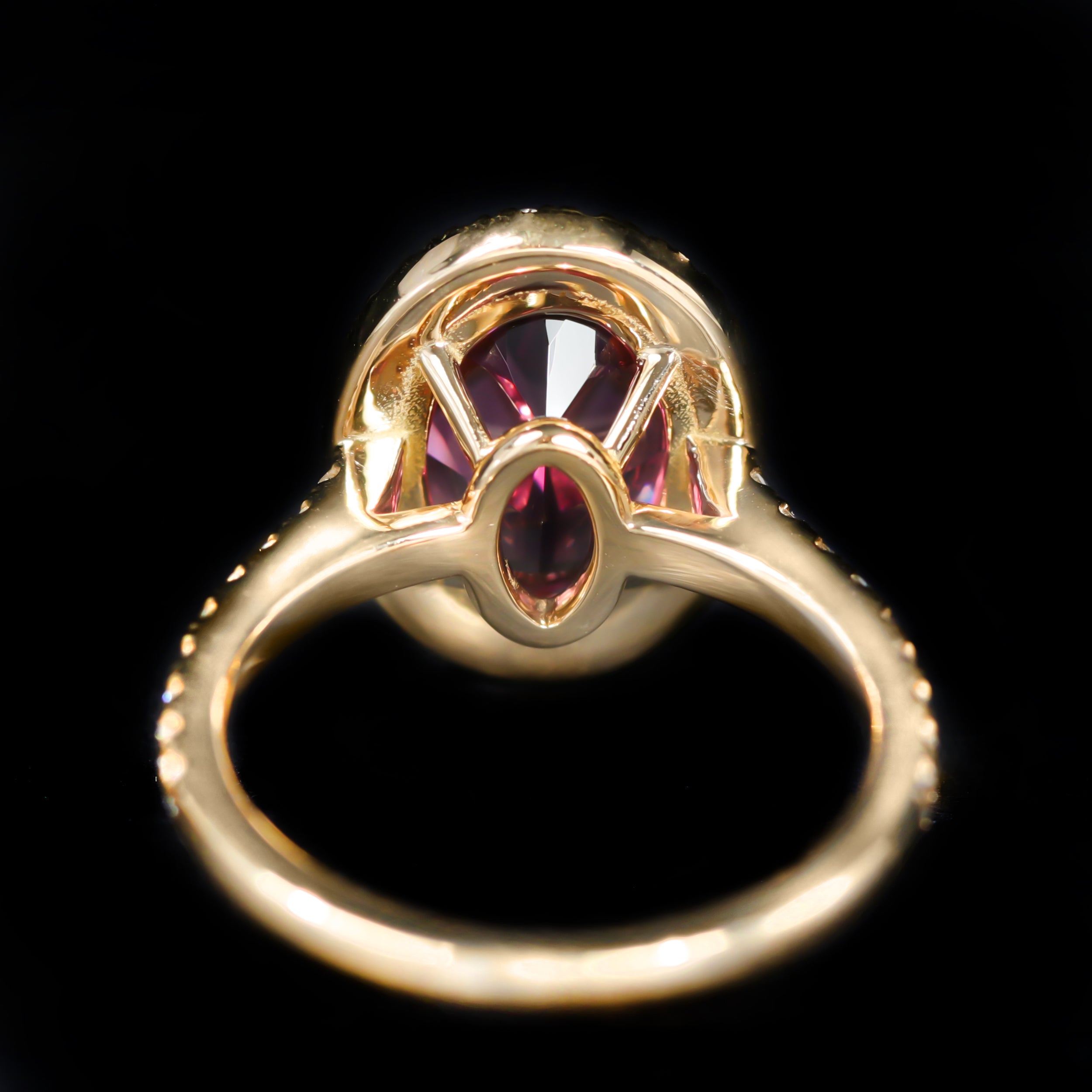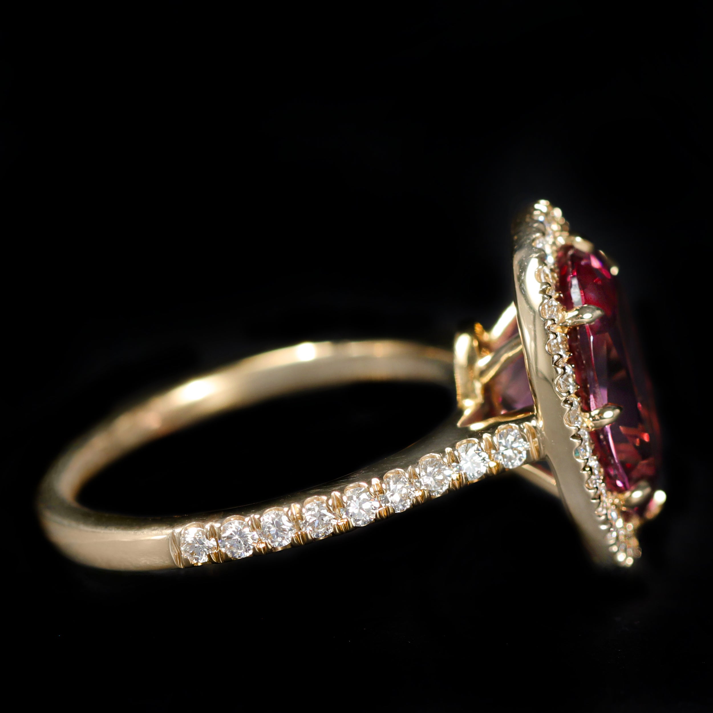 18K yellow gold garnet and diamond ring. In this elegant halo design, a vivid oval cut garnet weighing 4.07 carats glows with rich raspberry and magenta hues. The stunning center stone is encircled by a halo of 45 round brilliant cut diamonds that continue along the band, adding an extra layer of sparkle and brilliance. Crafted in luxurious 18K yellow gold, this ring is a captivating blend of timeless elegance and modern glamor