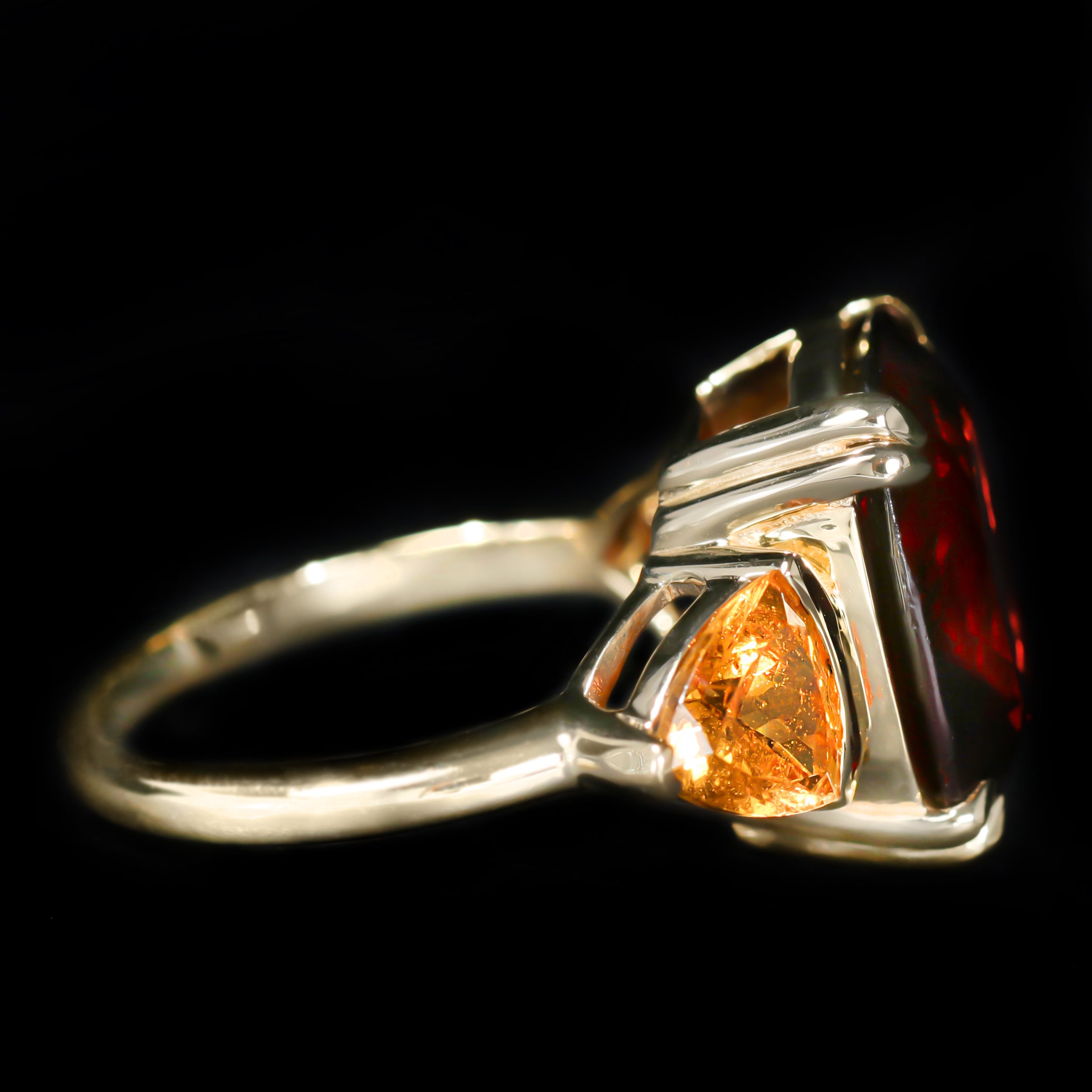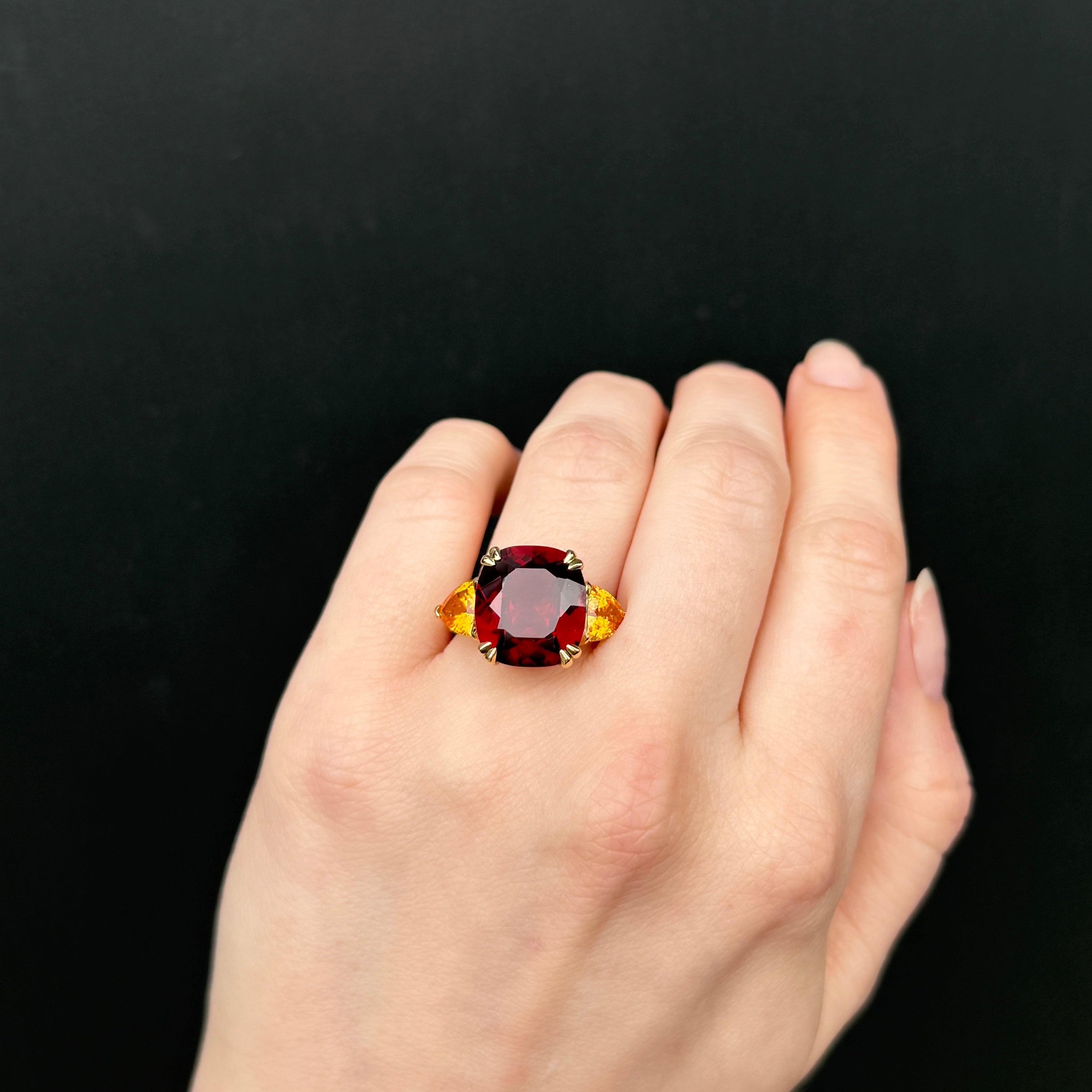 18K yellow gold and garnet ring. This striking ring showcases a rich interplay of color and shape. A deeply saturated, cushion-cut red garnet rests at the center, its bold hues and generous size giving the piece a commanding presence. Flanking the center stone are two trillion-cut orange garnets, their vivid, fiery color providing a brilliant contrast to the red centerpiece. The warm gold setting enhances the rich tones of the garnets, creating a dramatic and beautifully balanced composition that feels both luxurious and artful.