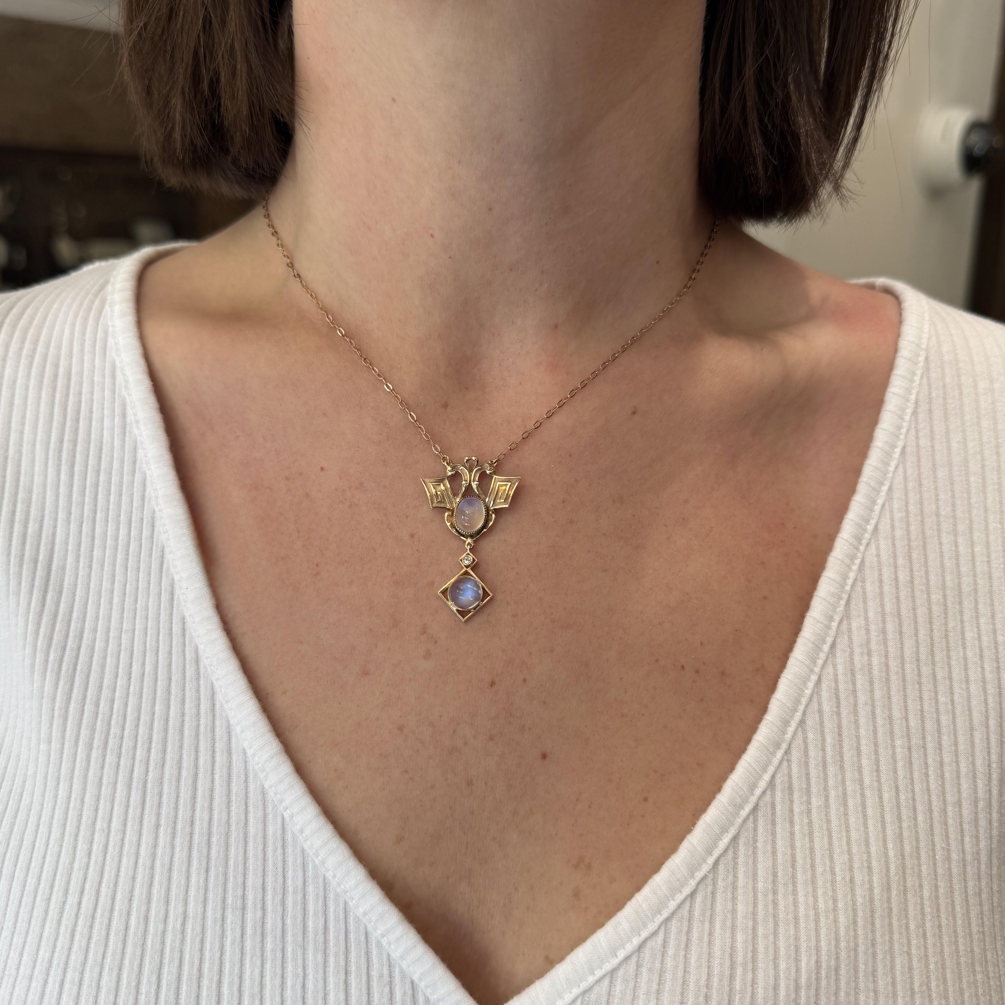 Arts & Crafts 14K yellow gold, moonstone, and diamond necklace. A rare treasure from the Arts & Crafts era, this 14k yellow gold necklace showcases a striking geometric pendant set with two luminous moonstones—one oval, one round—and a single Old Mine cut diamond nestled between. The handcrafted design reflects the movement’s hallmark emphasis on artistry over mass production, with bold lines, organic forms, and a distinctly architectural feel. The moonstones glow with ethereal light, while the antique diamond adds just the right touch of brilliance. A one-of-a-kind piece that embodies the spirit of craftsmanship and individuality.