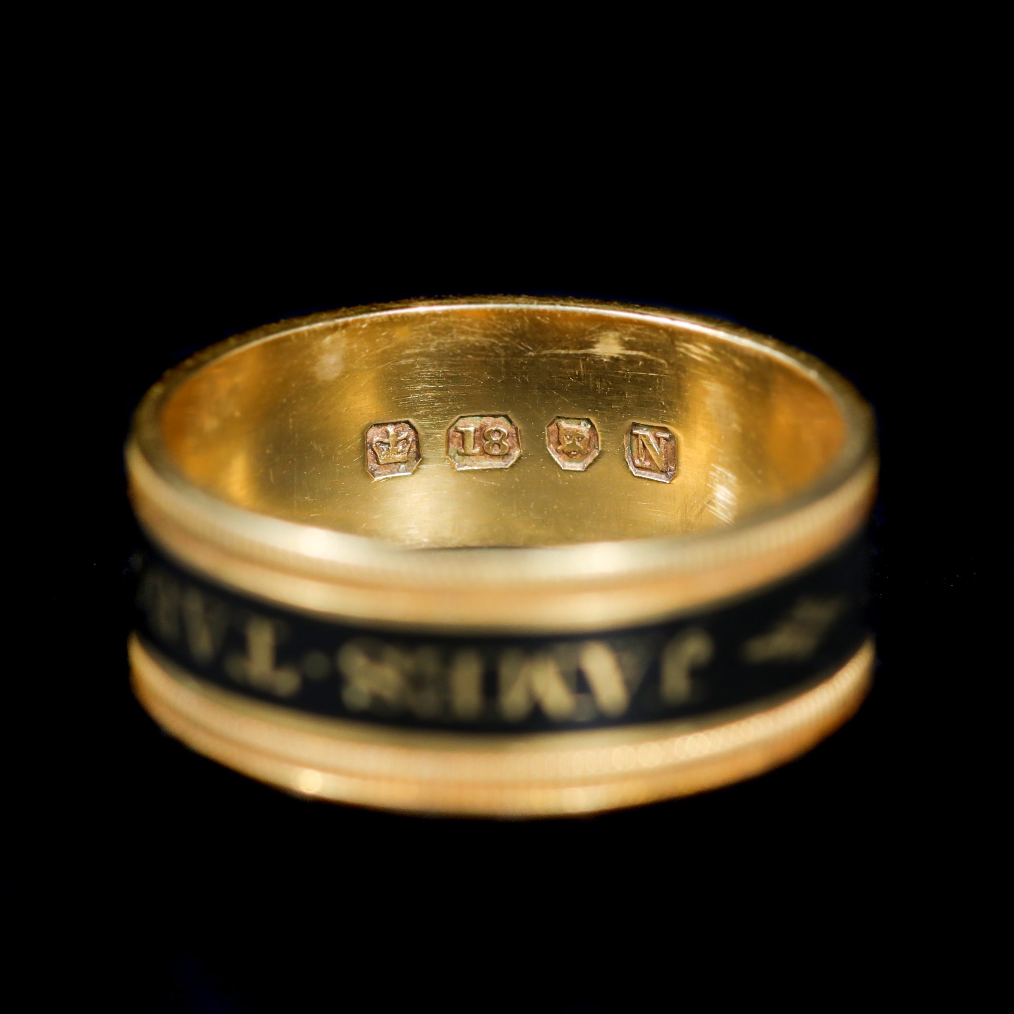 Victorian 18K yellow gold and enamel mourning ring, circa 1888. This beautifully crafted Victorian mourning ring was made in London in 1888-1889 to honor James Tabor, who died on June 26, 1888, at the age of 88. The ring features a classic black enamel inscription with gold lettering, continuing the long-standing English tradition of memorial jewelry well into the late 19-century. Its interior hallmarks include the leopard's head for London, crown 18K gold mark, maker's mark "EE," and date letter "N," confirming its Victorian origin.