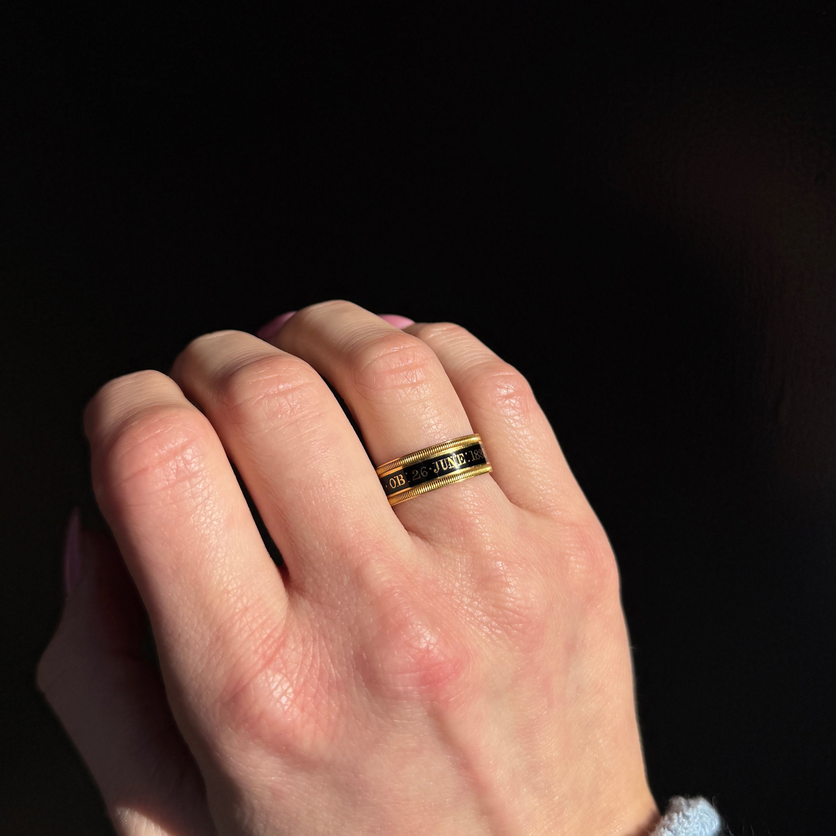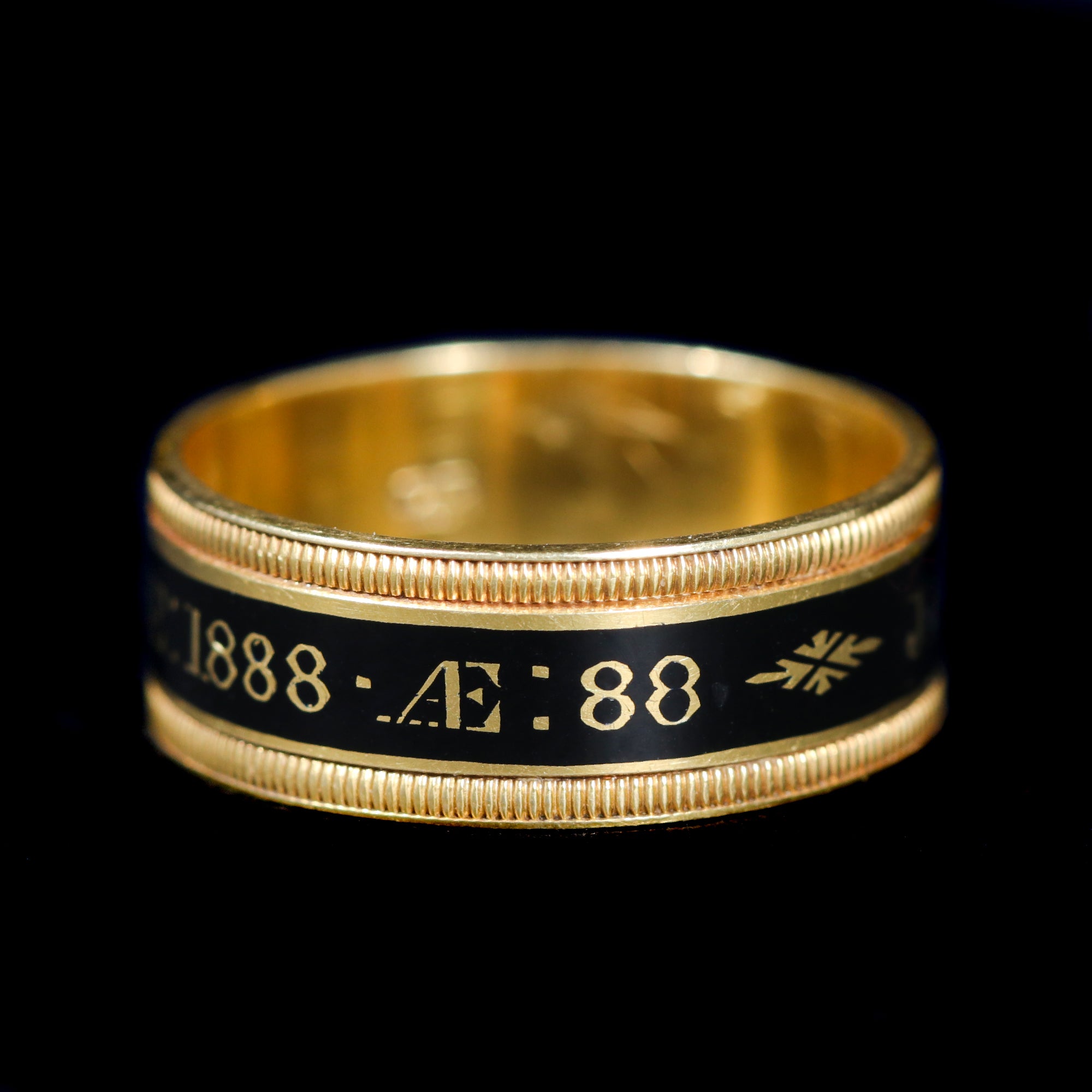 Victorian 18K Yellow Gold and Enamel Mourning Ring, Circa 1888
