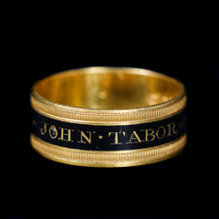By the late Victorian era, mourning jewelry remained an important expression of family loyalty and remembrance, often commissioned to mirror earlier heirlooms. Notably, this ring closely matches an earlier Georgian example honoring John Tabor, suggesting a deliberate effort to preserve family tradition across generations.