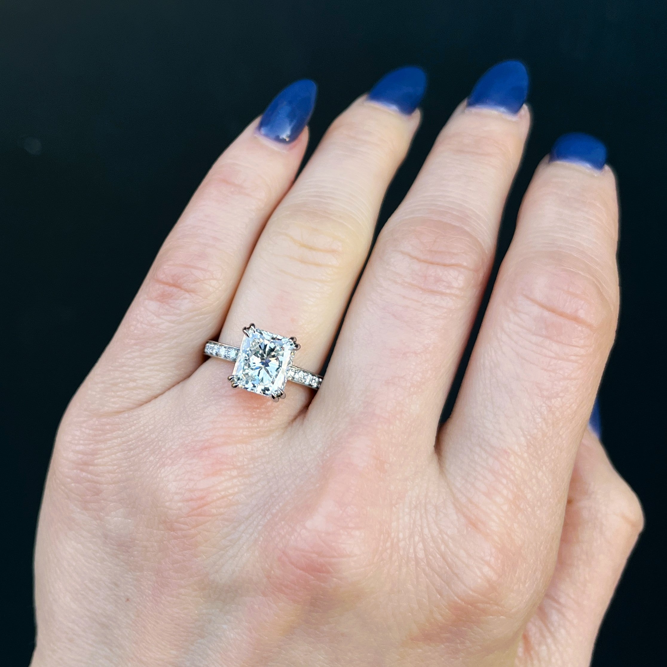 Platinum and diamond ring. This exquisite platinum engagement ring showcases a breathtaking GIA 3.09 carat radiant cut diamond, secured in four double claw prongs to emphasize its brilliance and modern shape. A subtle yet dazzling hidden halo of diamonds encircles the base of the center stone while additional diamonds are delicately set along the band.