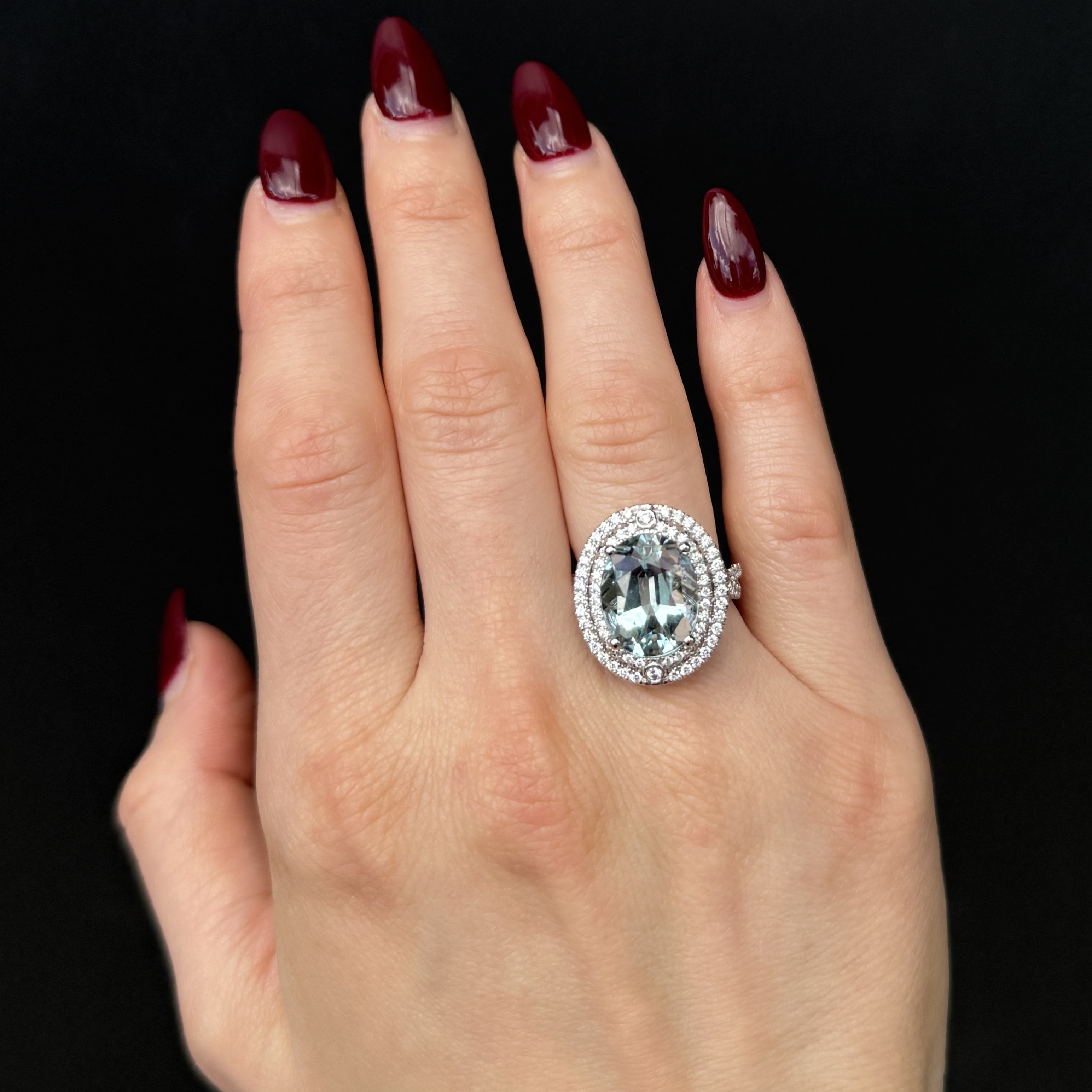 14K white gold, aquamarine, and diamond ring. Elegant and eye-catching, this 14K white gold ring showcases an oval-cut aquamarine at its center, shimmering in serene, icy blue tones. The gem is framed by a dazzling double halo of round brilliant cut diamonds that enhance its brilliance. The shoulders feature a graceful infinity twist motif, also set with diamonds, which continues halfway down the shank for a romantic and timeless design. A perfect blend of softness and sparkle.
