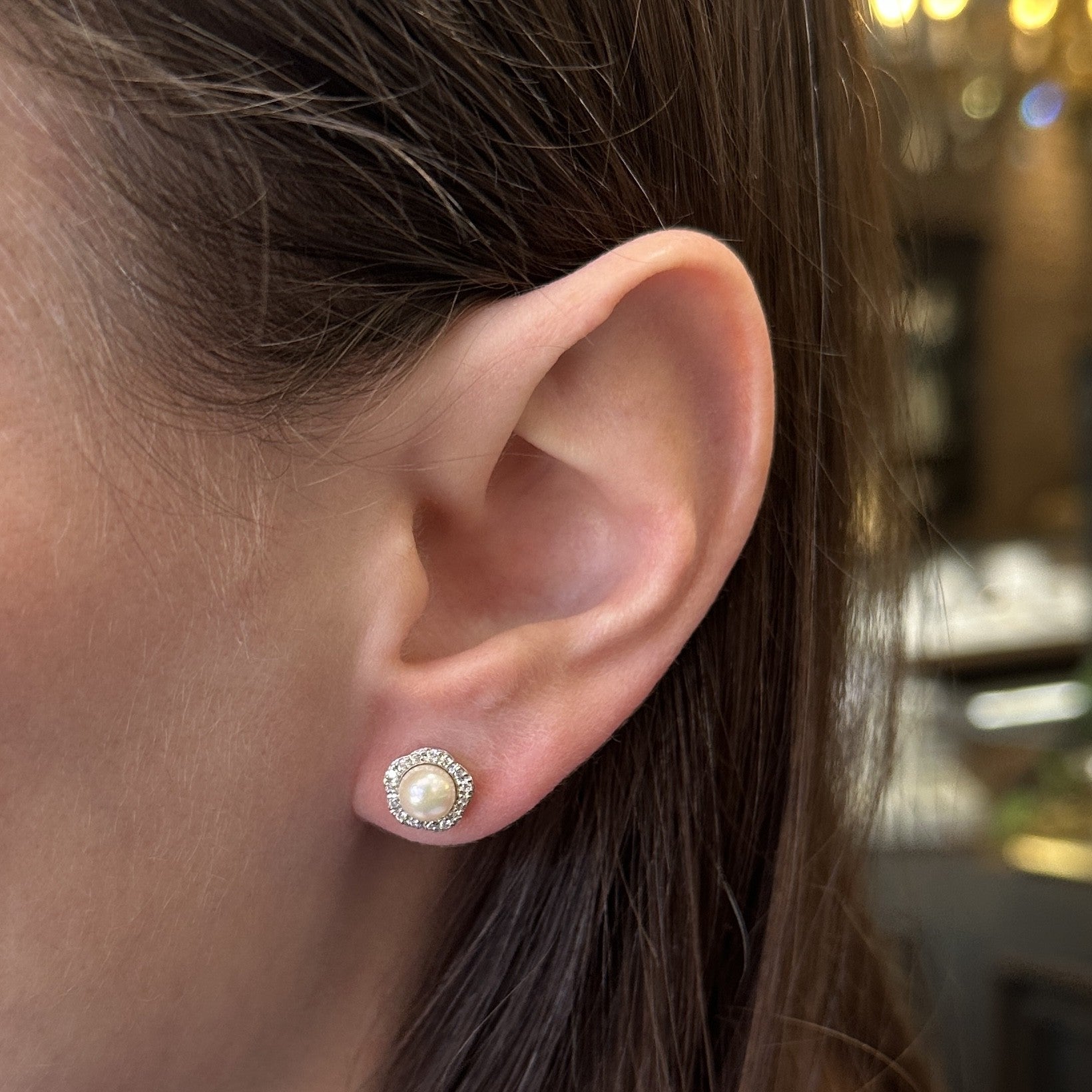 14K white gold, diamond, and pearl earrings. In a lovely floral motif, these sweet earrings feature two luminous pearls surrounded by a glittering halo of round brilliant cut diamonds. The earrings feature a 14K white gold post and friction style back.