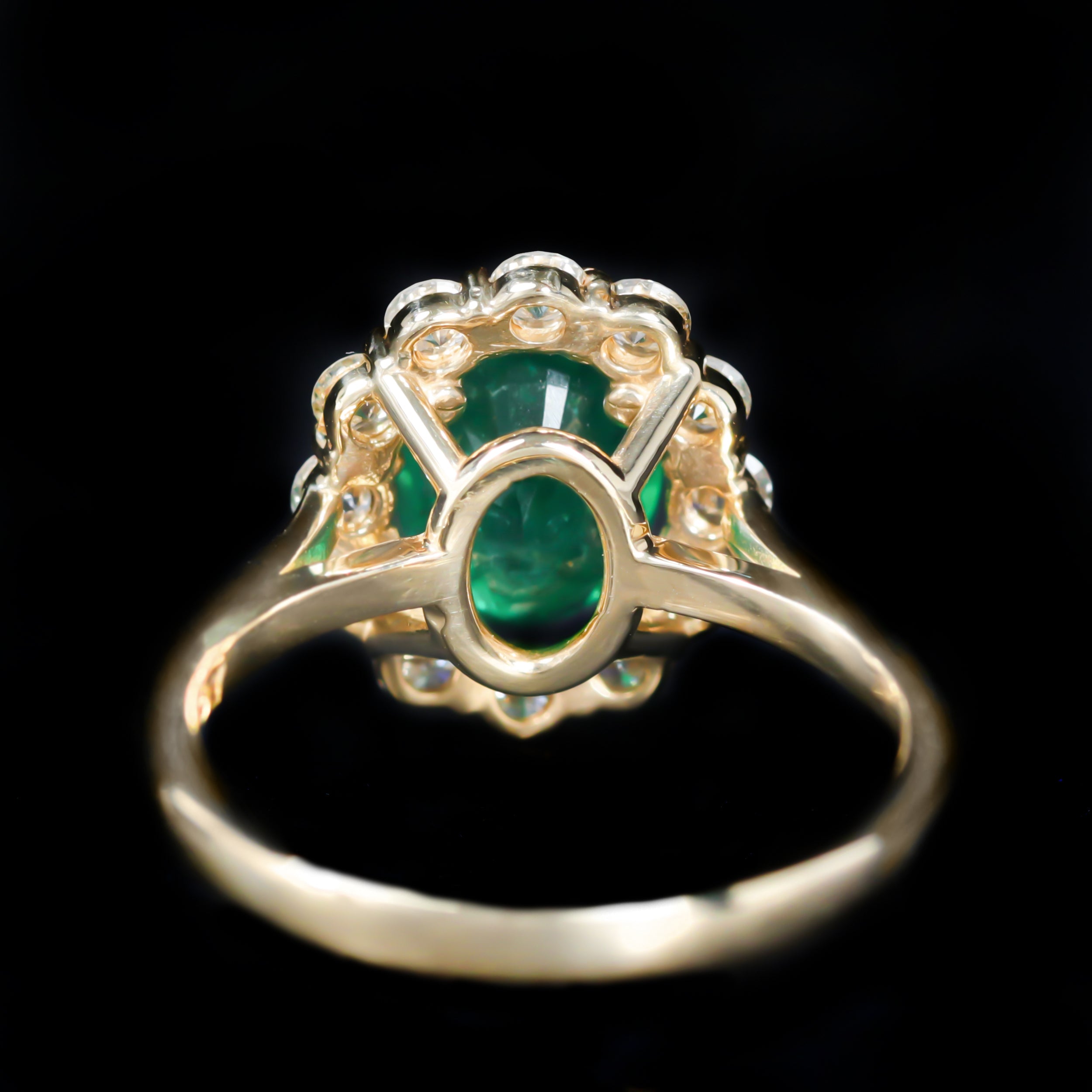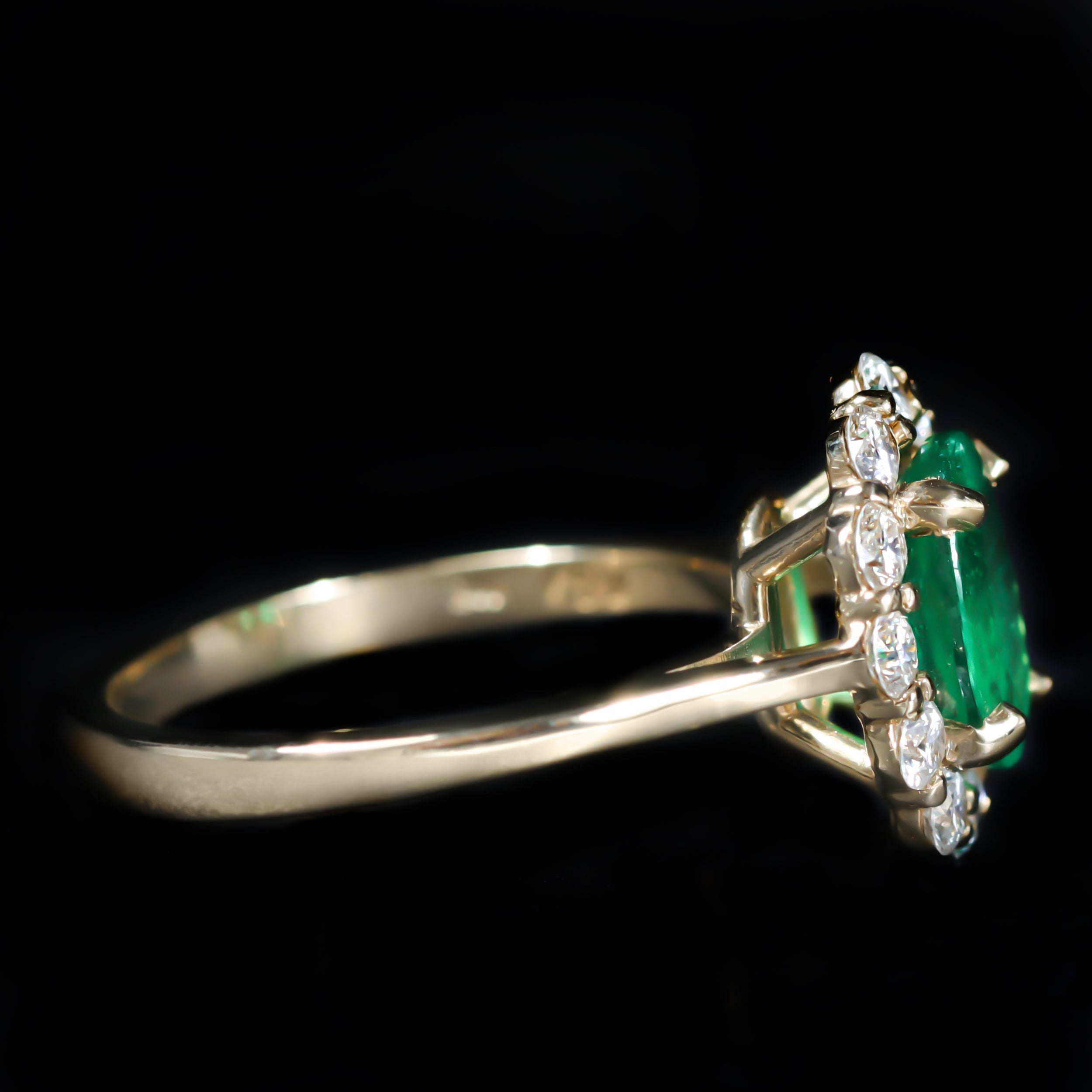 14K yellow gold, emerald, and diamond ring. A breathtaking, glowing green emerald, captivates at the center of this exceptionally stunning ring. Surrounding the emerald is a scalloped halo of twelve round brilliant cut diamonds, expertly set to create a dazzling effect. Its timeless design ensures that it will be treasured for years to come.