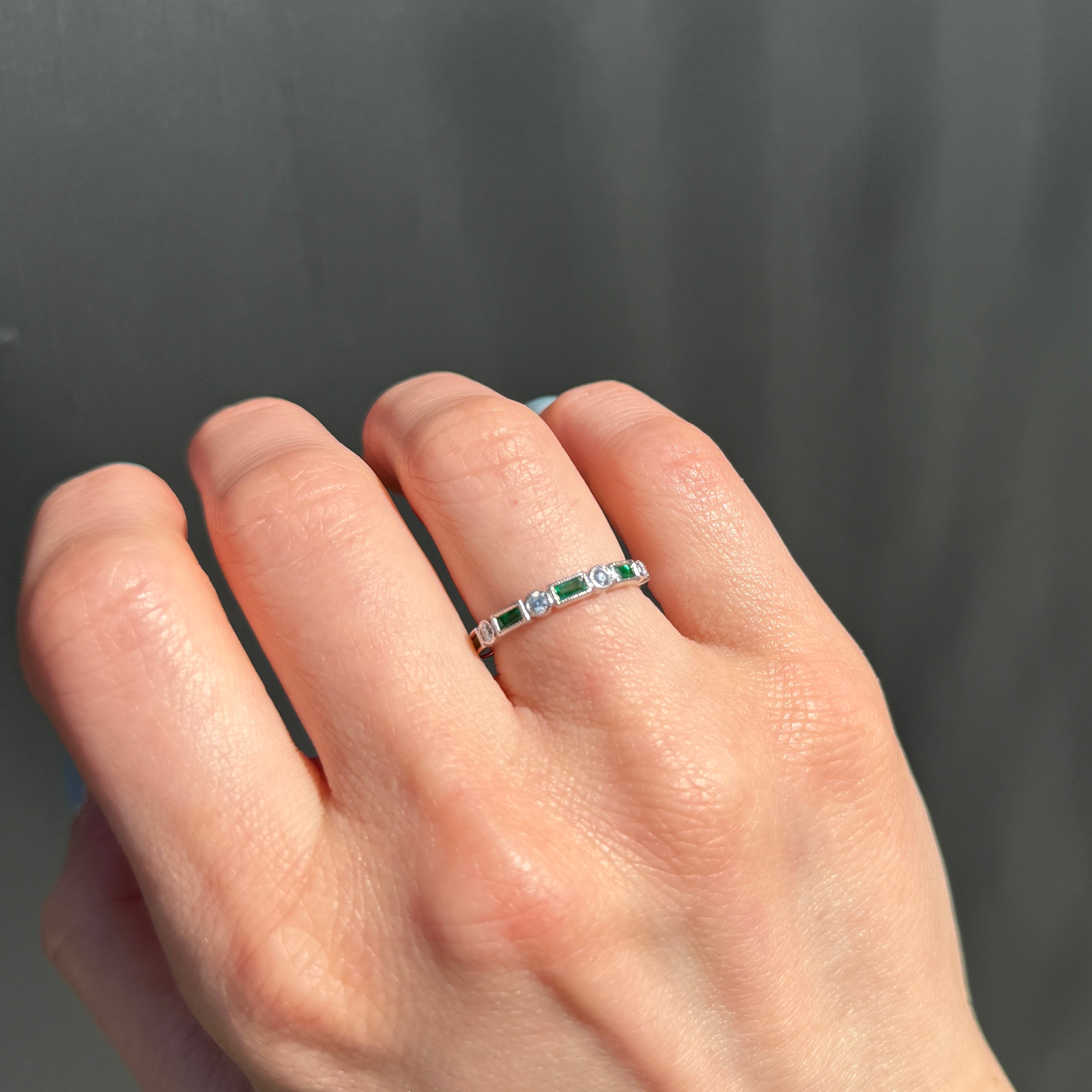 18K white gold, emerald, and diamond band. Four baguette cut green emeralds and five round diamonds alternate in individual bezel settings across the top half of this 18K white gold band, the clean lines of the baguette emeralds creating a striking contrast against the soft brilliance of the round diamonds. A refined and distinctive band that is as beautiful stacked with complementary pieces as it is worn alone.