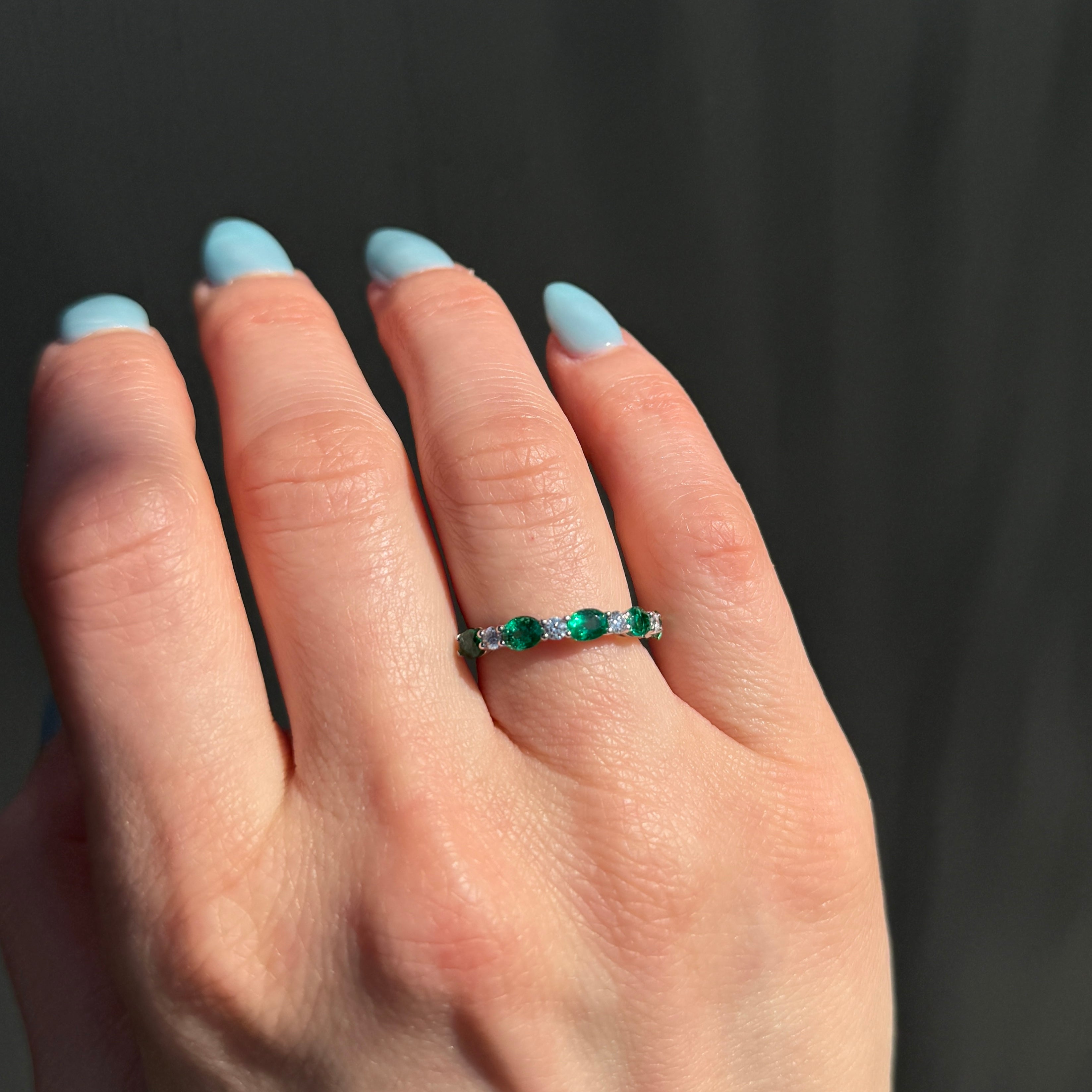 18K white gold, emerald, and diamond band. Five oval cut emeralds and four round diamonds alternate across the top half of this 18K white gold band, each stone sharing prongs with its neighbor in a seamless, continuous design that allows the gems to take full center stage. The shared prong setting creates a sleek, uninterrupted flow of rich green color and brilliant sparkle, giving the band a clean and modern elegance.