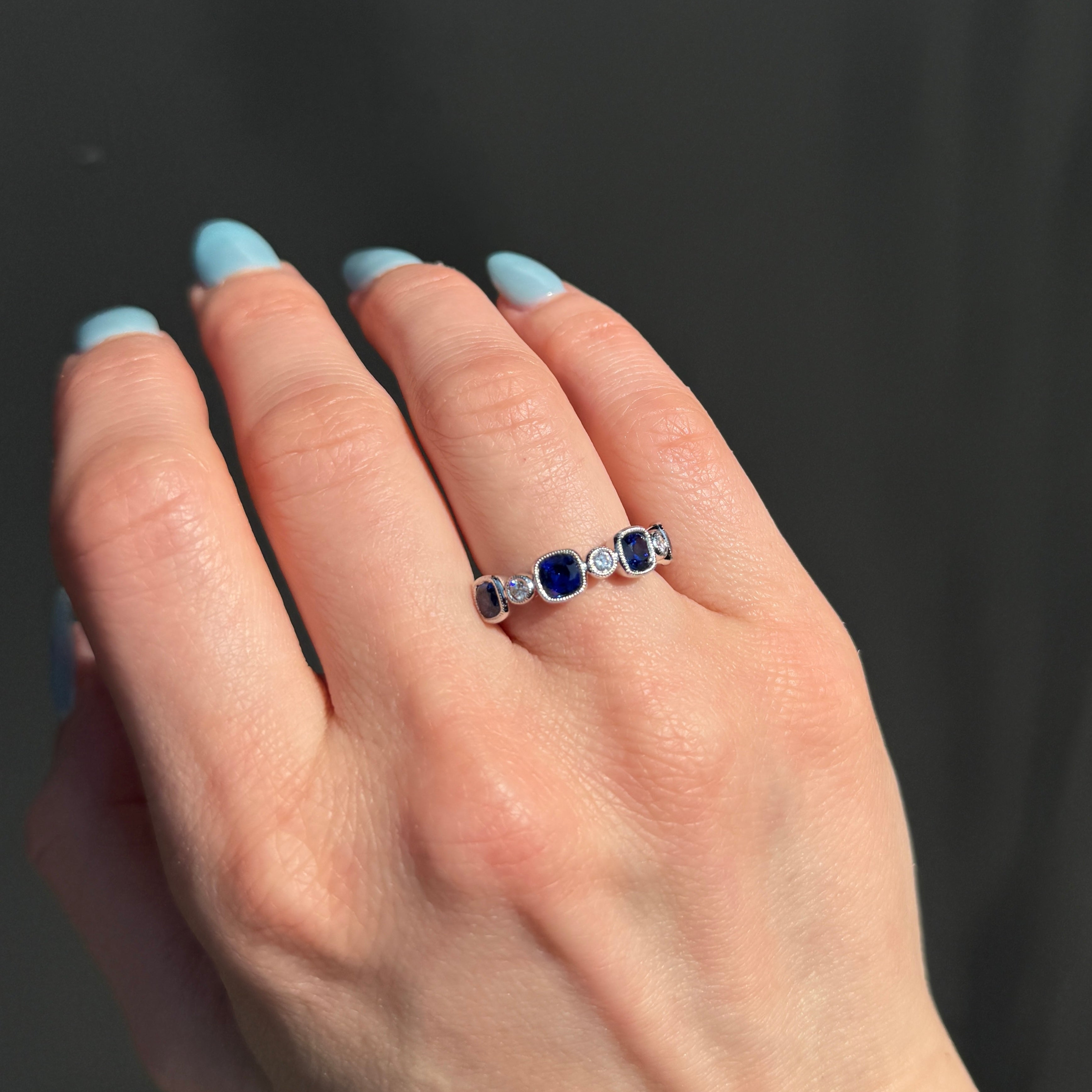 18K white gold, sapphire, and diamond band. Four cushionl cut sapphires and three round diamonds alternate in individual bezel settings along this 18K white gold band, each stone framed by delicate milgrain edging that adds a beautifully refined, handcrafted detail. The larger sapphires create a bold rhythm of rich blue color, softened beautifully by the brilliant diamonds nestled between them. Cool white gold and the classic elegance of the bezel and milgrain combination make this a timeless band that wears as well alone as it does within a carefully curated stack.