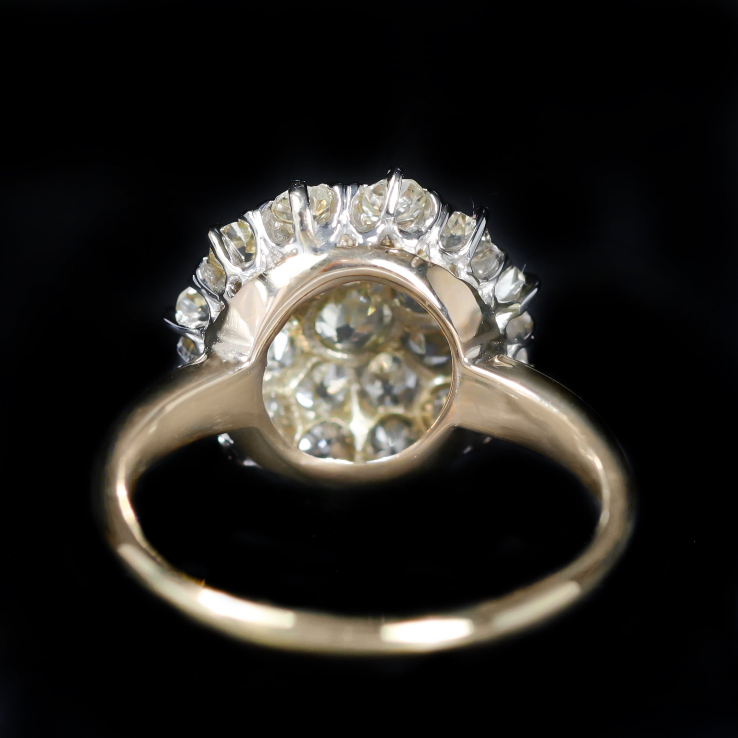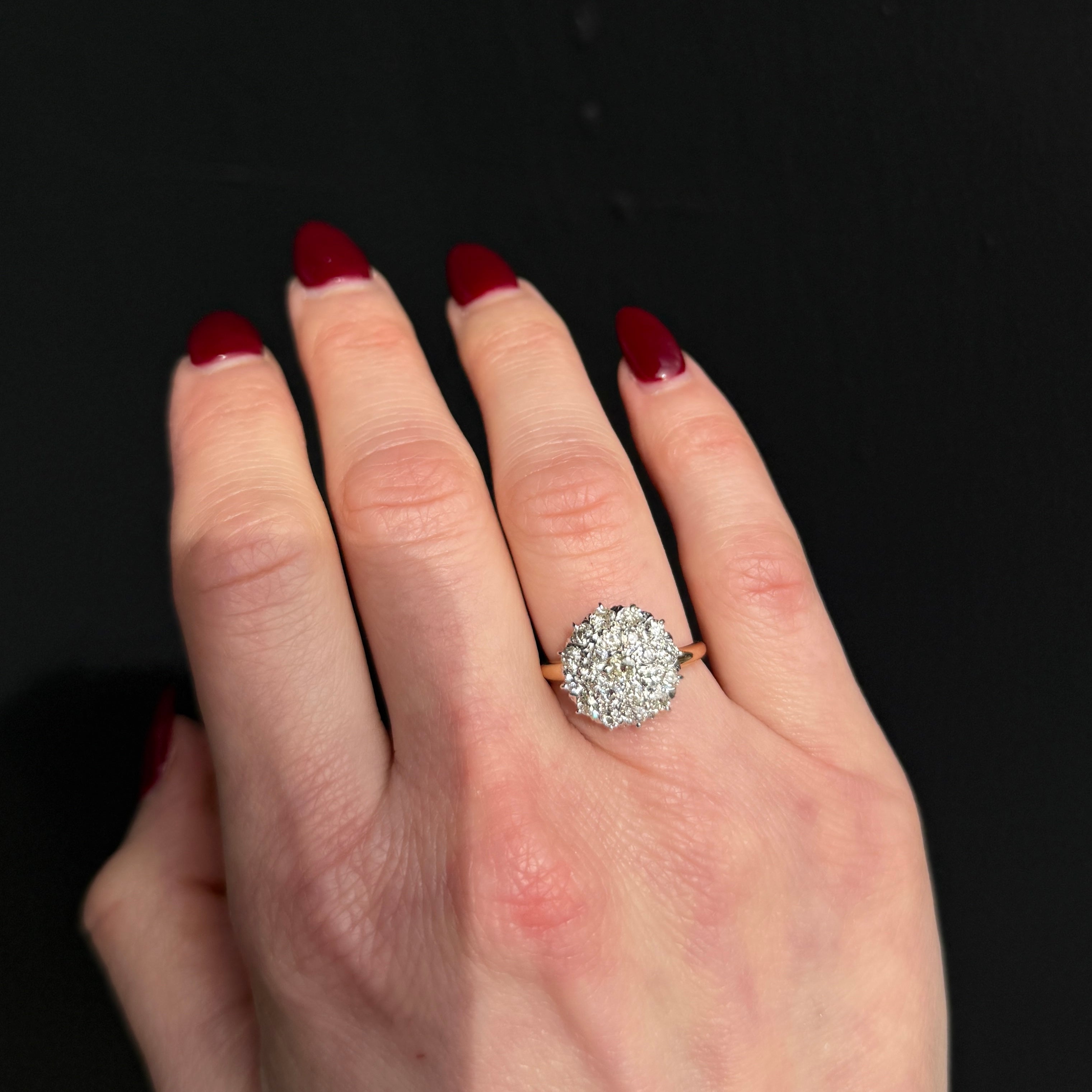 Edwardian 14K gold and diamond ring. A clustered arrangement of 21 Old Mine cut diamonds comes together to form this Edwardian ring, and creating a softly shimmering presence on the finger. Beautifully balanced and substantial on the finger, the ring reflects the refined elegance and two-toned style favored during the Edwardian era.